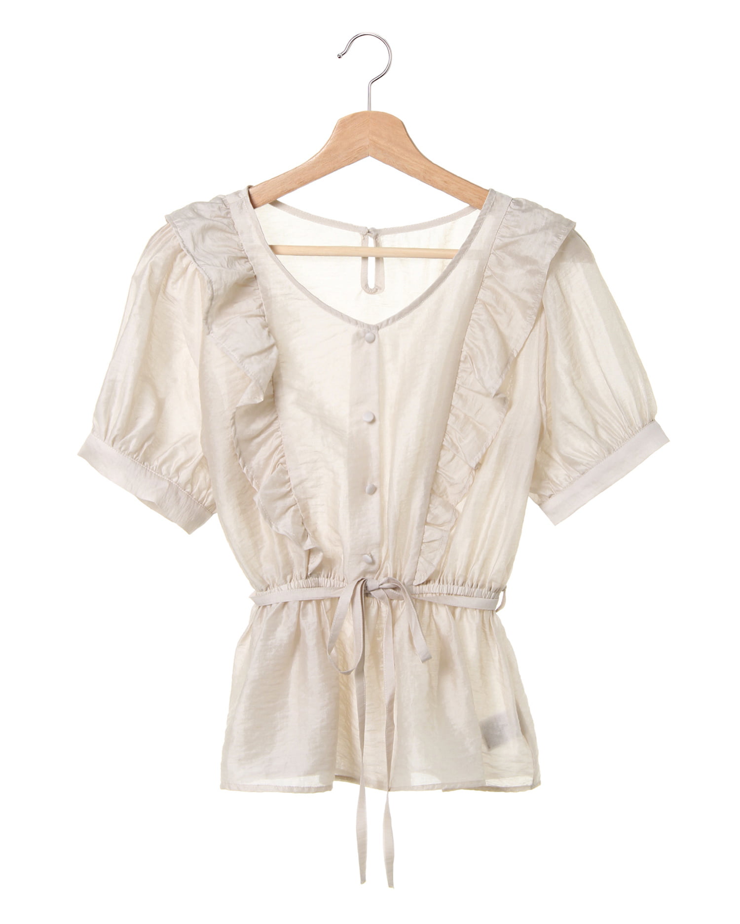 ほんのり光沢のある生地で仕立てたブラウスはショルダー部分にあしらったフリルがフェミニン。広めに開いたVネックが顔周りをすっきり見せてくれます。ゆったりめの身頃で着心地も快適。フロントの飾りボタンがアクセントになっています。バスト下にはゴムを入れているのでメリハリのあるシルエットで着られるのも◎。取り外し可能なドロスト付きです。
