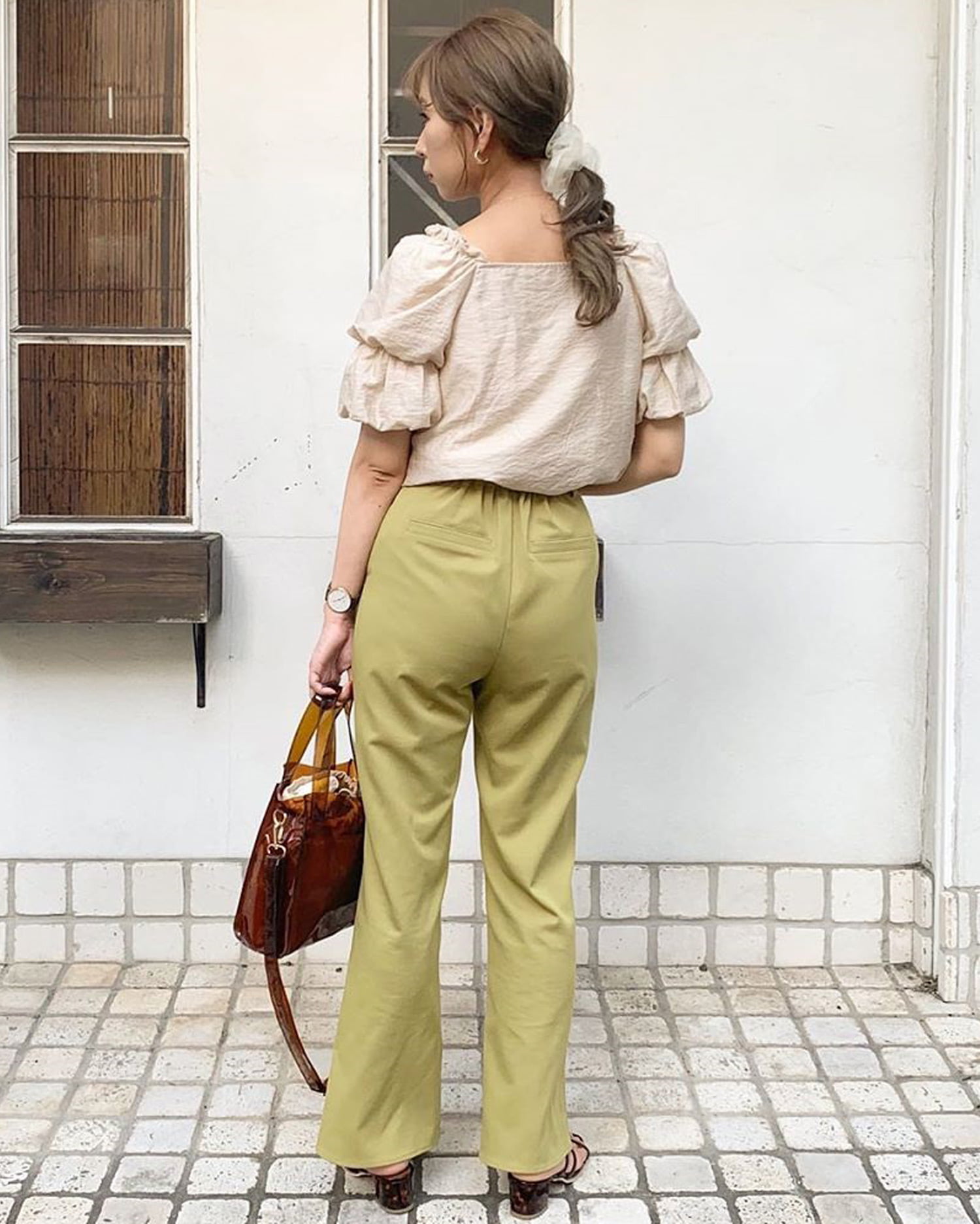 ほんのり光沢のある生地が上品なブラウスはオンオフ問わずに大活躍。ボリュームたっぷりの2段パフスリーブがフェミニンな雰囲気です。肩口にはゴム入りのフリルをあしらい、フィット感良く着られるのもポイント。すっきり開いたネックラインが顔周りを明るく彩ってくれます。前開きデザインで脱ぎ穿きも楽ちんな優秀アイテムです。