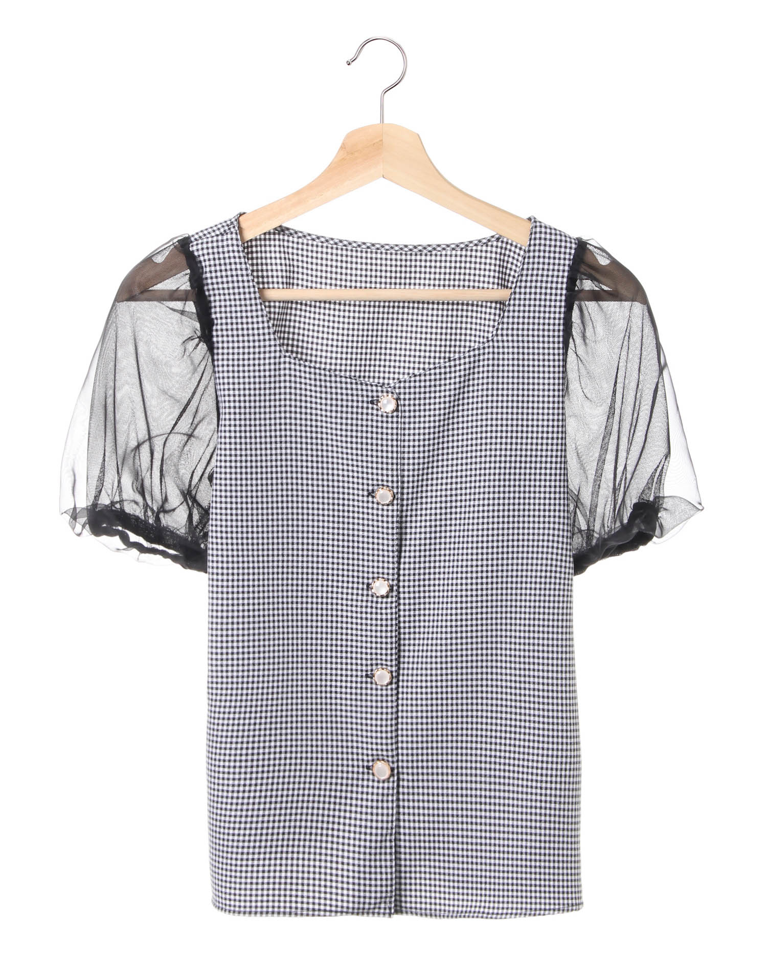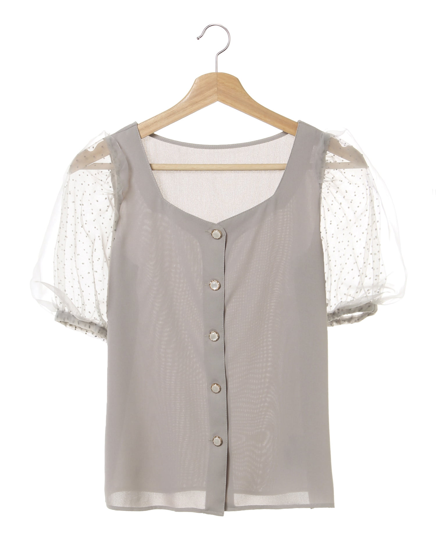 ふんわりとしたボリュームスリーブがキュートなブラウス。チュールとオーガンジーを重ねることで表情のあるデザインになっています。フロントにはエレガントなボタンをあしらってアクセントに。フロントボタンは開閉可能なので脱ぎ着も楽ちんです。やわらかな身頃は肌触りも良く着心地も快適。コーディネイトの主役になるアイテムです。
