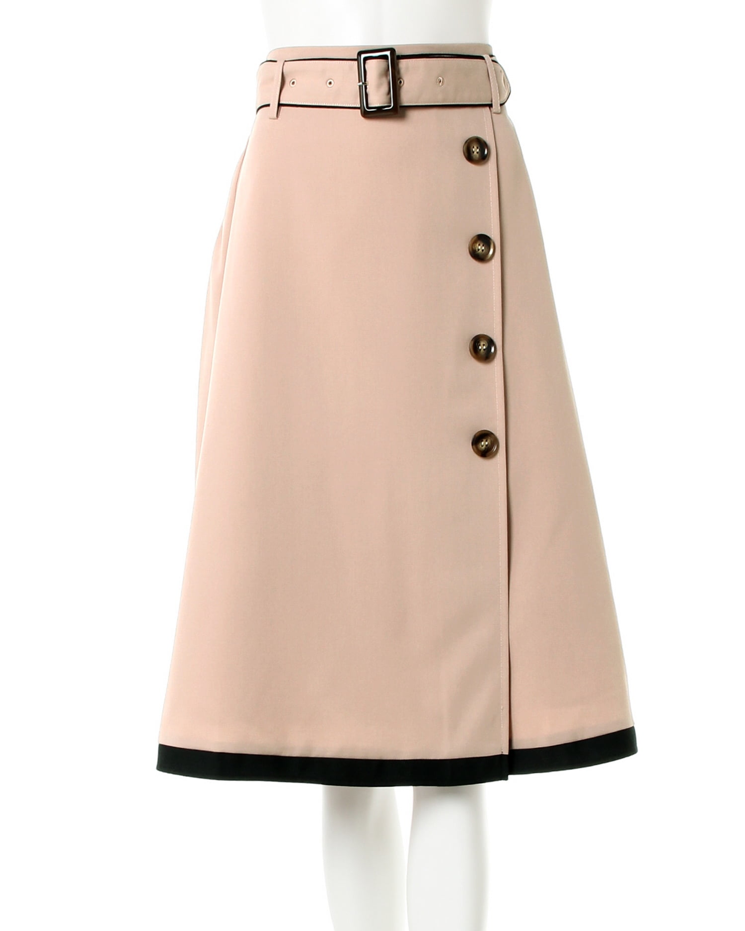 カジュアルにもきれいめにも着回せるミディ丈のスカートはバイカラーの配色デザインが魅力。きちんと感があるのでブラウスなどを合わせてオフィスシーンでも活躍します。バックウエストはゴムになっているので脱ぎ穿きも楽チン。フロントのラップ風デザインで表情のある着こなしが叶います。ボタンは縫い付けてあるのではだける心配がないのも◎。スクエアバックルの共布ベルト付きです。