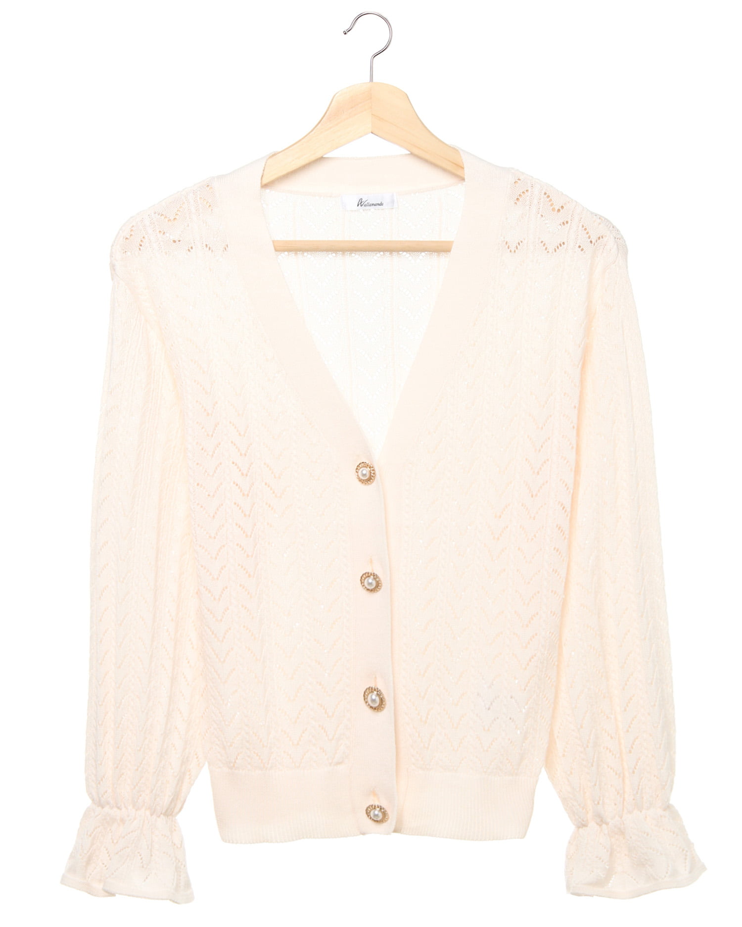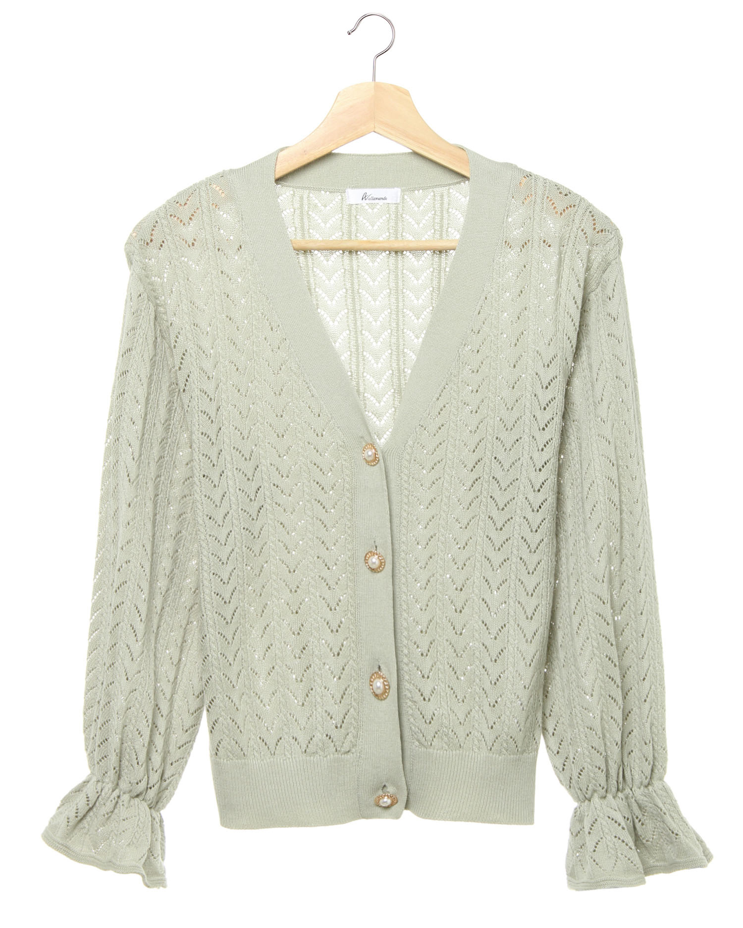 合わせるアイテムやほんのり透ける肌とのコントラストが楽しめる透かし編みカーディガンです。柔らかい肌触りの薄手のニットがナチュラルなスタイルにピッタリの1枚。袖のフレアデザインやキレイカラーが女性らしい着こなしを叶えます。小顔効果も狙えるすっきりと開いたVネックとショート丈でバランス良く合わせられるのも魅力。フロントのレトロな雰囲気のパール装飾ボタンがアクセントになっています。