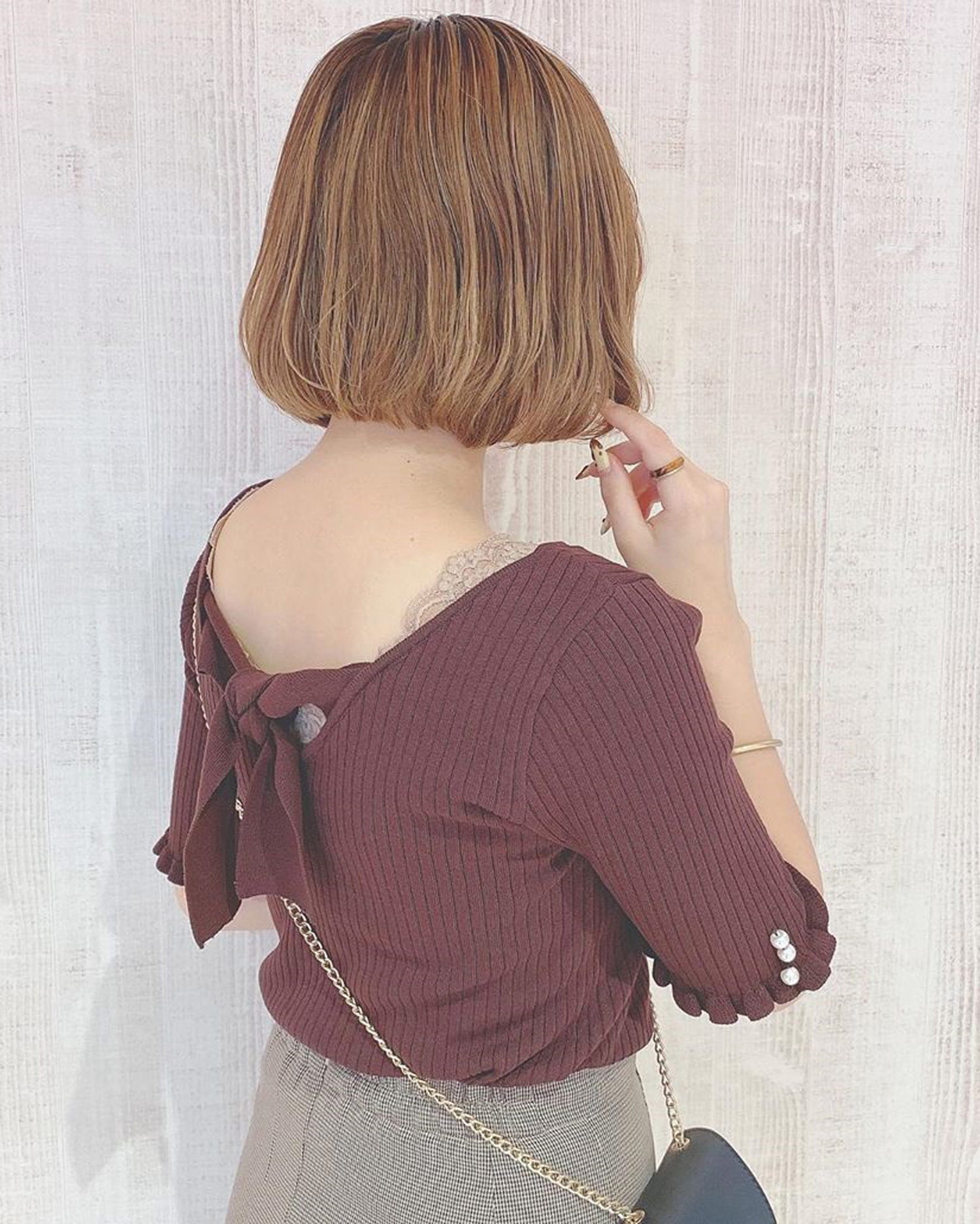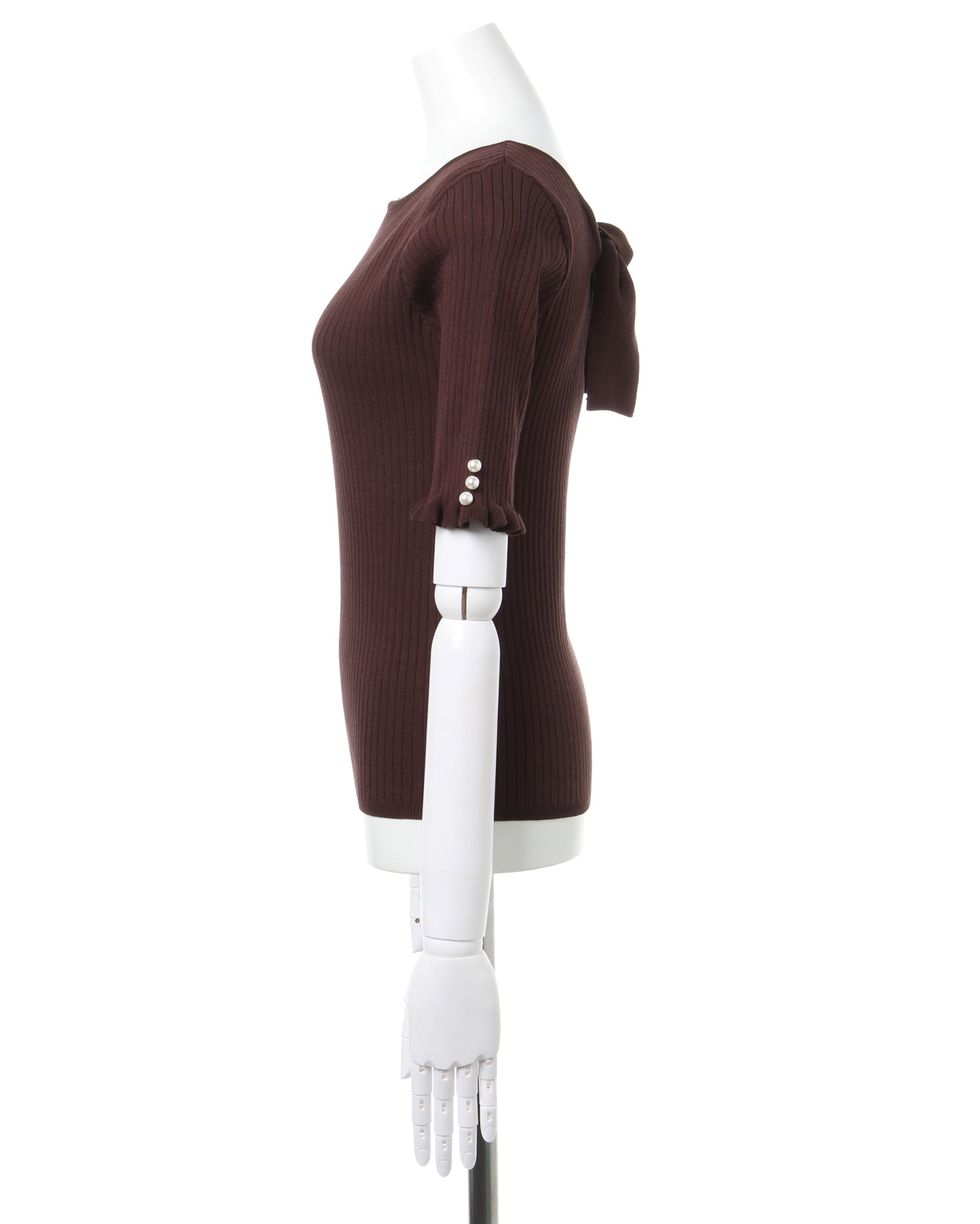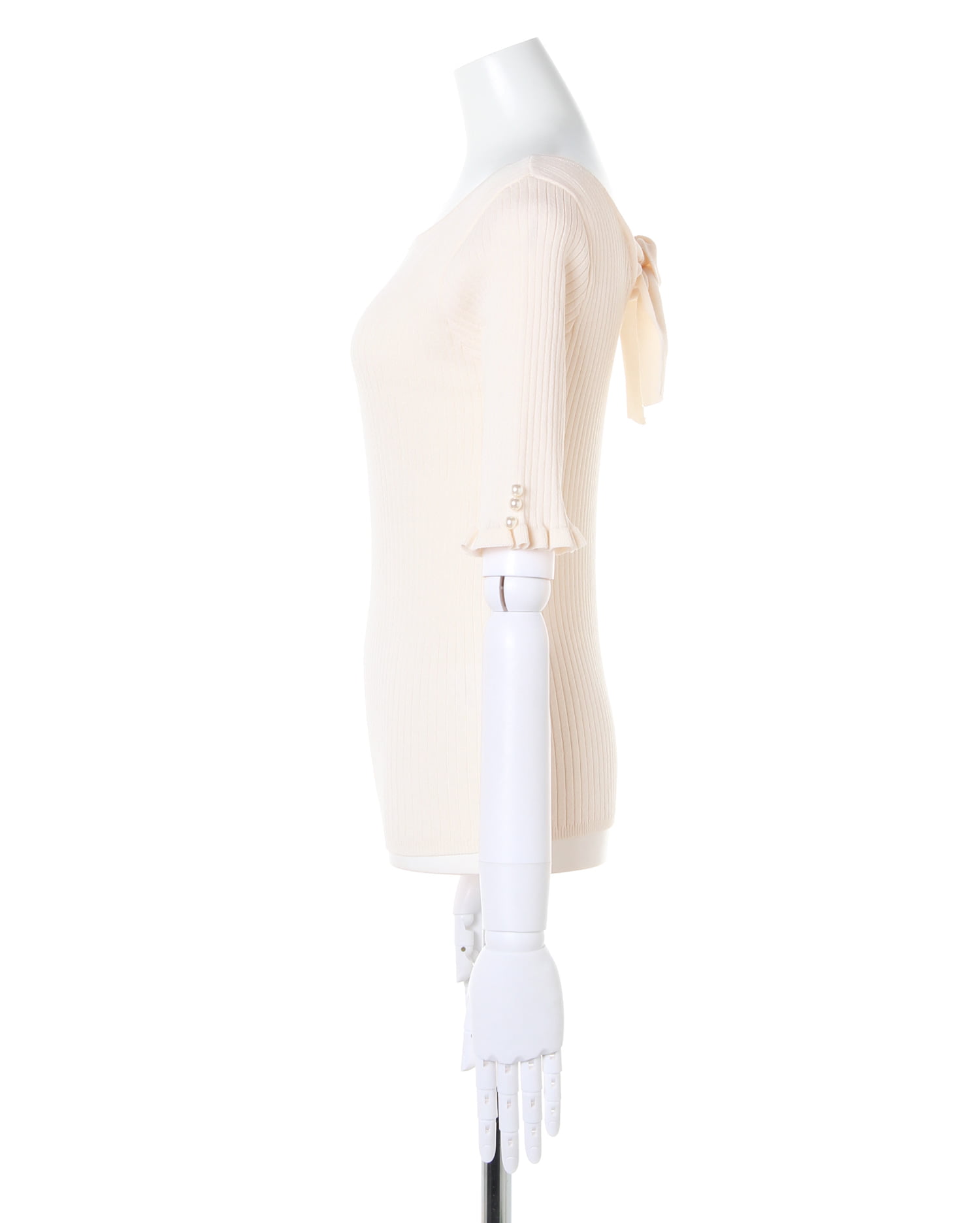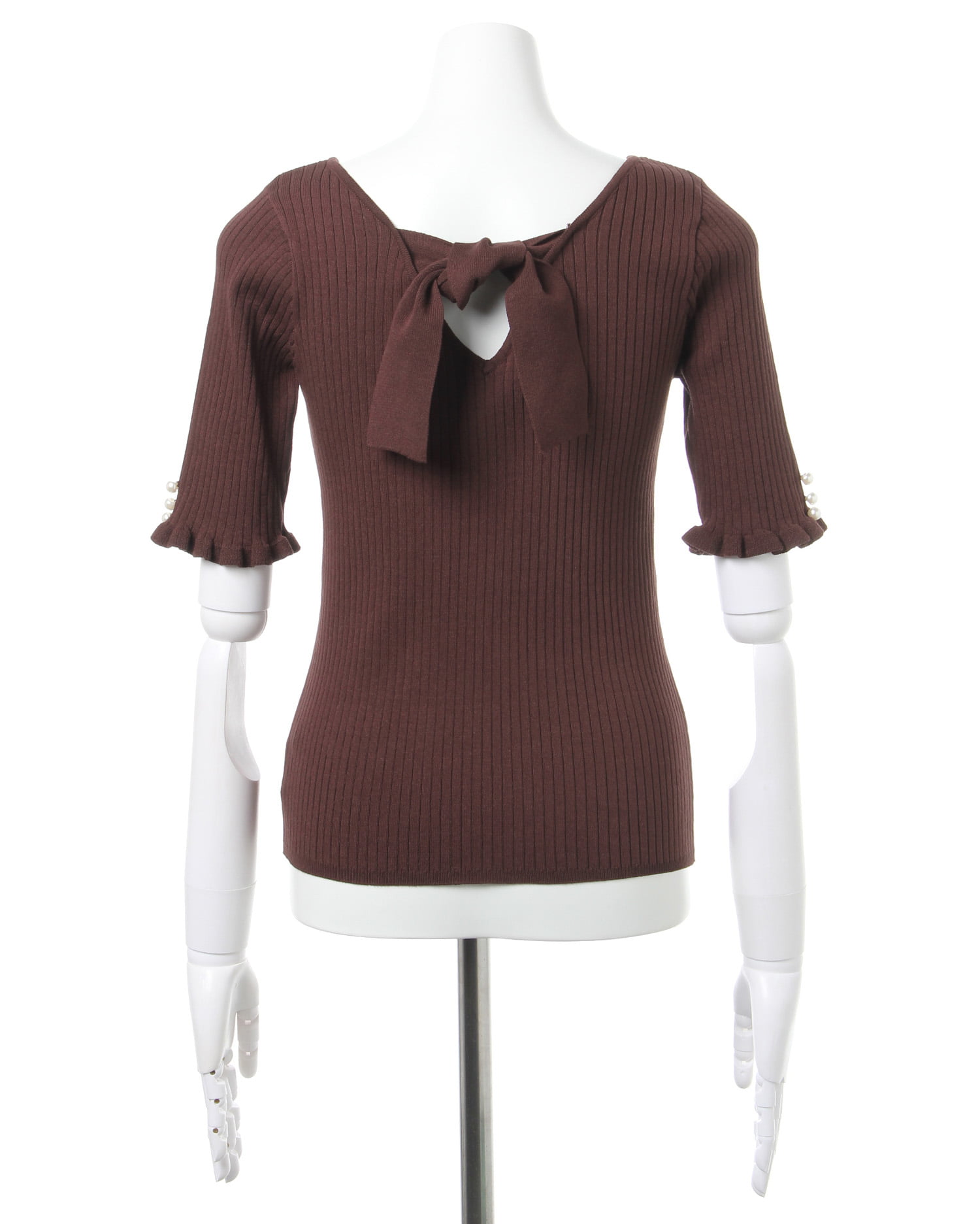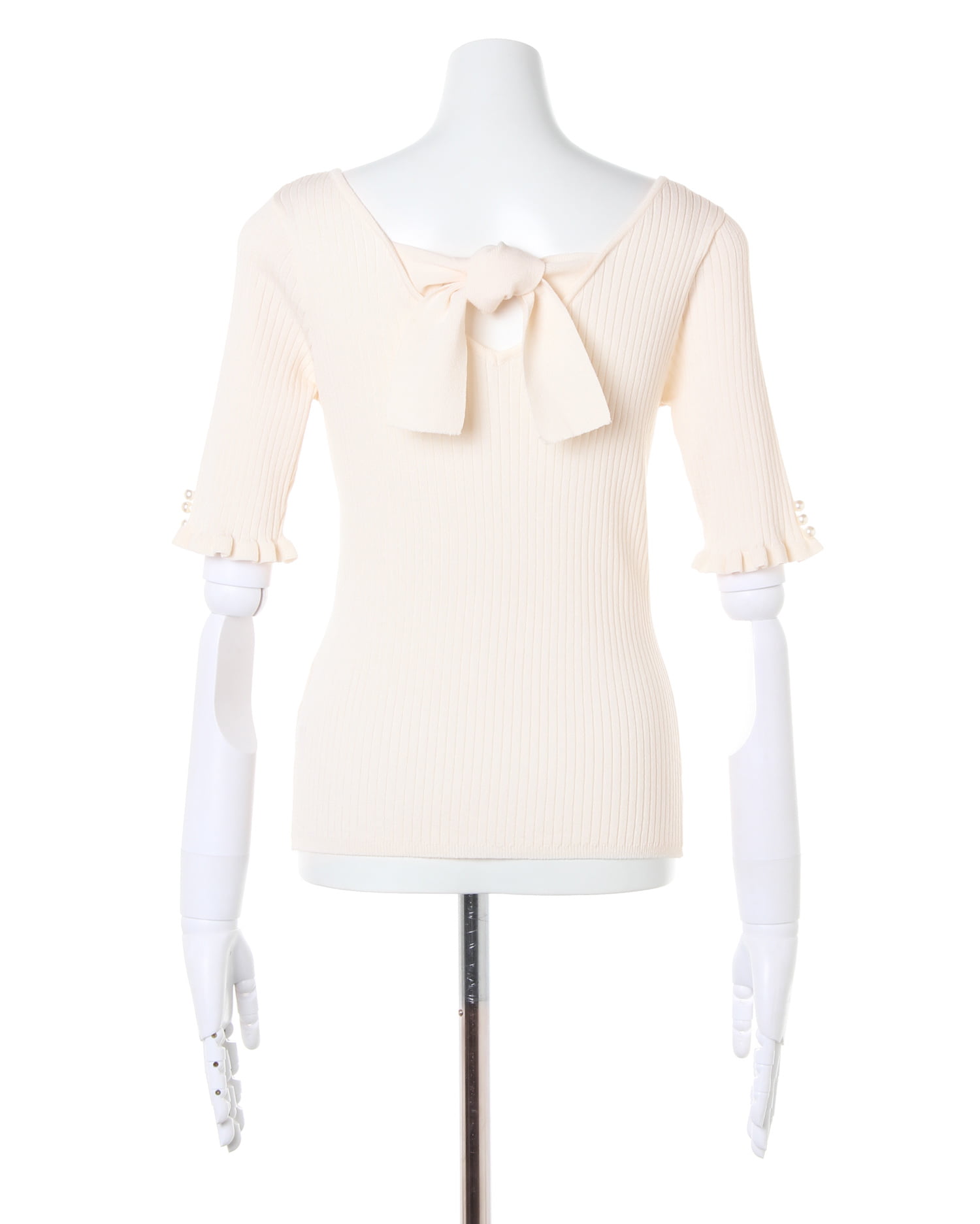 シンプルなニットトップスは後ろのリボンでレディライクに。ボディラインに沿うタイトなシルエットでスタイルアップを狙えます。上品な印象に仕上げているのでオンオフ問わずに着回せるのもポイント。広めのネックラインが顔周りをすっきり明るく彩ってくれます。ジャケットやブルゾンのインにもシーズン長く着回せるのでワードローブに追加決定です。