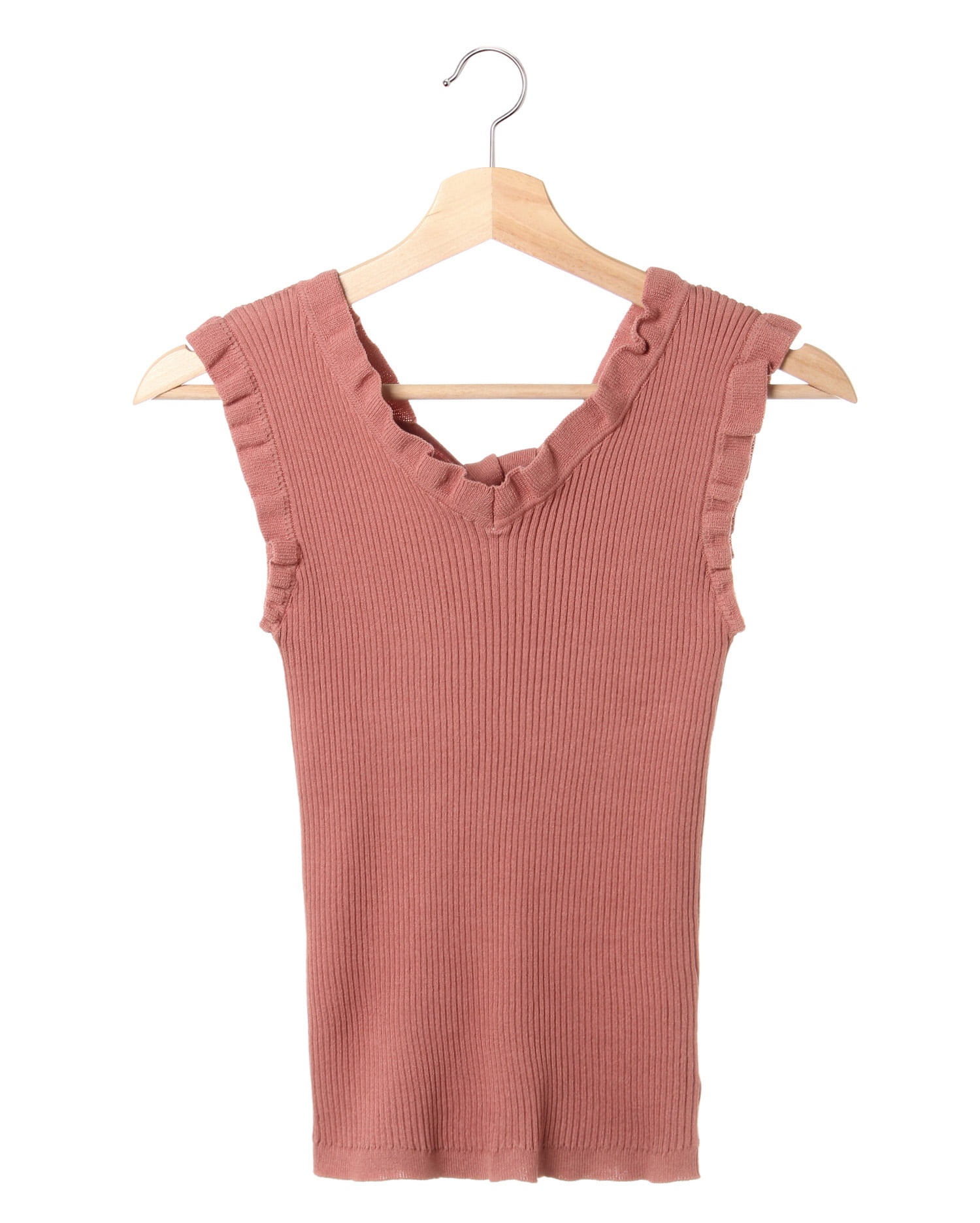 1枚でレディな着こなしが叶うノースリーブのニットトップス。襟元と袖口のフリルがフェミニンなアクセントになっています。程よいハリ感を持たせた生地がボディラインに沿いスタイルアップを実現。キュートな後ろリボンもポイントです。程よい裾丈でトップスインスタイルもすっきりキマります。豊富なカラーバリエーションで何枚も揃えたくなるアイテムです。