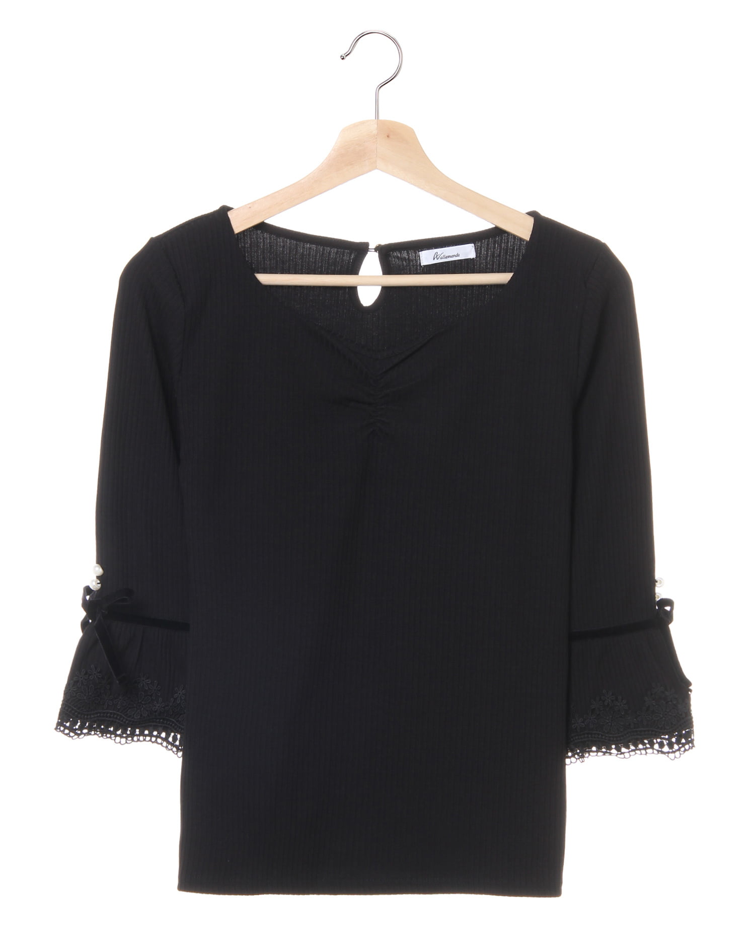 デコルテラインを華奢に演出してくれるハートネックのリブトップス。伸縮性のある素材で着心地も快適です。きちんと感のあるアイテムなのでデイリー使いはもちろん、オフィスシーンにもおすすめ。ふわりと広がるフレアスリーブでクラシカル&フェミニンな雰囲気に仕立てています。レースをあしらった袖口にはパールビジューとリボンでアクセントをプラス。