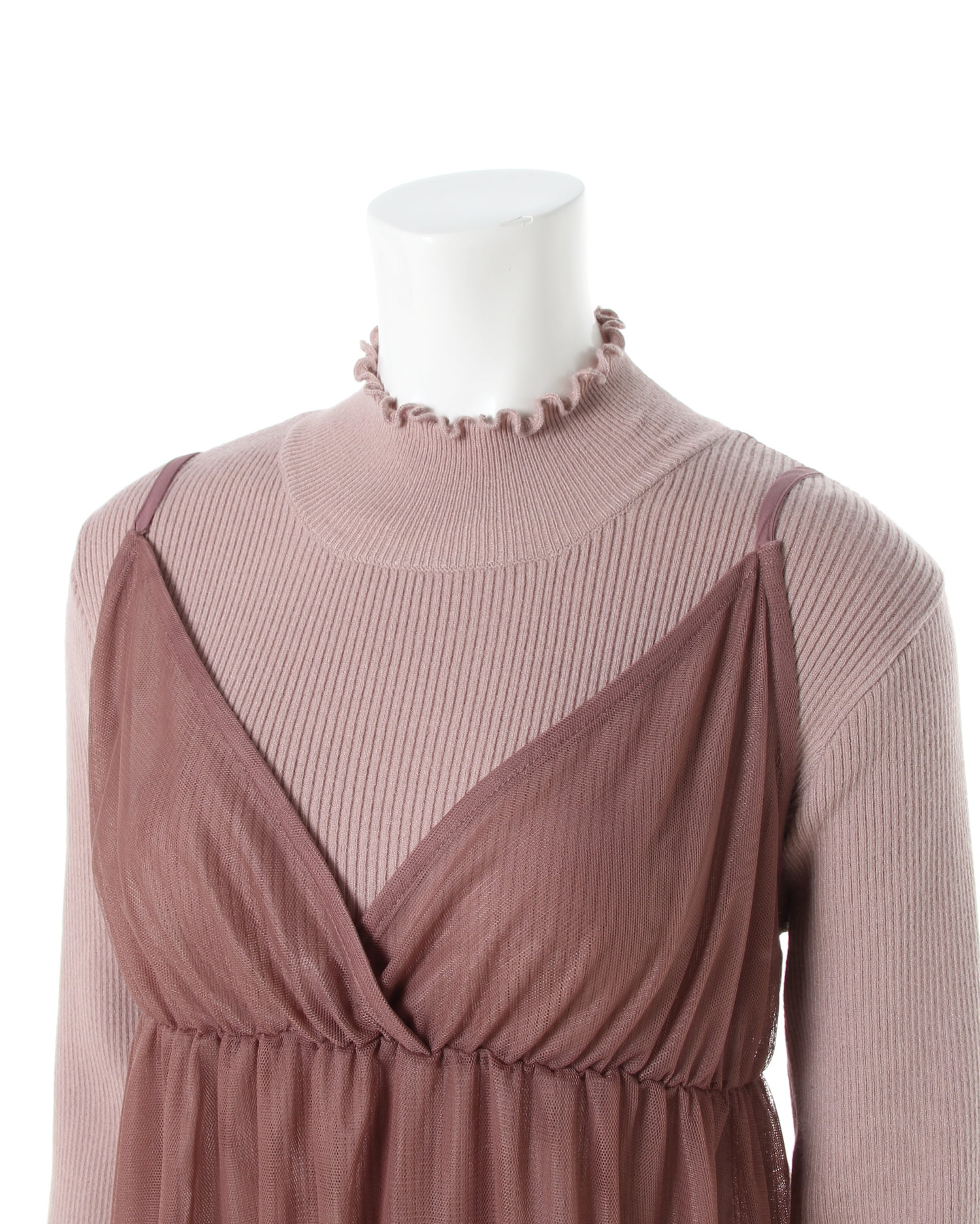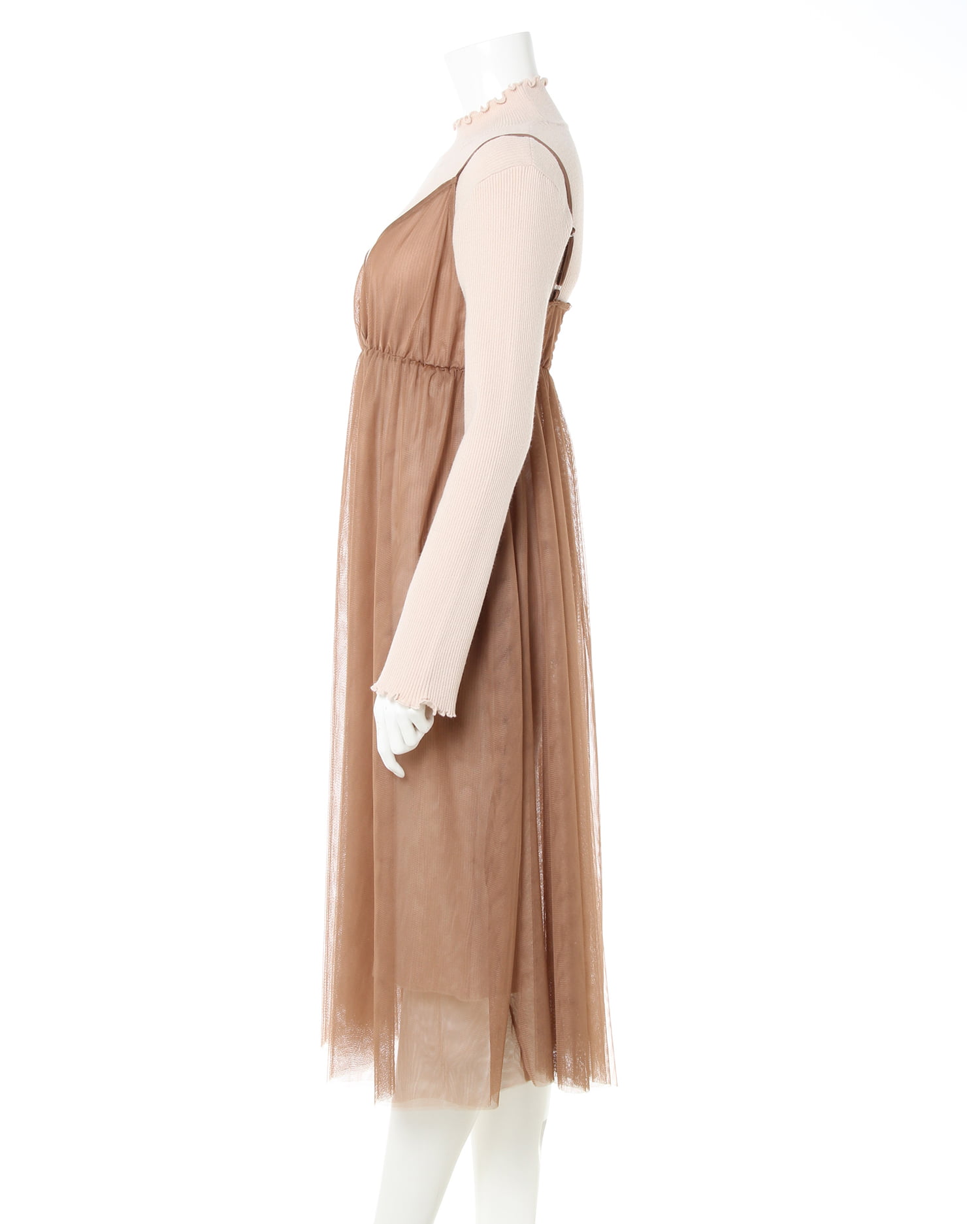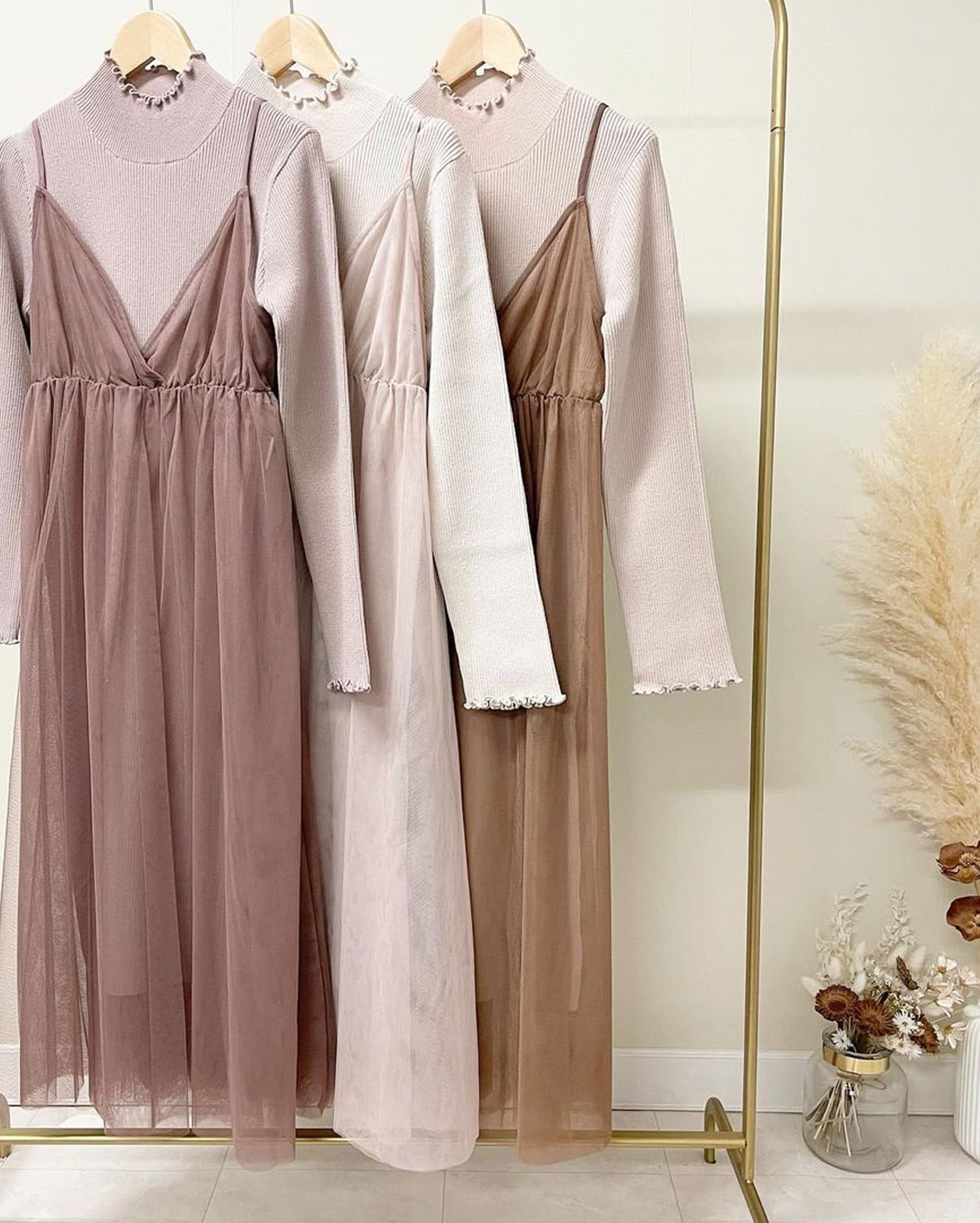 セットで好バランスのレイヤードスタイルが完成するニットワンピとチュールワンピのセット。ニットワンピはボディラインに沿うIシルエットでスタイルアップを狙えます。やわらかなニットは着心地も◎。シンプルなワンカラーに首元のメロウデザインがアクセントになっています。チュールワンピースはバスト下にゴムを入れ、裾へ向かって広がるシルエットが魅力。大人っぽいニュアンスカラーが揃っています。
