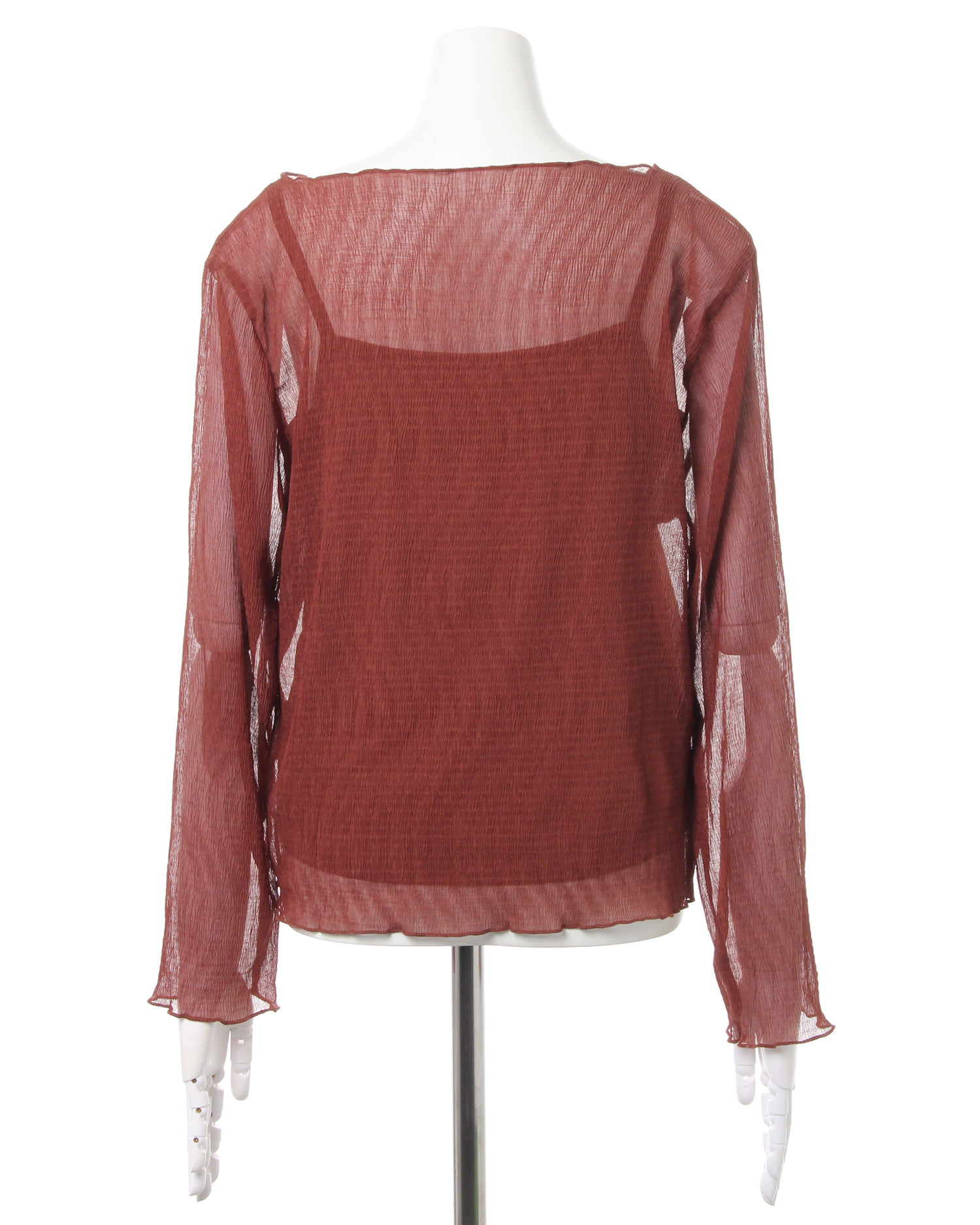 表面感のあるさらりとした素材のシアートップスとシンプルなキャミソールのセット。落ち着いた印象に仕上げているので大人っぽく着られます。トップスは首元や袖口のひらりとしたメロウデザインがアクセントに。ボディラインに沿うコンパクトなシルエットでスタイルアップも狙えます。同系色のキャミソールがセットになっているので計算ずくのレイヤードスタイルが完成。