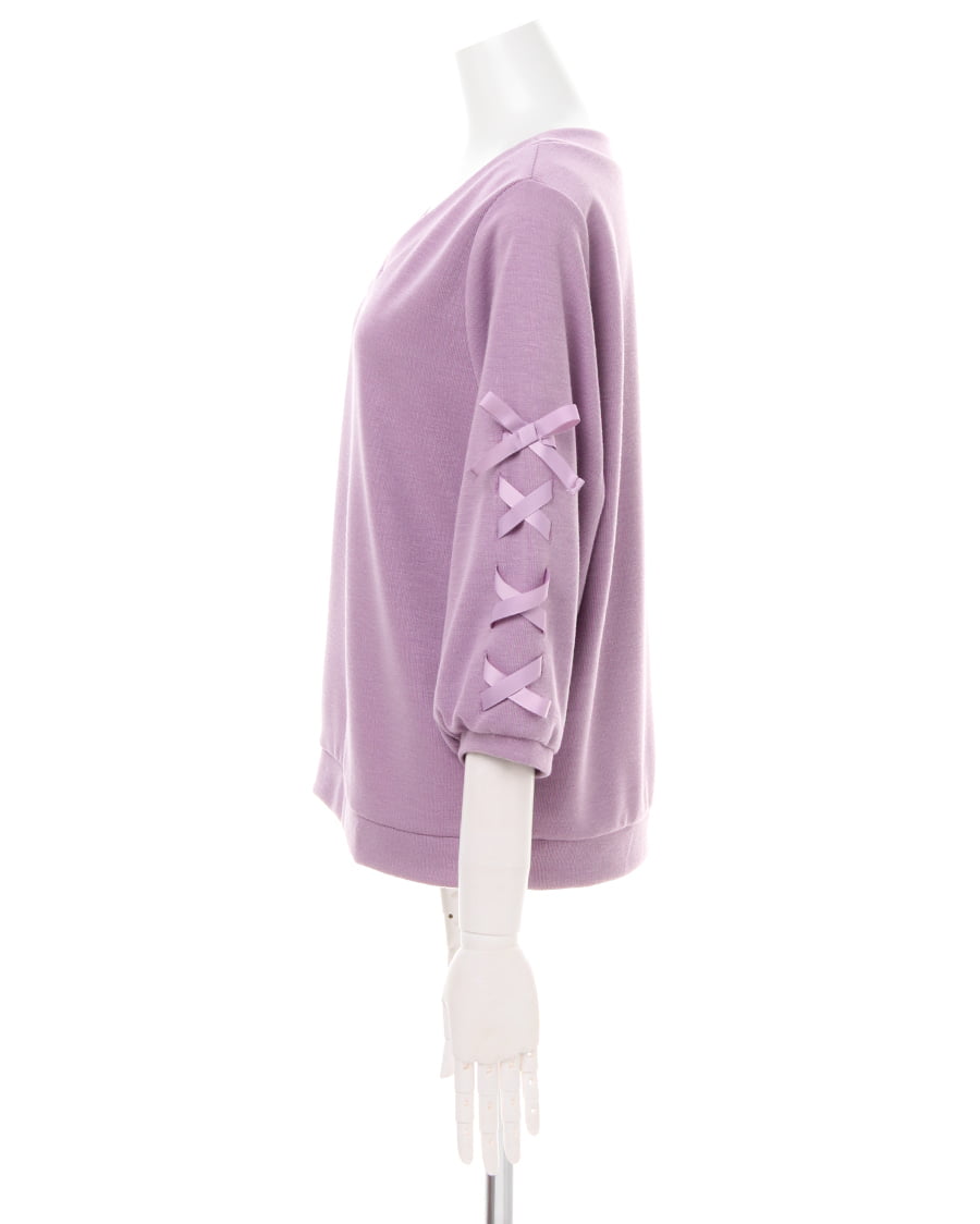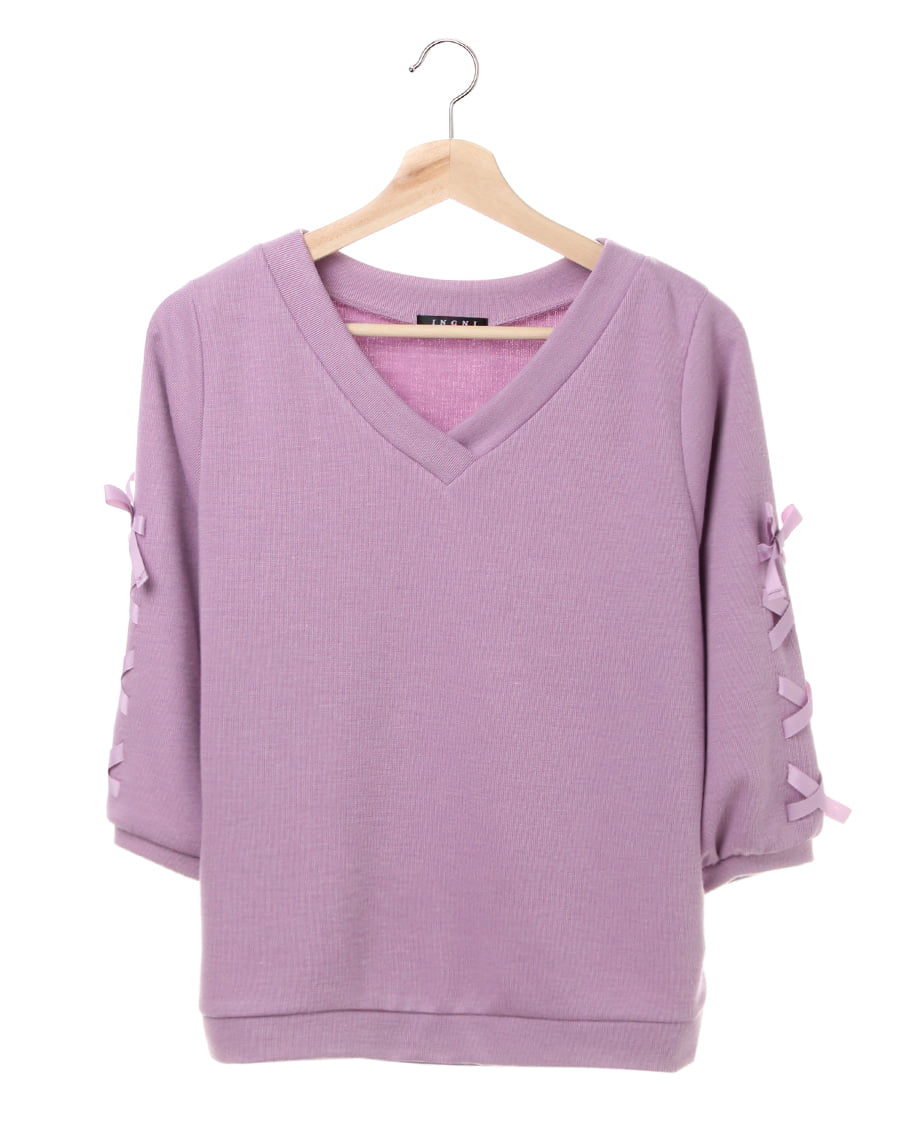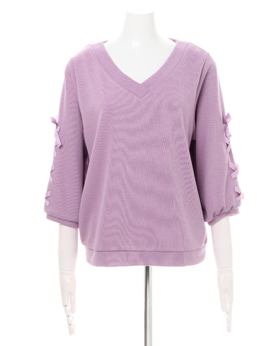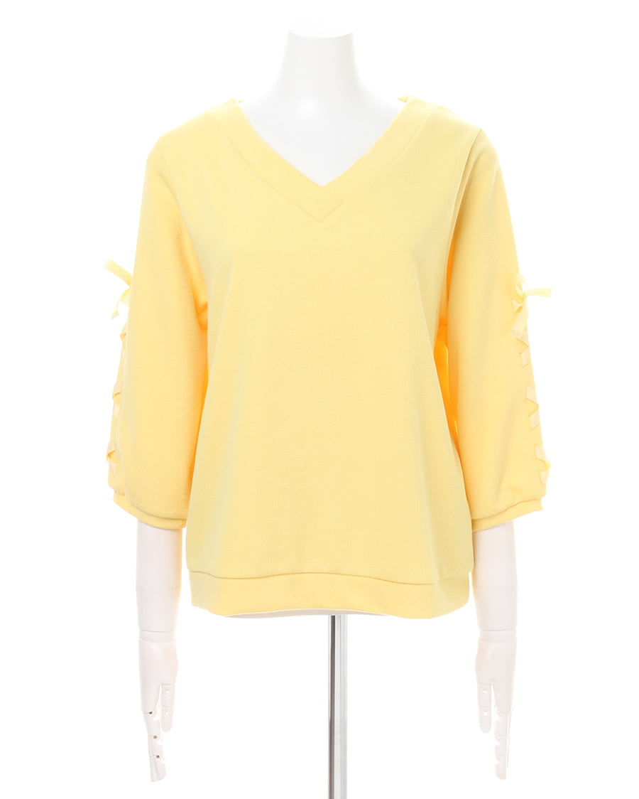 今年らしいボリュームのあるシルエットが魅力のトップス。ゆったりめの身頃とすっきり感のあるVネックはインナーを合わせても◎。ハリ感のある素材はさらりとした肌触りで快適な着心地になっています。ワンカラーに映えるスリーブ部分のレースアップがアクセントに。光沢感のあるグログランテープが表情をプラスし上品な印象に仕上がります。