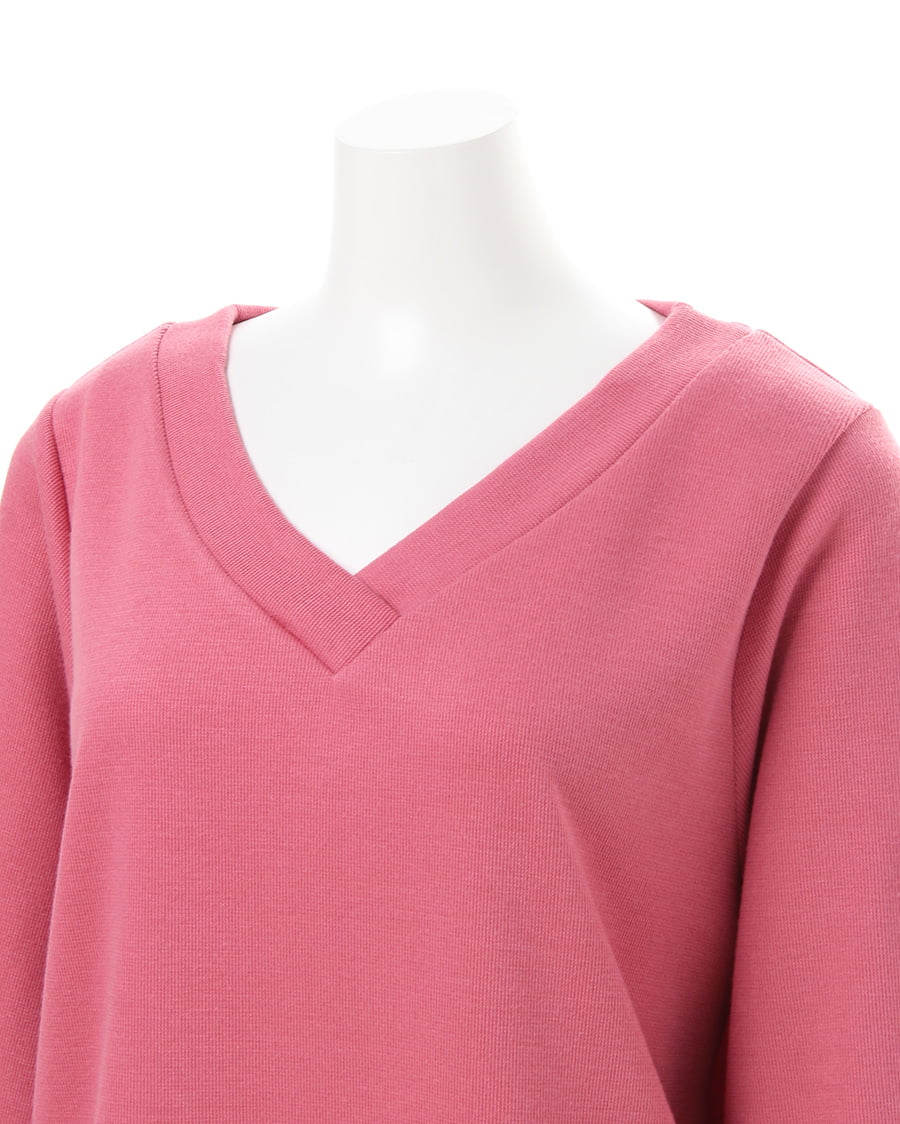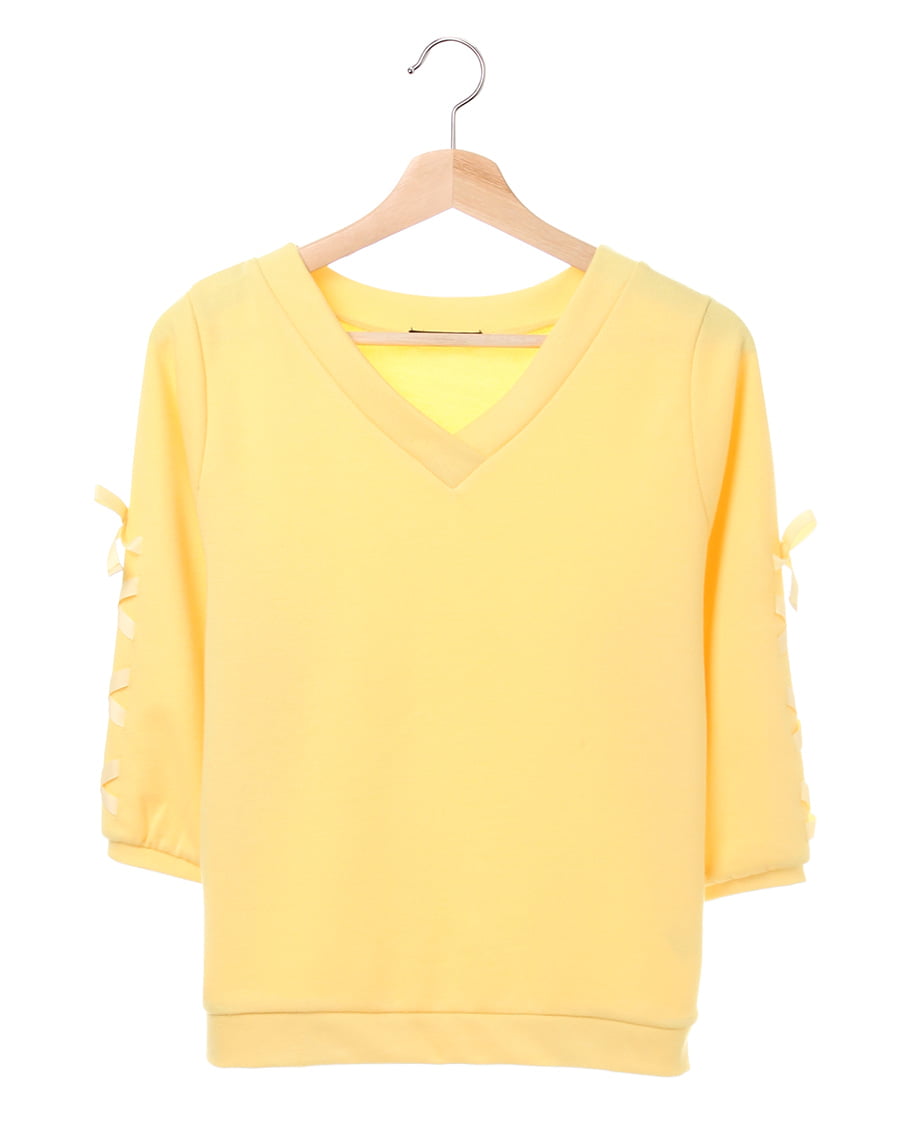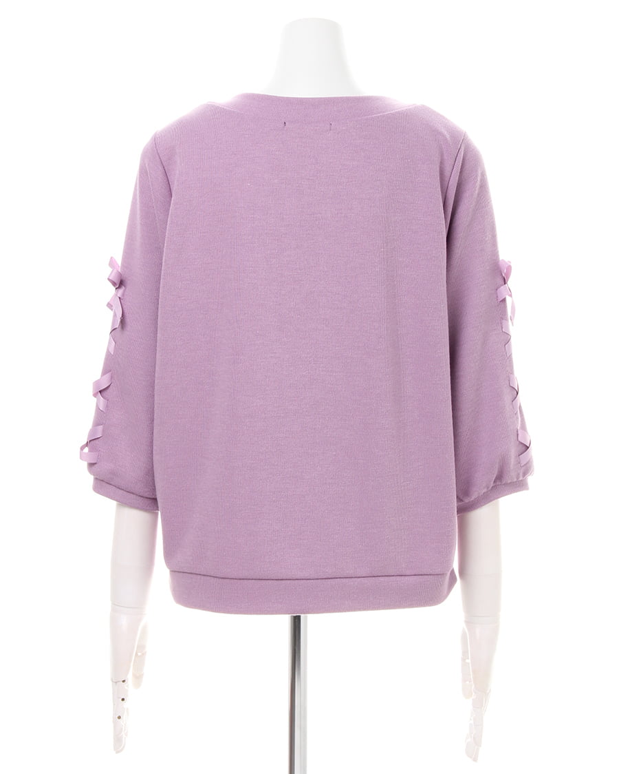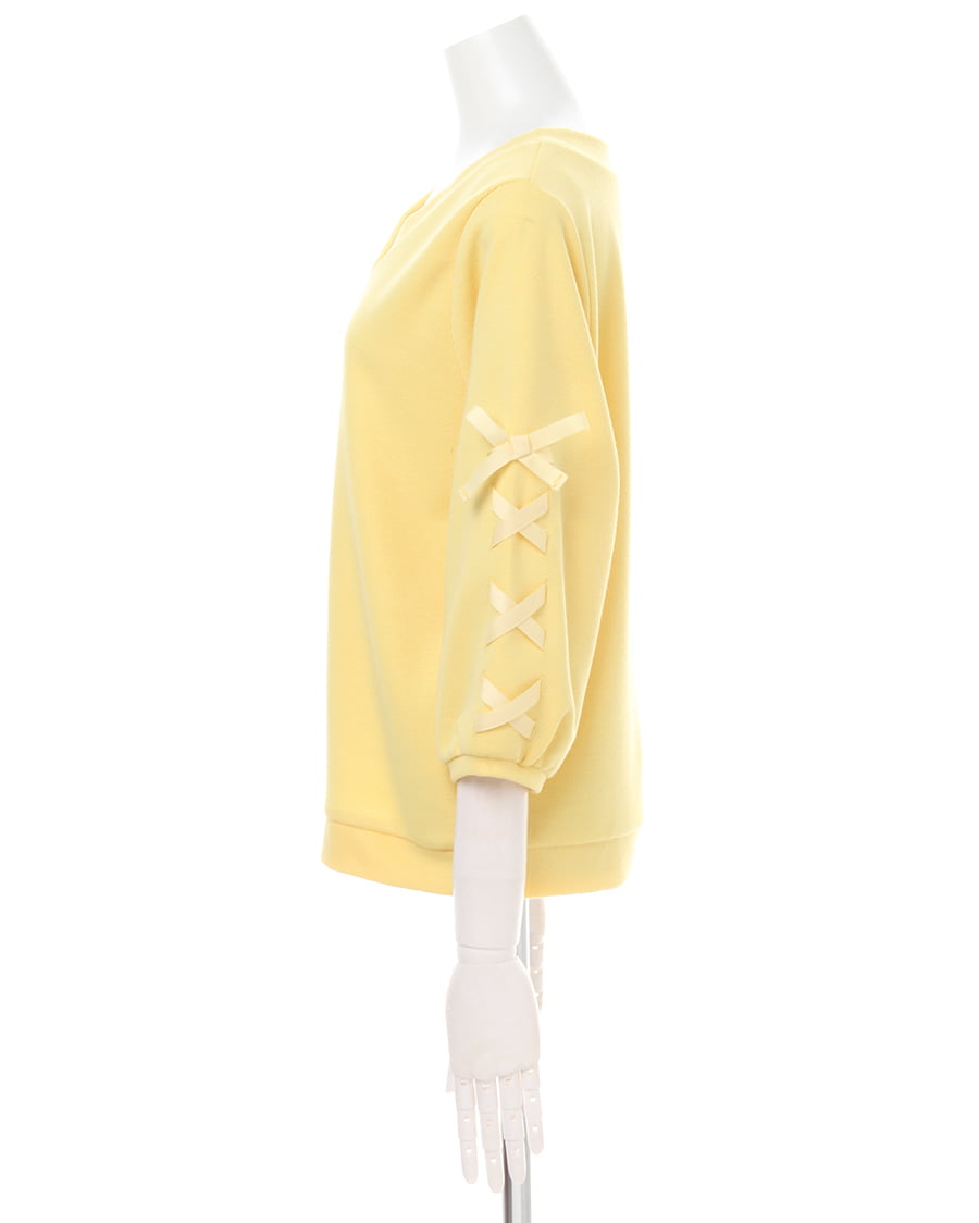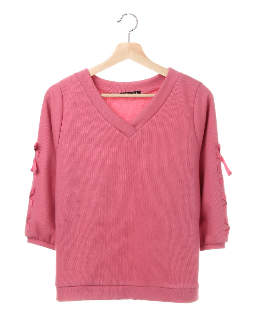 今年らしいボリュームのあるシルエットが魅力のトップス。ゆったりめの身頃とすっきり感のあるVネックはインナーを合わせても◎。ハリ感のある素材はさらりとした肌触りで快適な着心地になっています。ワンカラーに映えるスリーブ部分のレースアップがアクセントに。光沢感のあるグログランテープが表情をプラスし上品な印象に仕上がります。