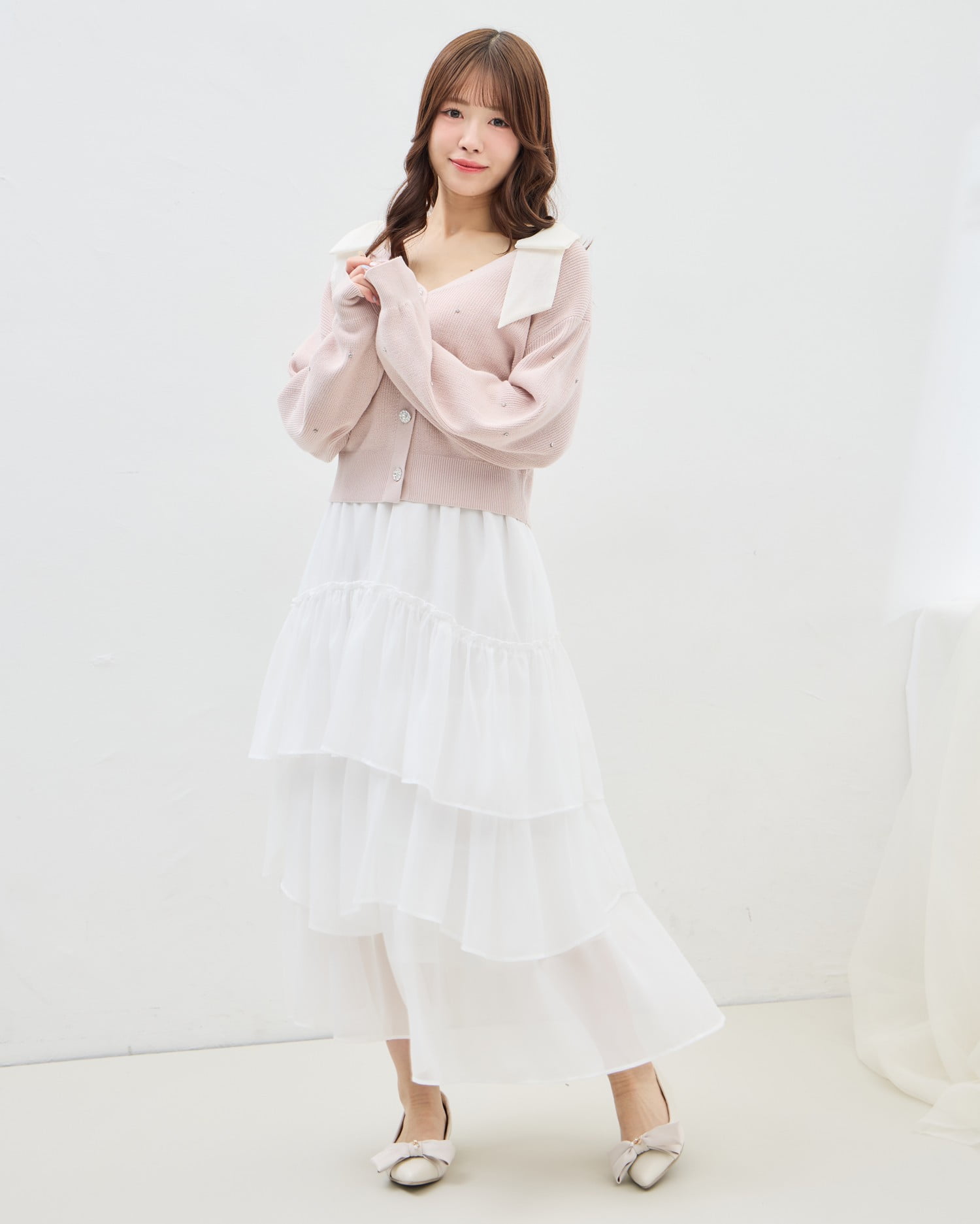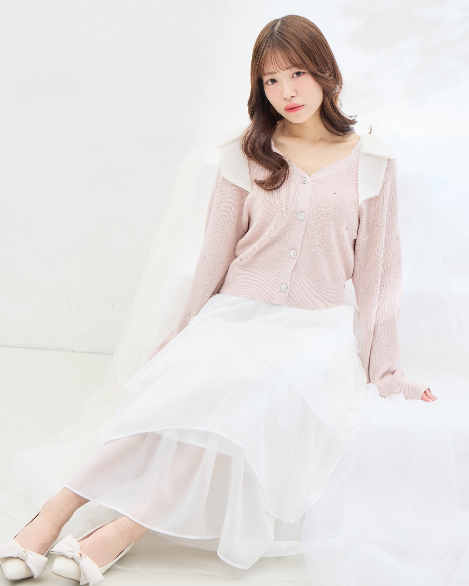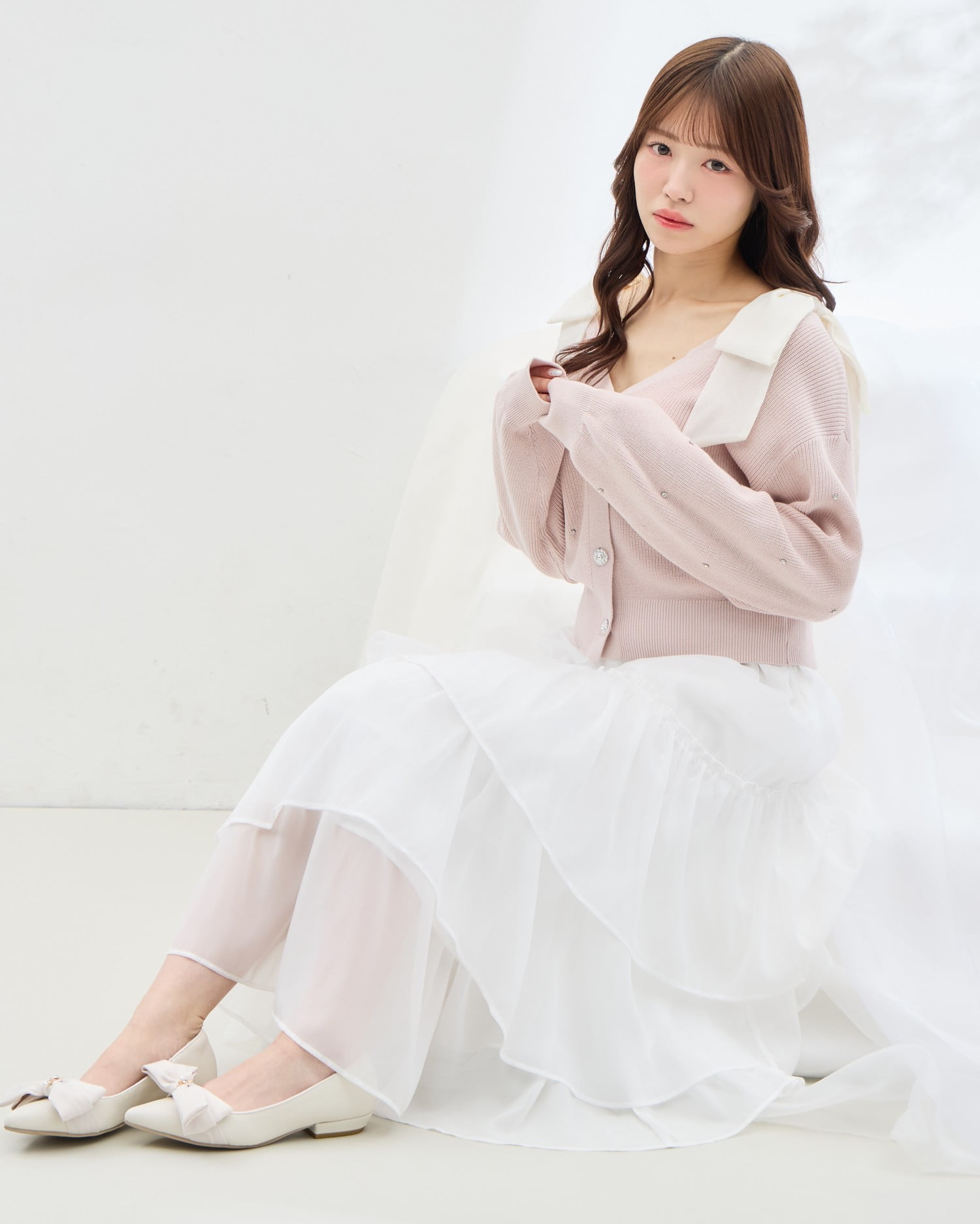 肩紐部分がリボンになっている可愛らしい印象のカーディガンです。