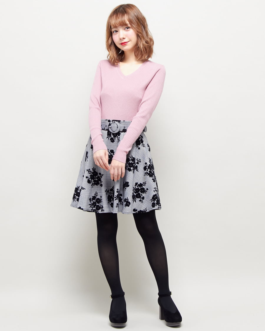 総針リブVネックニットと共ベルト付フレアスカートのSET☆