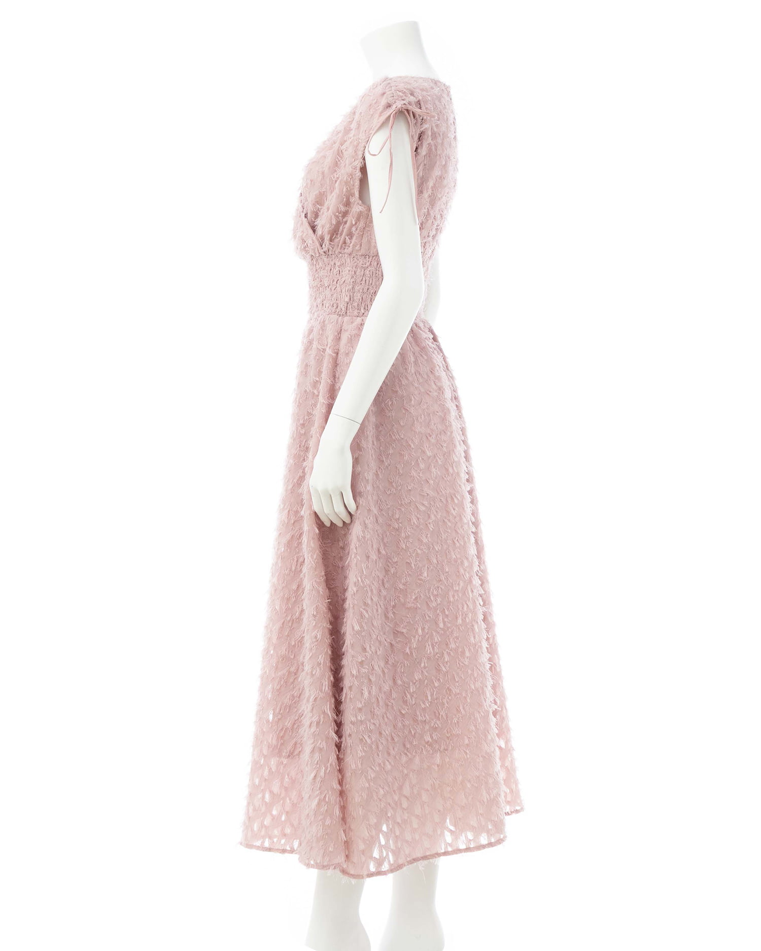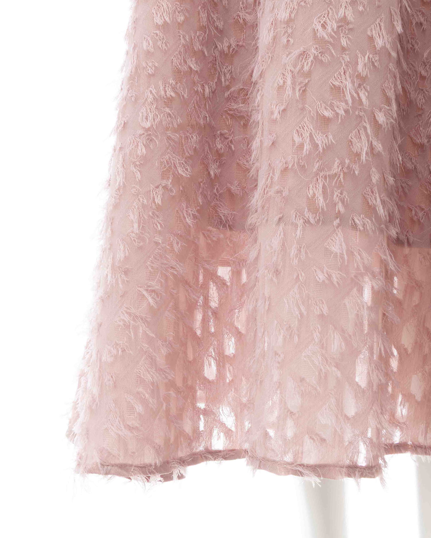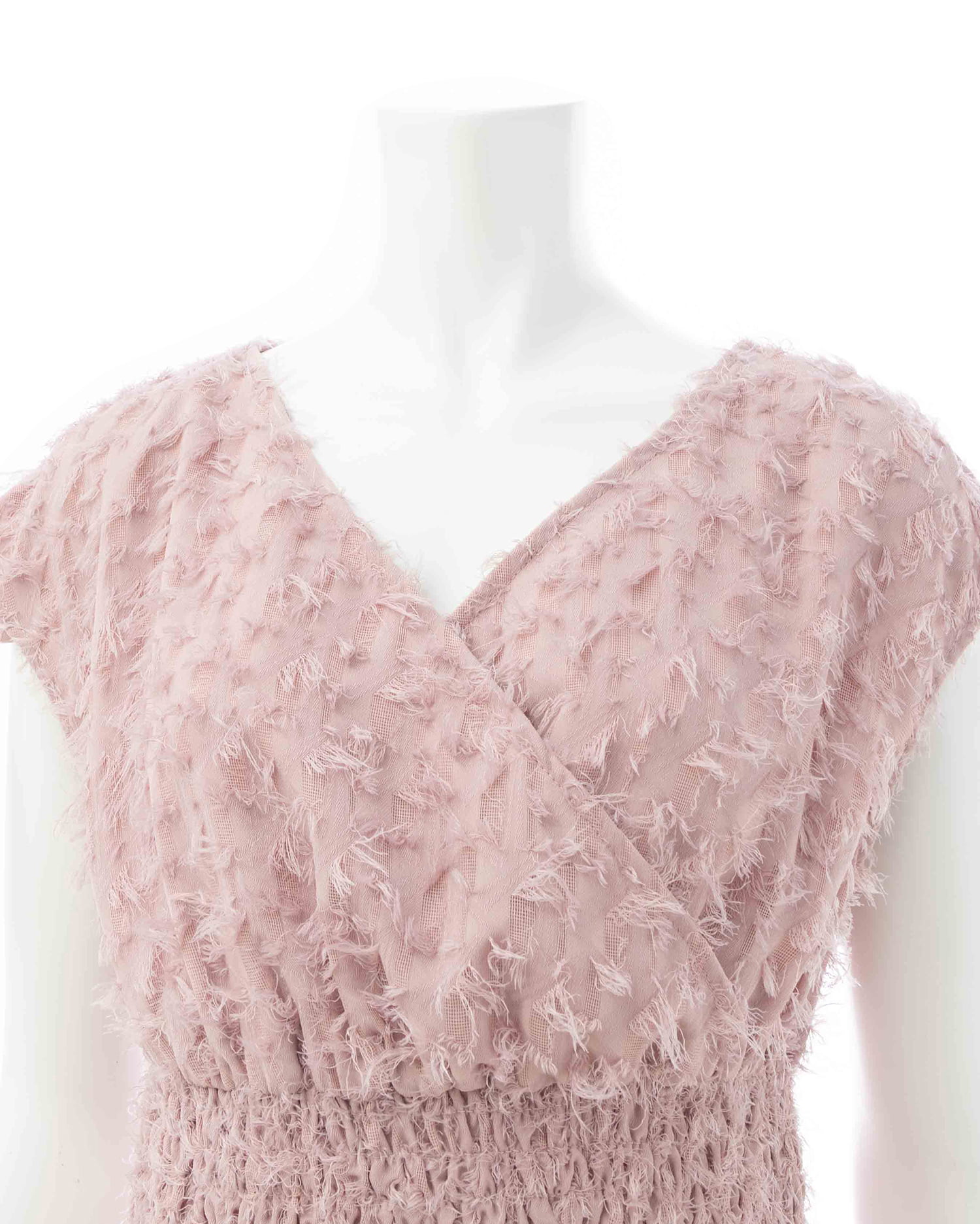 毛足の短いフリンジを使ってデザインされたカシュクールワンピース。
