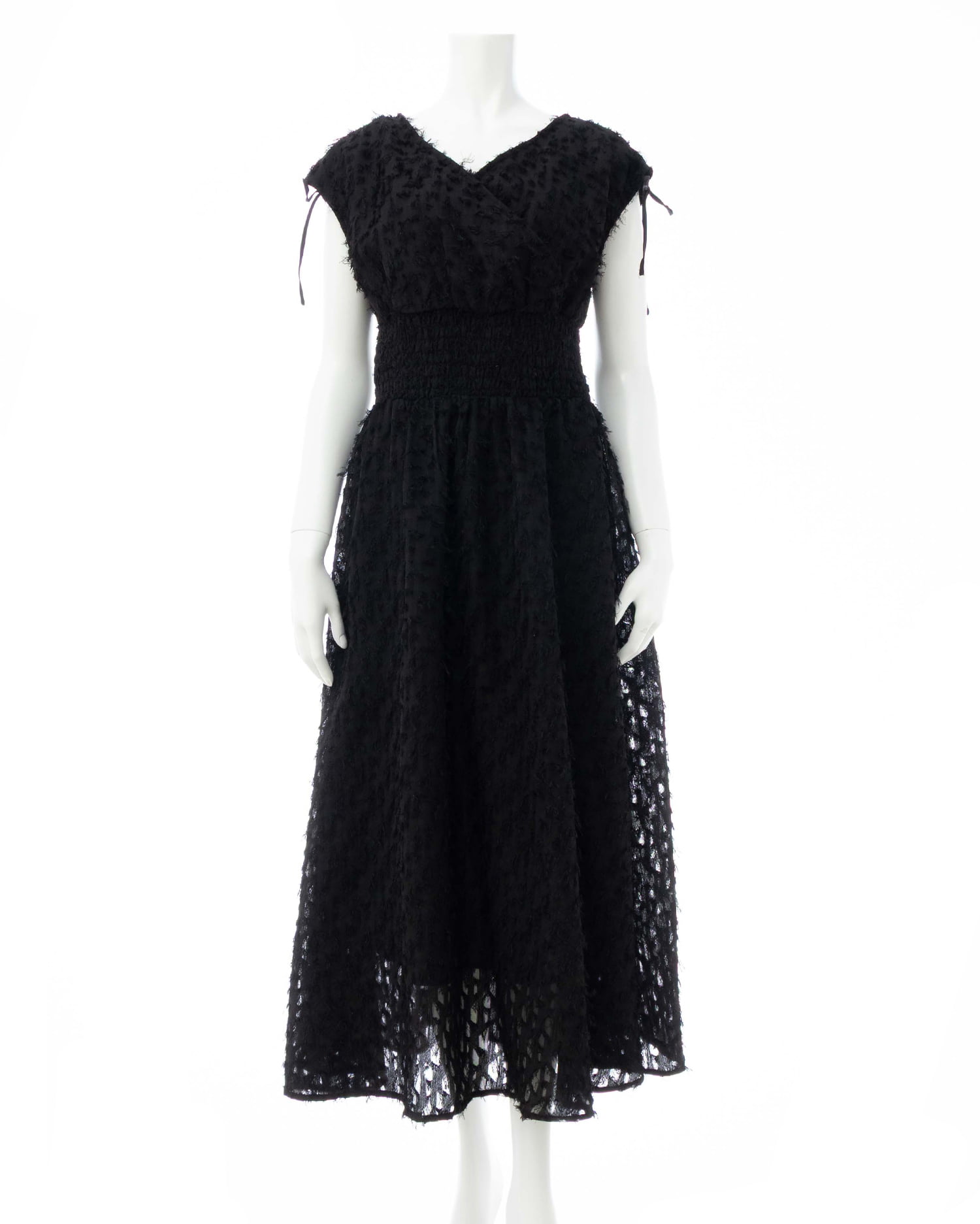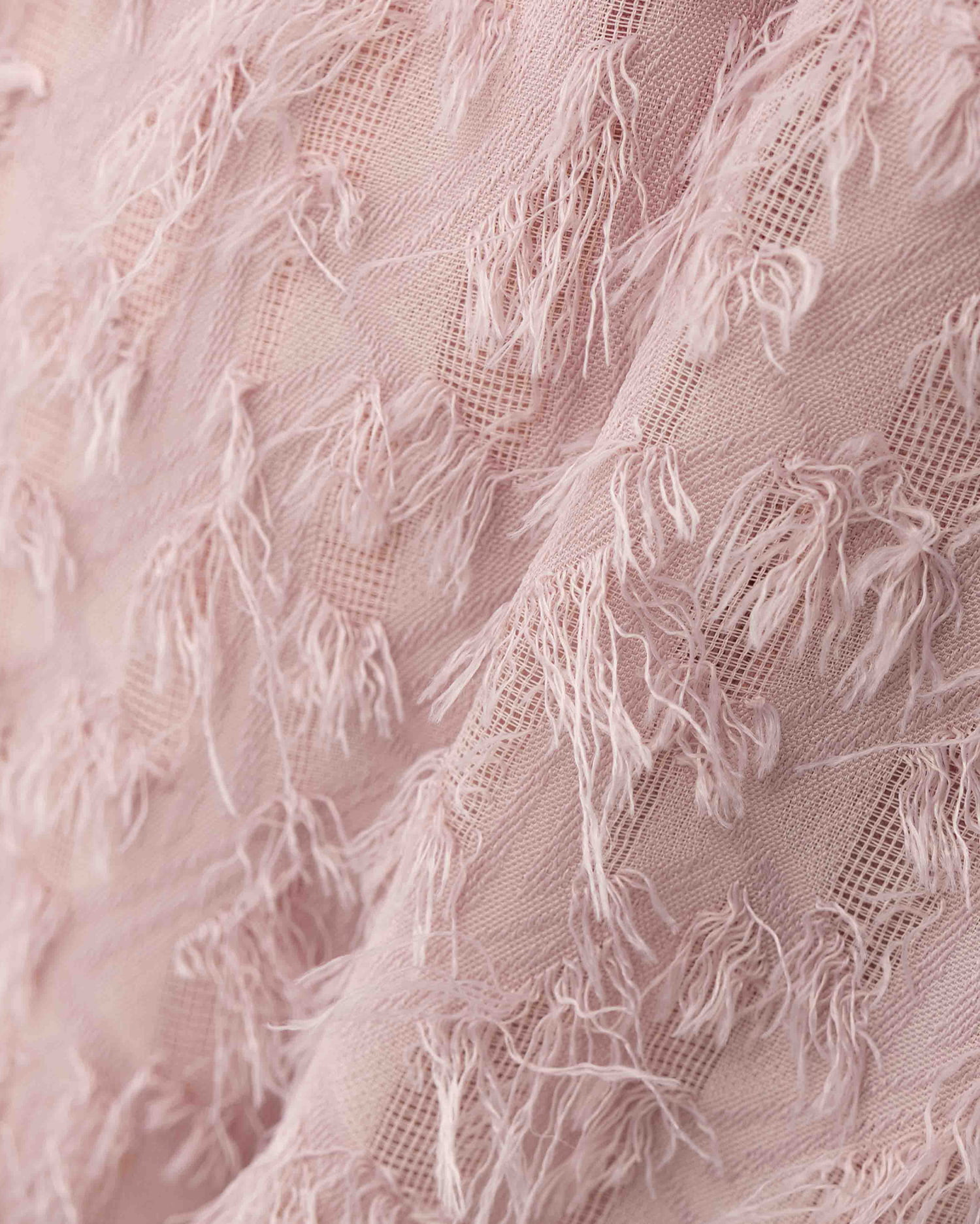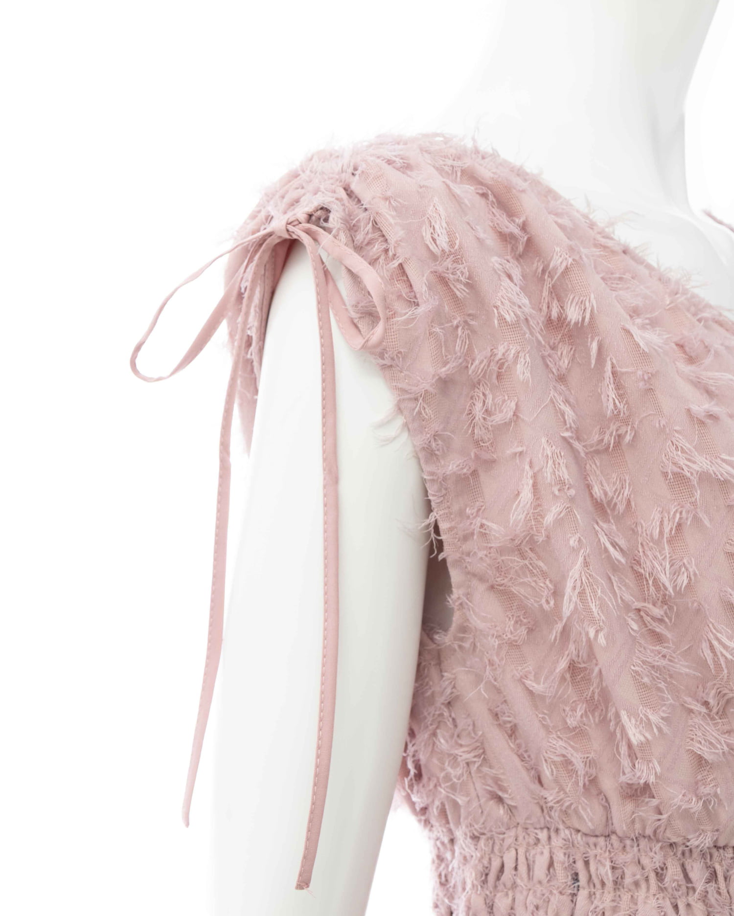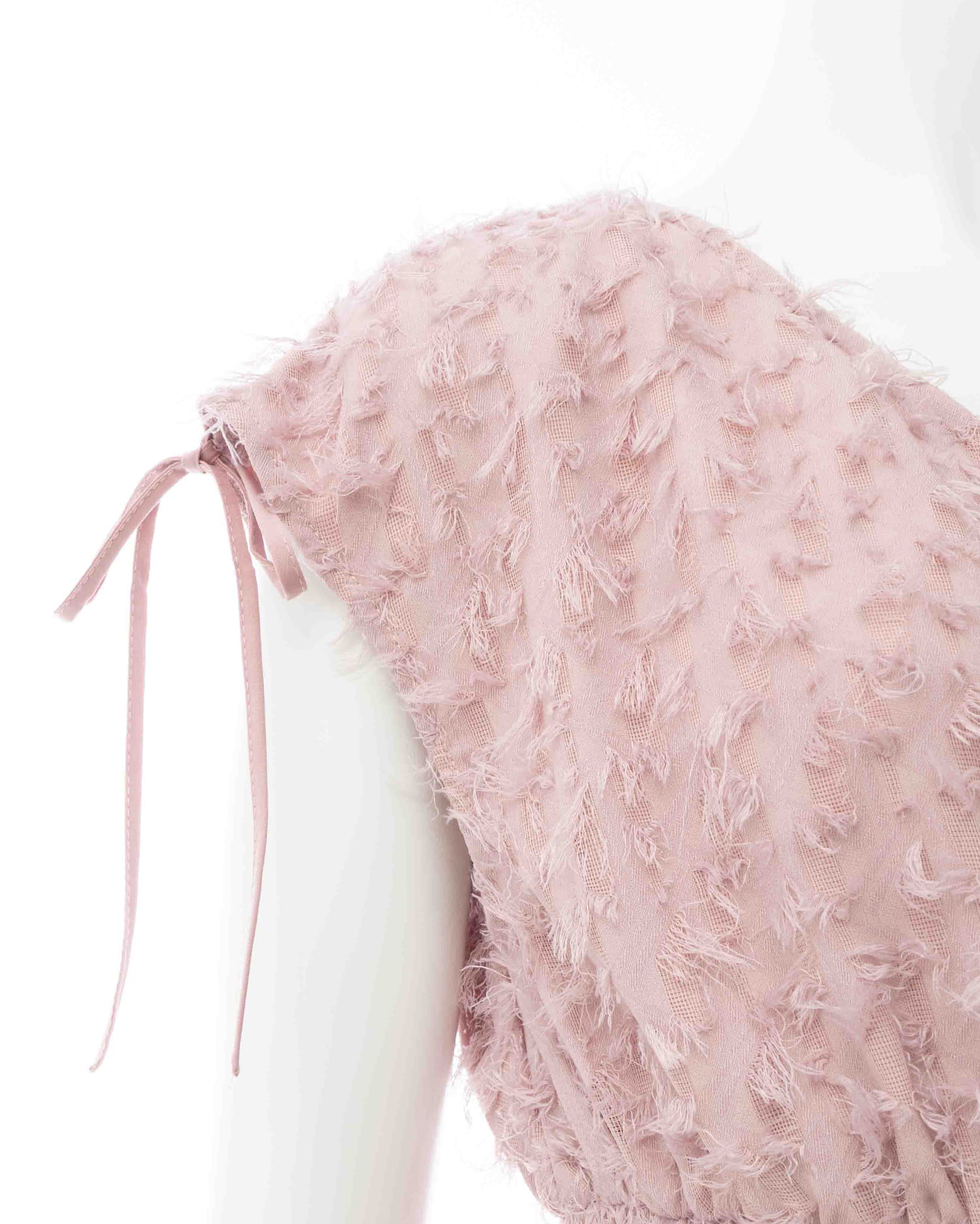 毛足の短いフリンジを使ってデザインされたカシュクールワンピース。