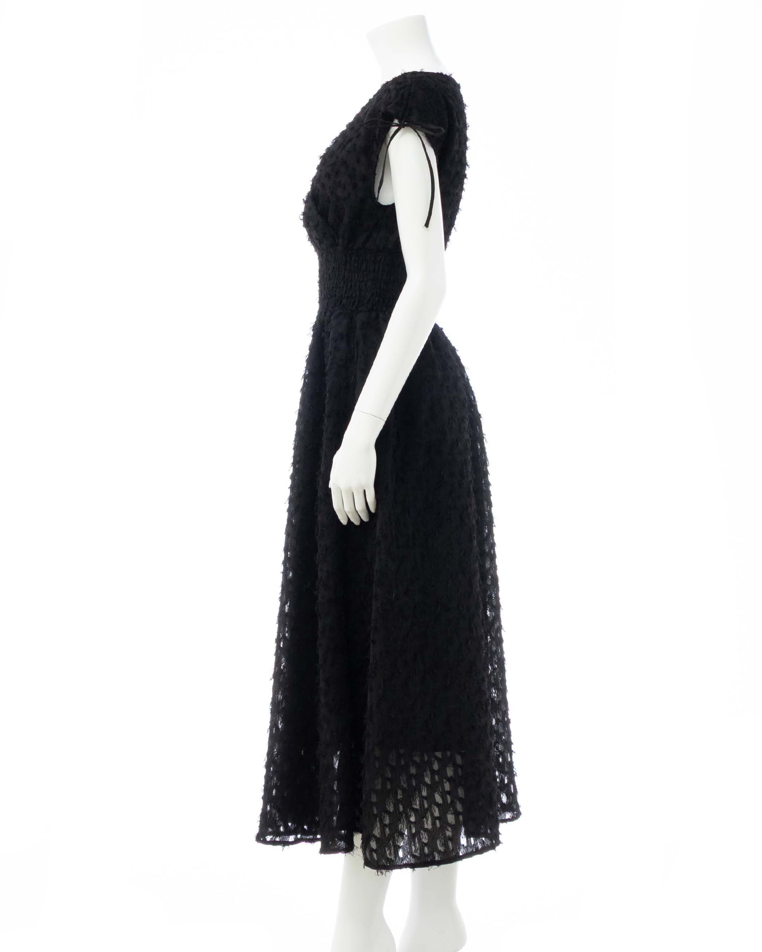 ウエストはシャーリングになっているのでメリハリのあるシルエットをメイク。