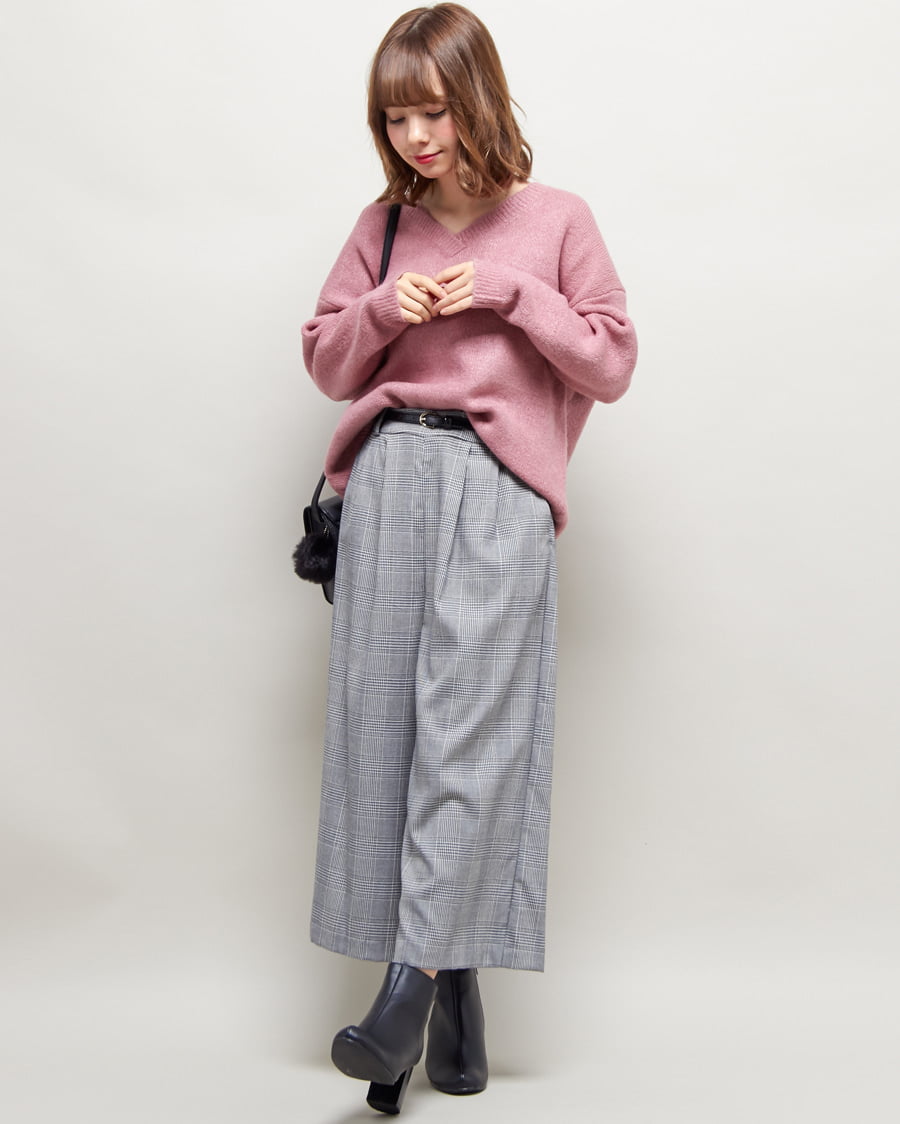 Vネックチュニックニットとベルト付グレンチェック柄ガウチョパンツのSET☆