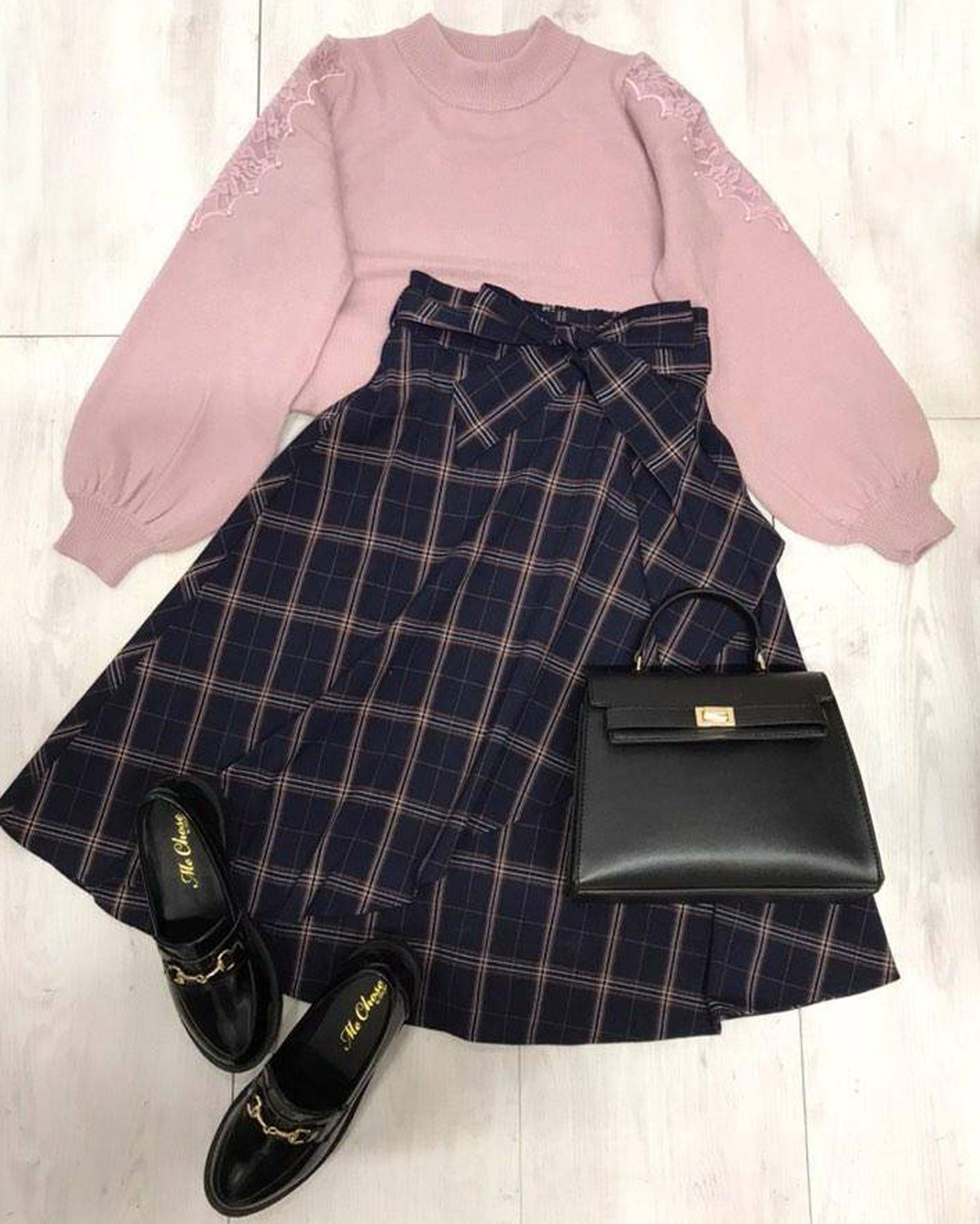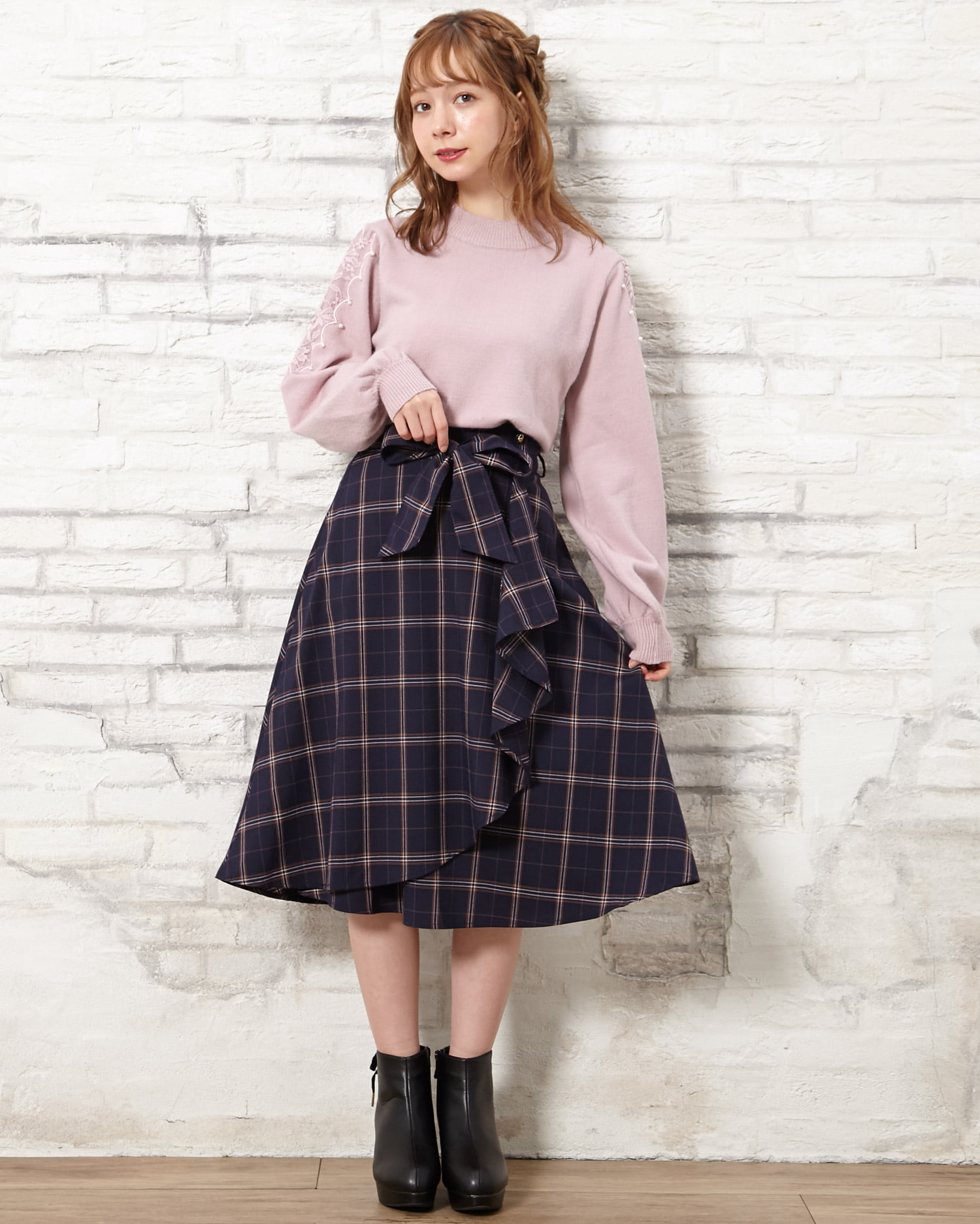 肩パールレースニット+チェック柄ミディスカート/SET