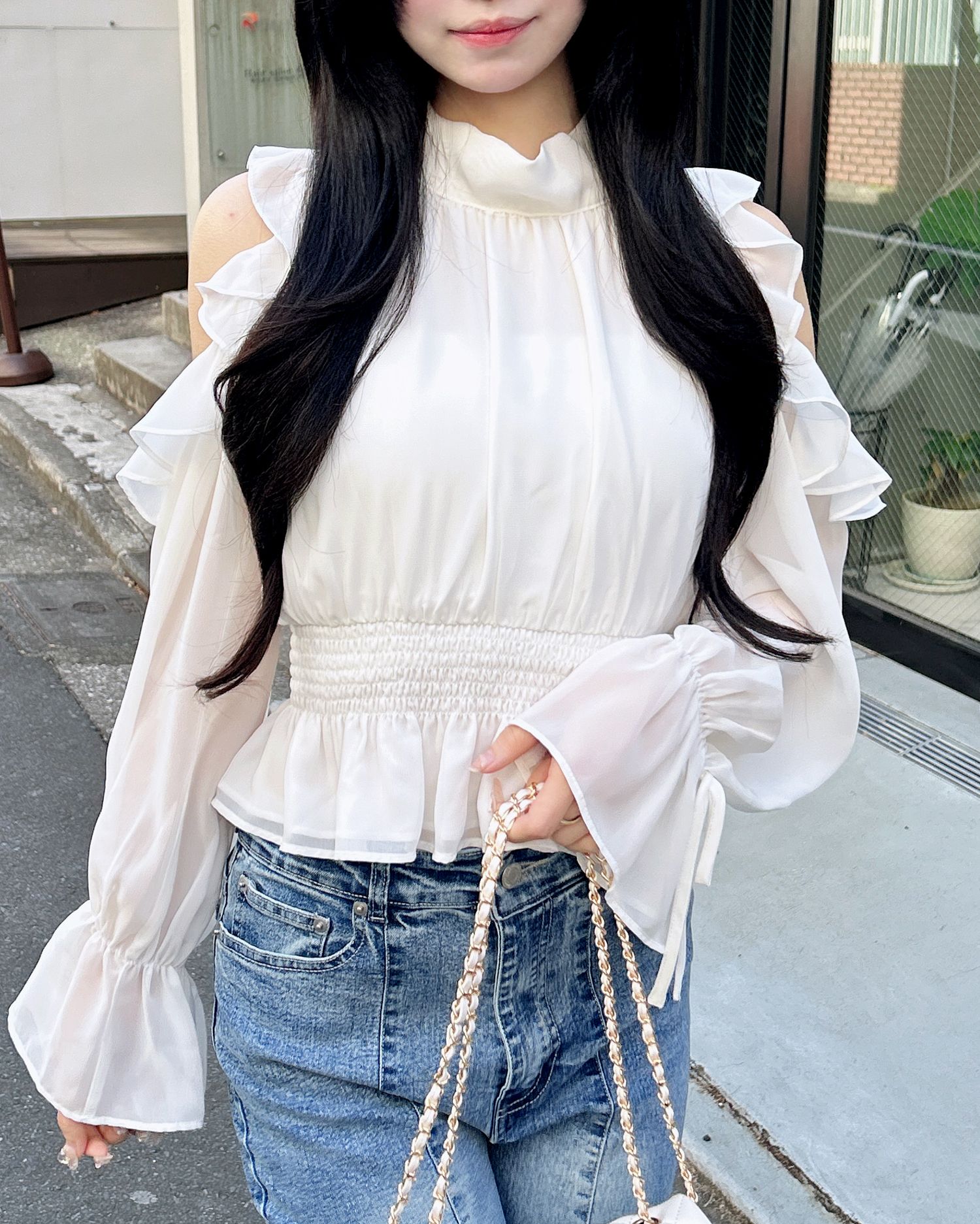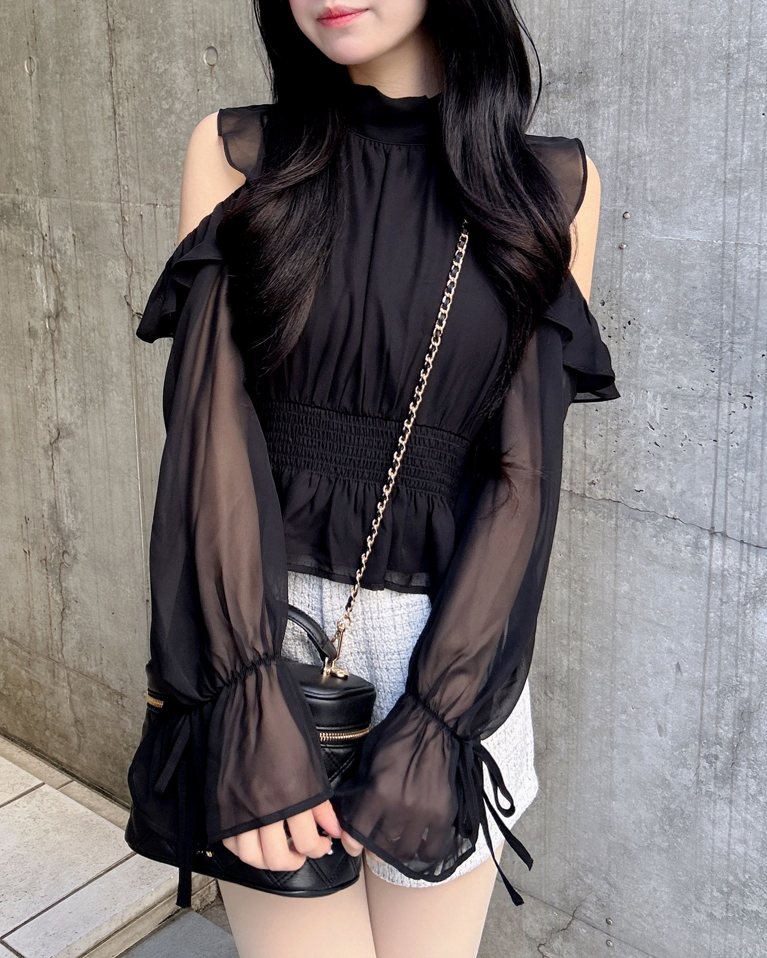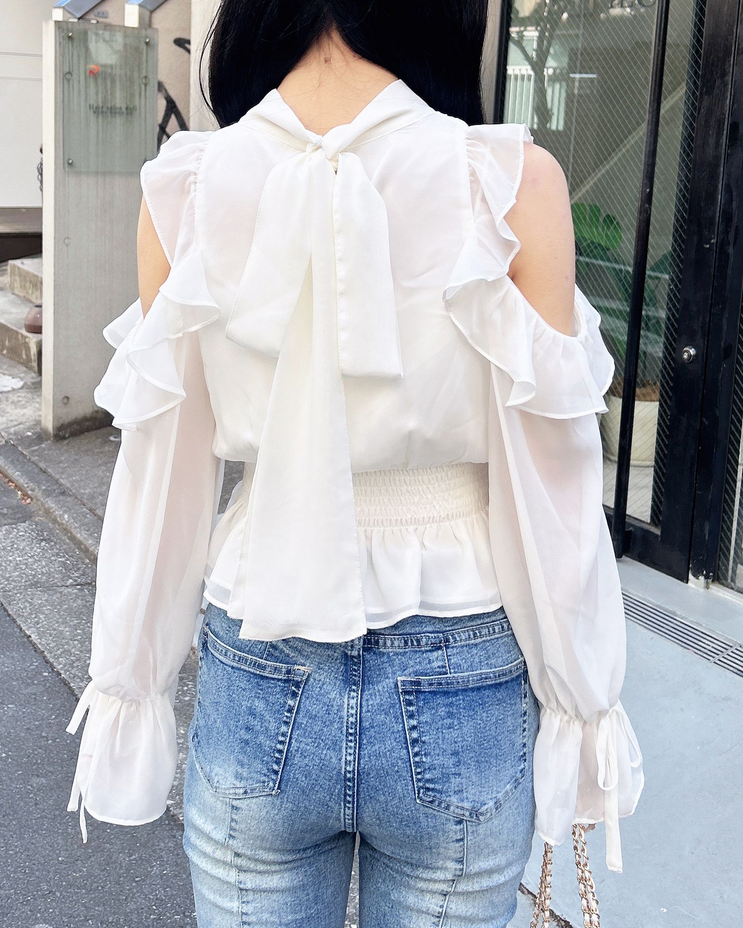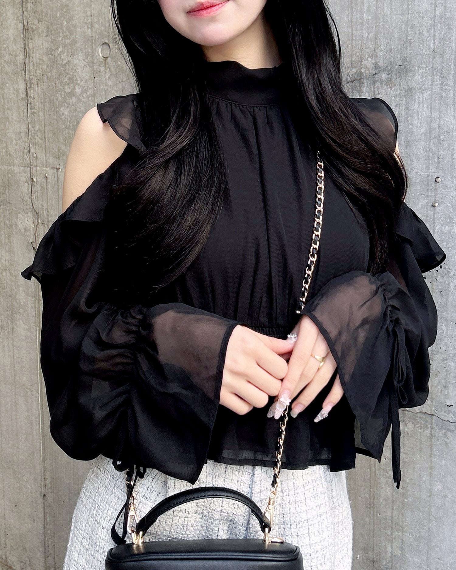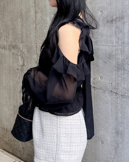 透け感のあるシフォン生地で仕立てたレディなオープンショルダーブラウス。