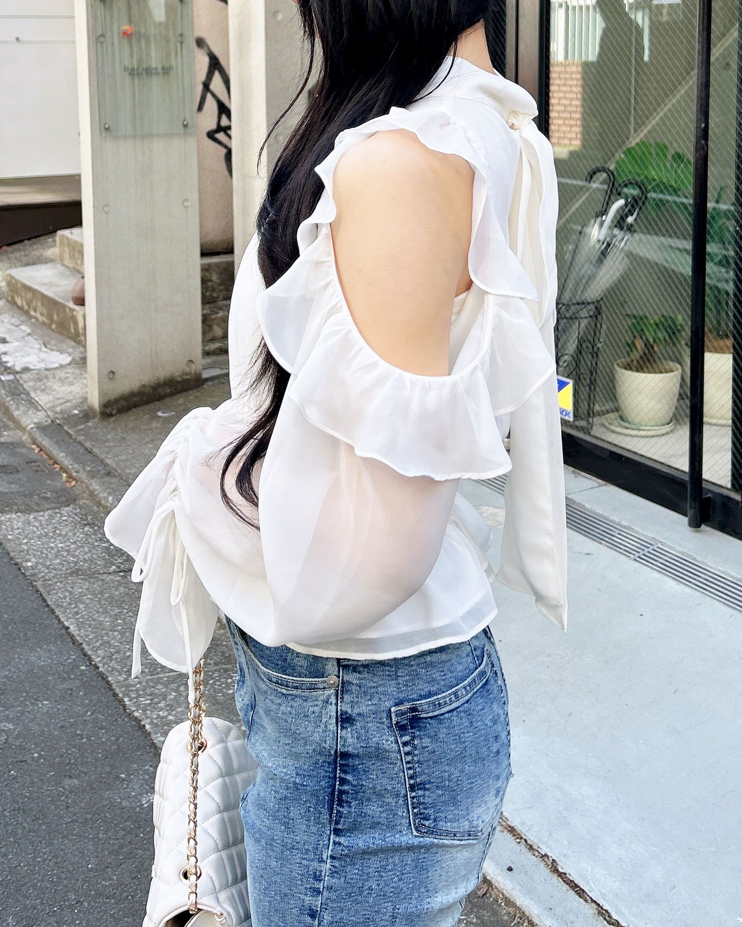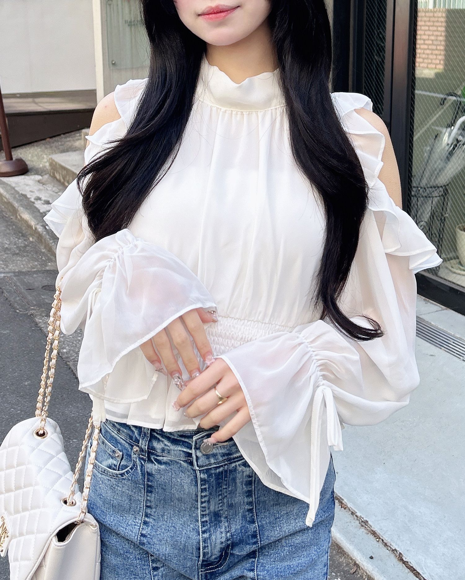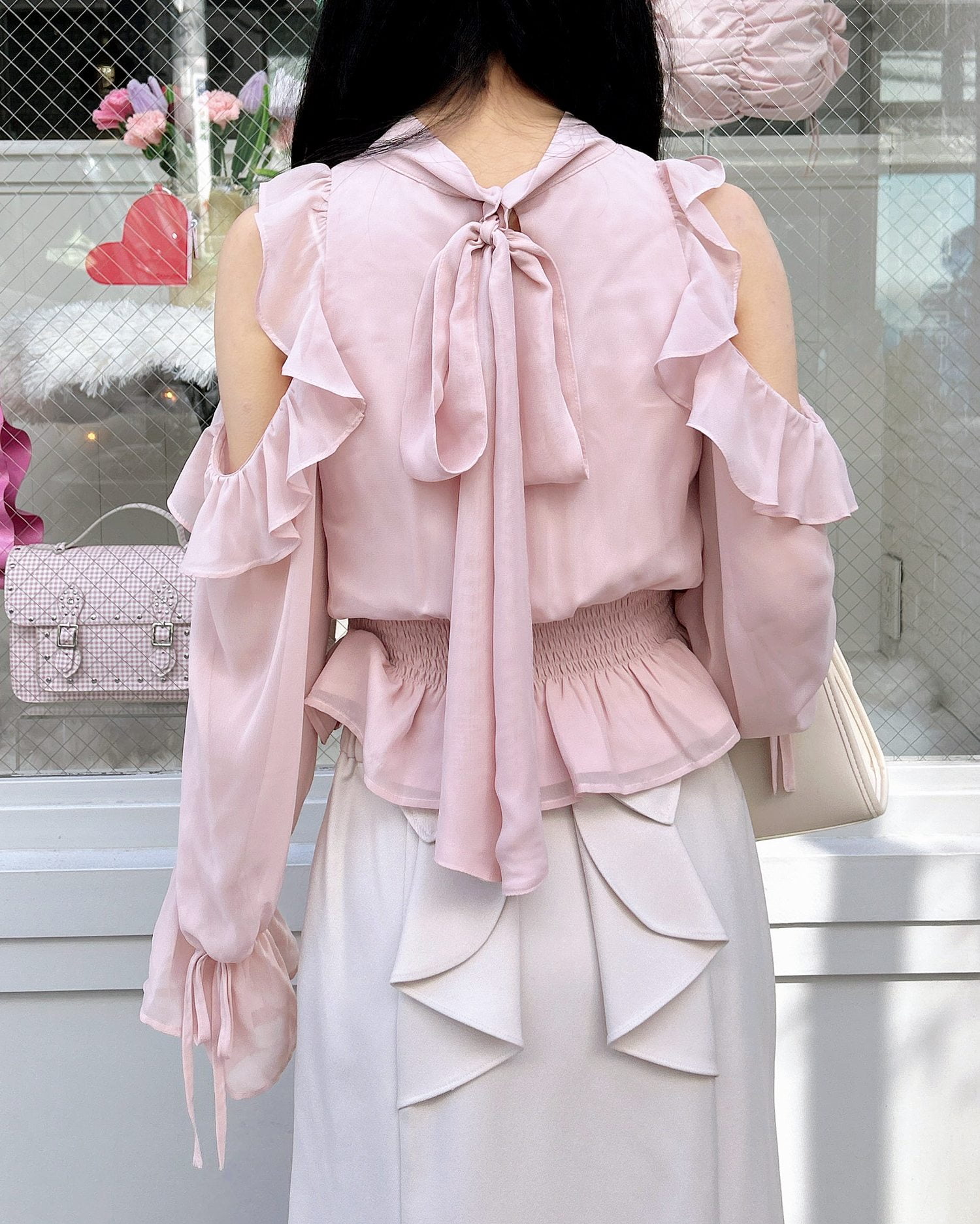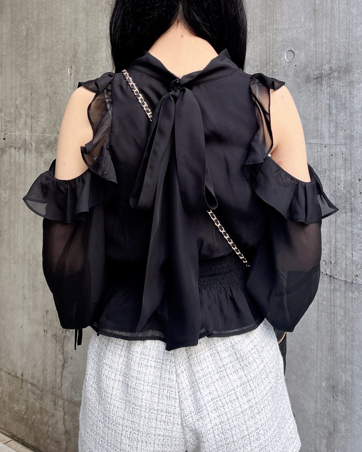 透け感のあるシフォン生地で仕立てたレディなオープンショルダーブラウス。