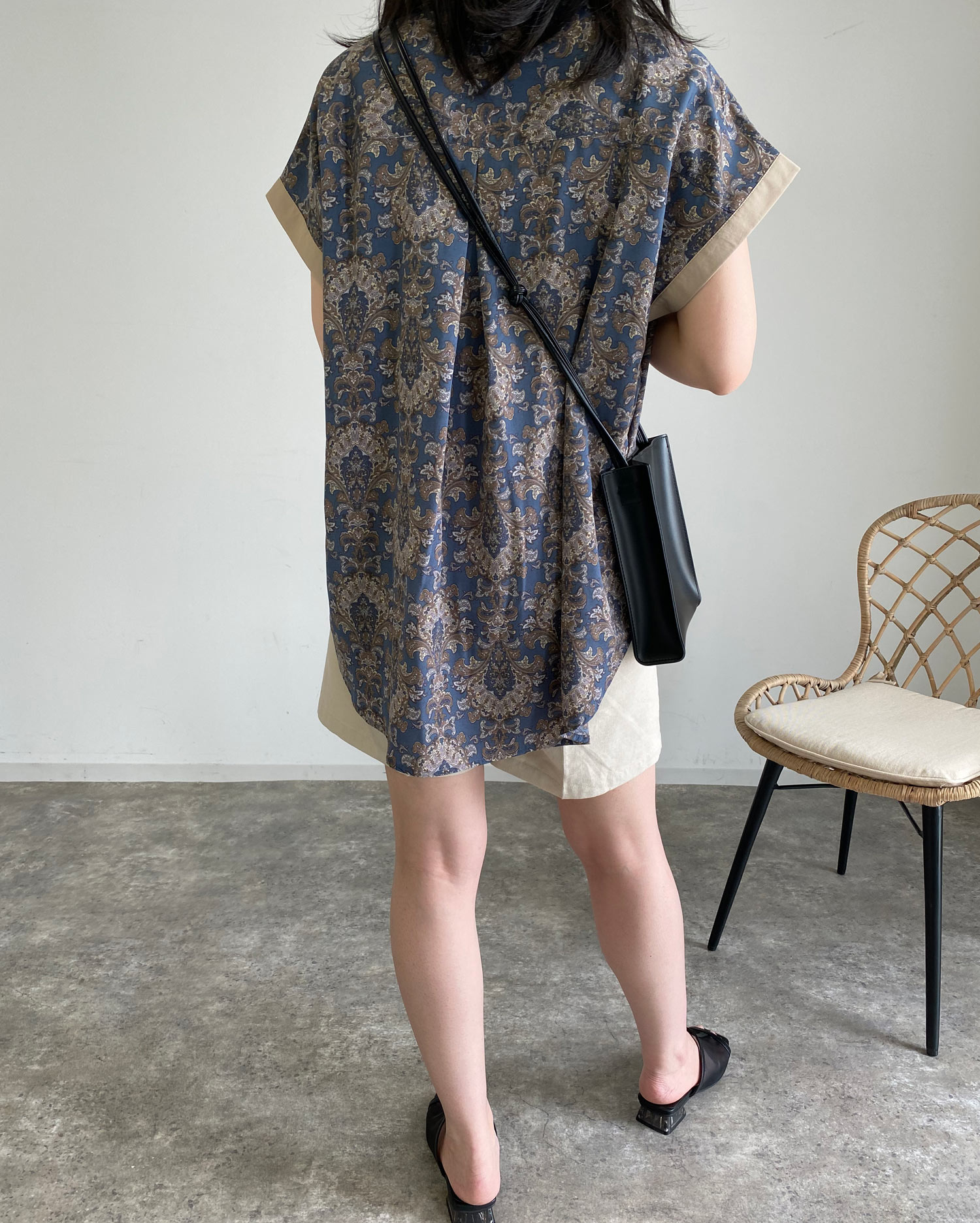 なめらかな生地と落ち感のあるシルエットで大人ラフに着られるシャツ。全体にあしらったシックなカラーのダマスク柄がノスタルジックな雰囲気です。ノーカラーとフレンチスリーブがすっきり見えを叶えてくれるのも◎。前後差をつけた裾はヒップを覆う長め丈でスタイルカバーも狙えます。キレイめパンツを合わせた上品な着こなしもおすすめ。