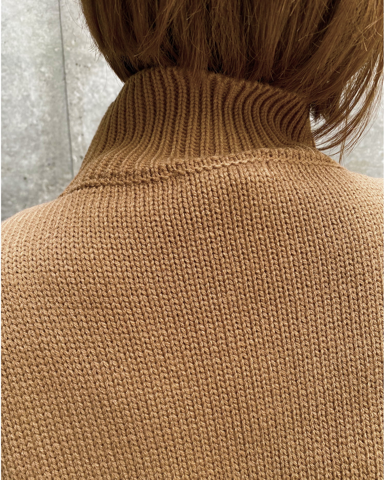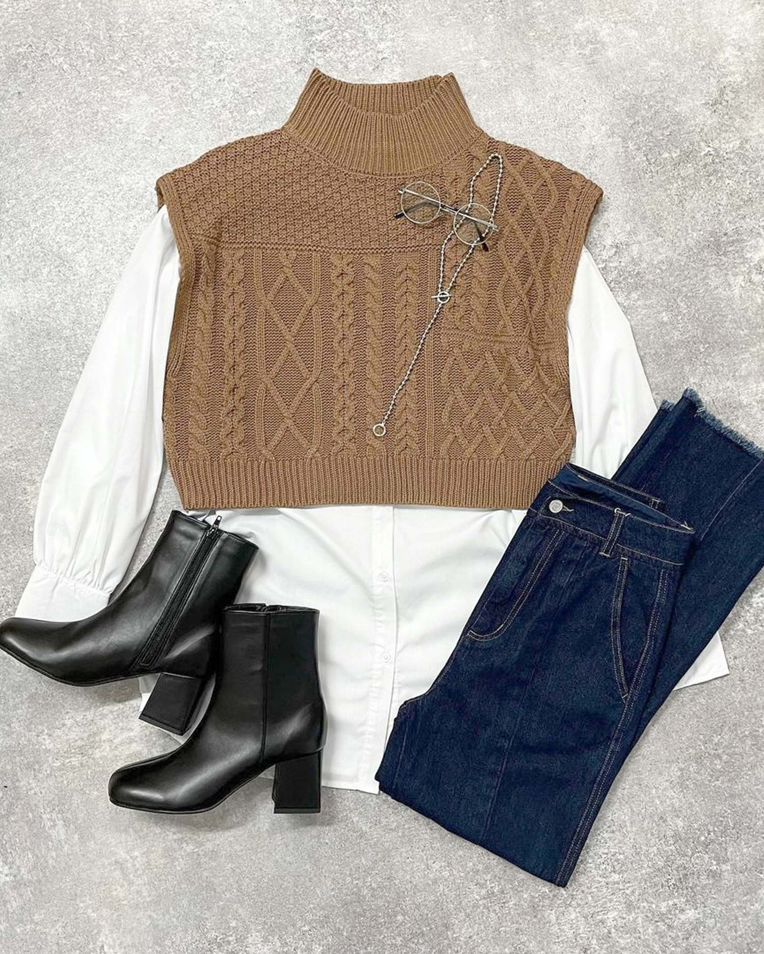 トレンドのモックネックにショート丈の組み合わせでバランスの良い着こなしへと導きます。