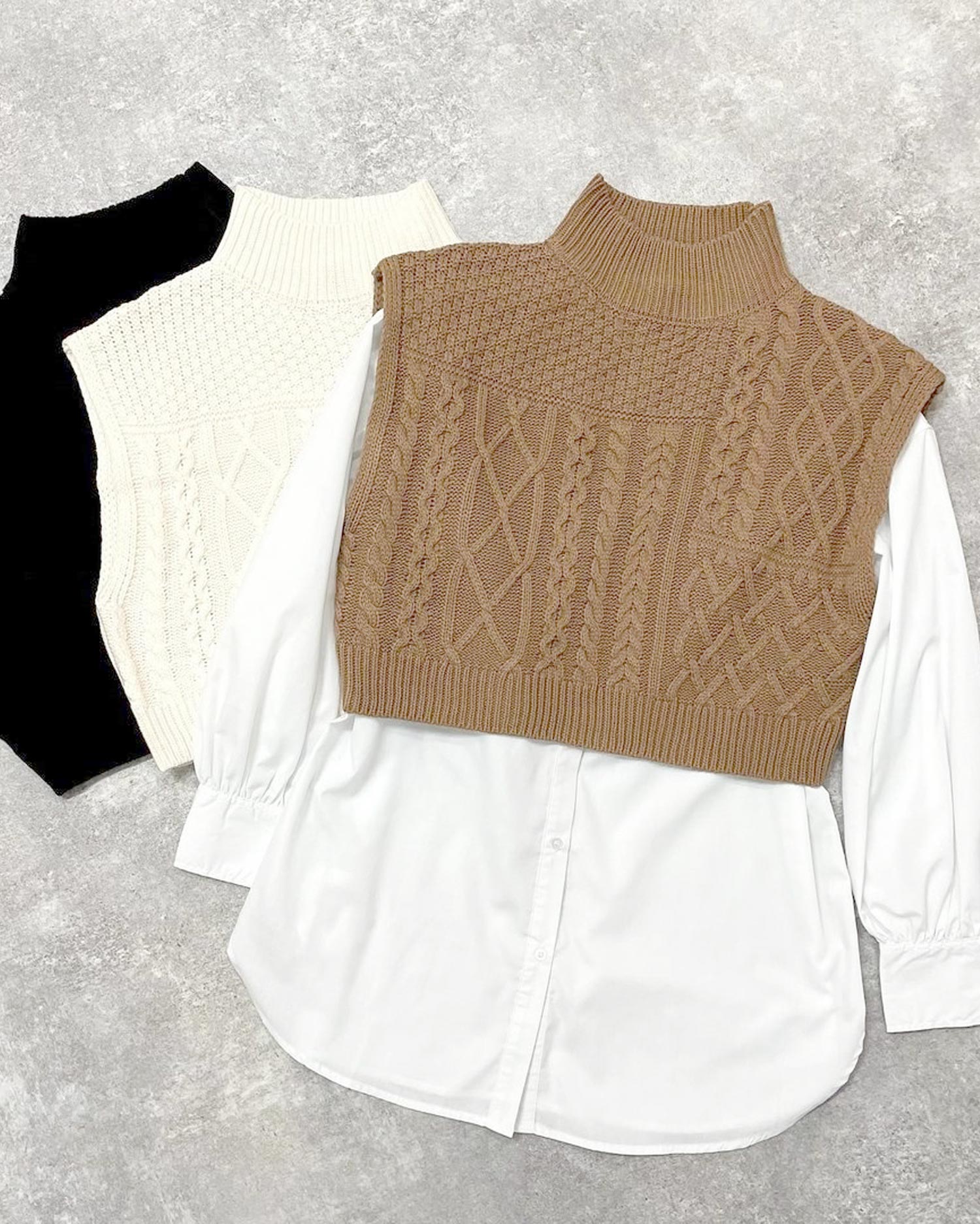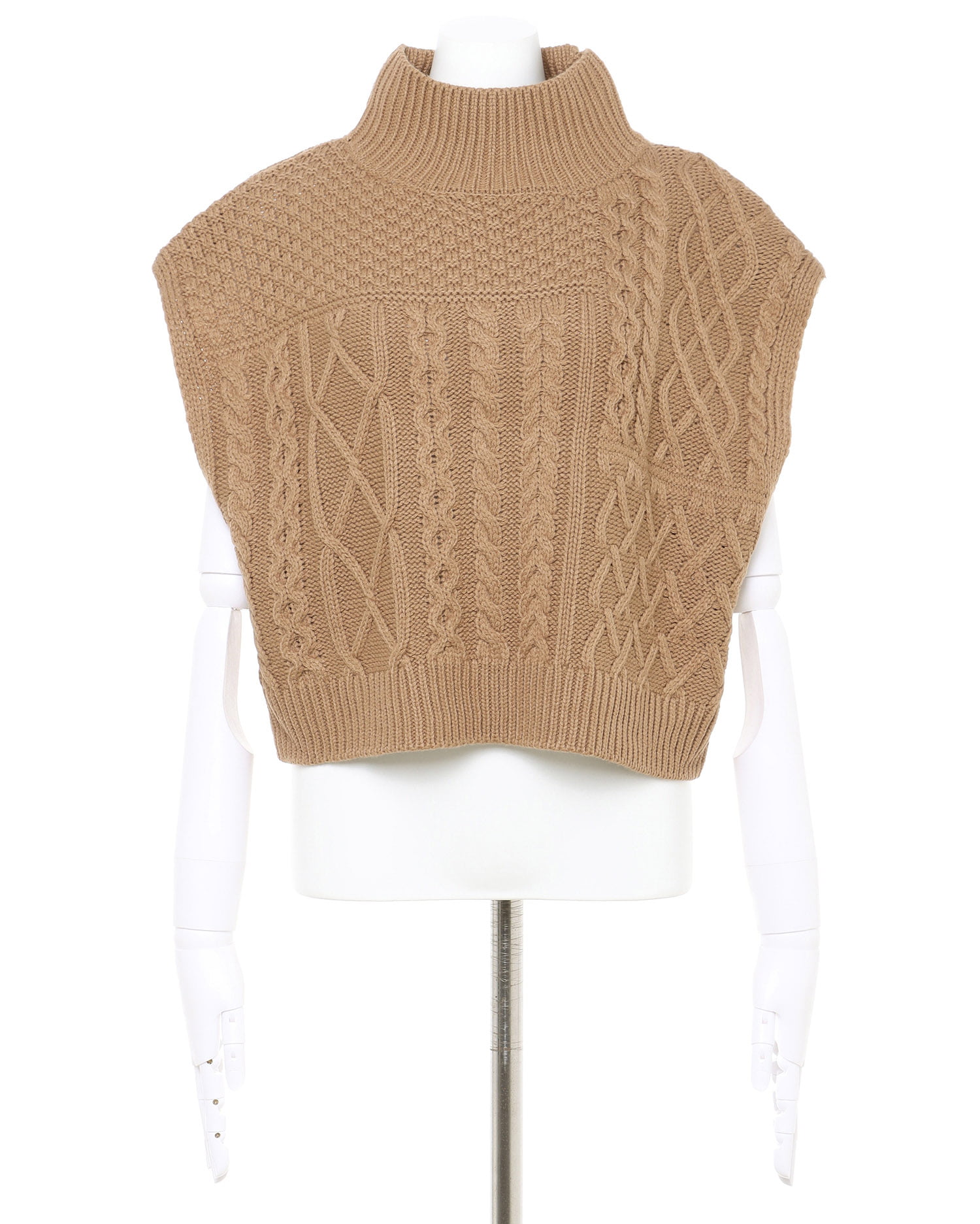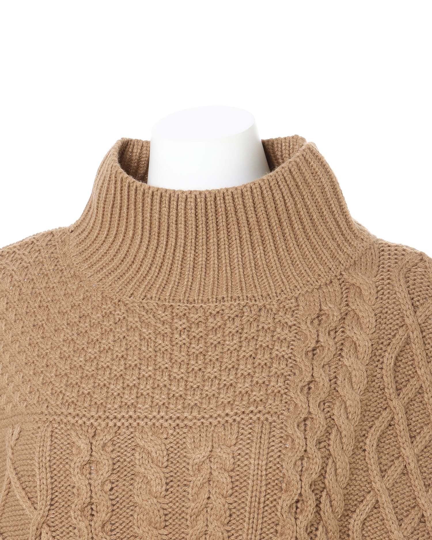 異なる編み地を組み合わせたパッチワークデザインのニットトップス。