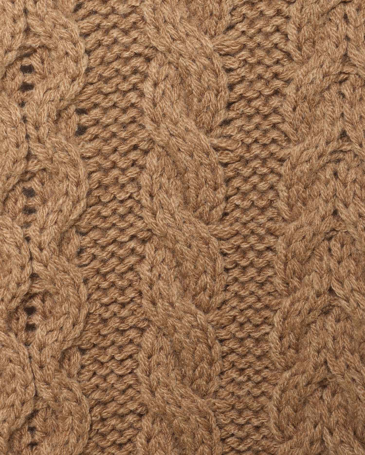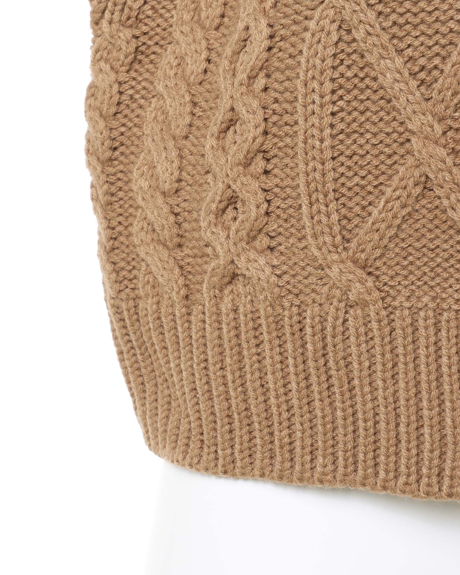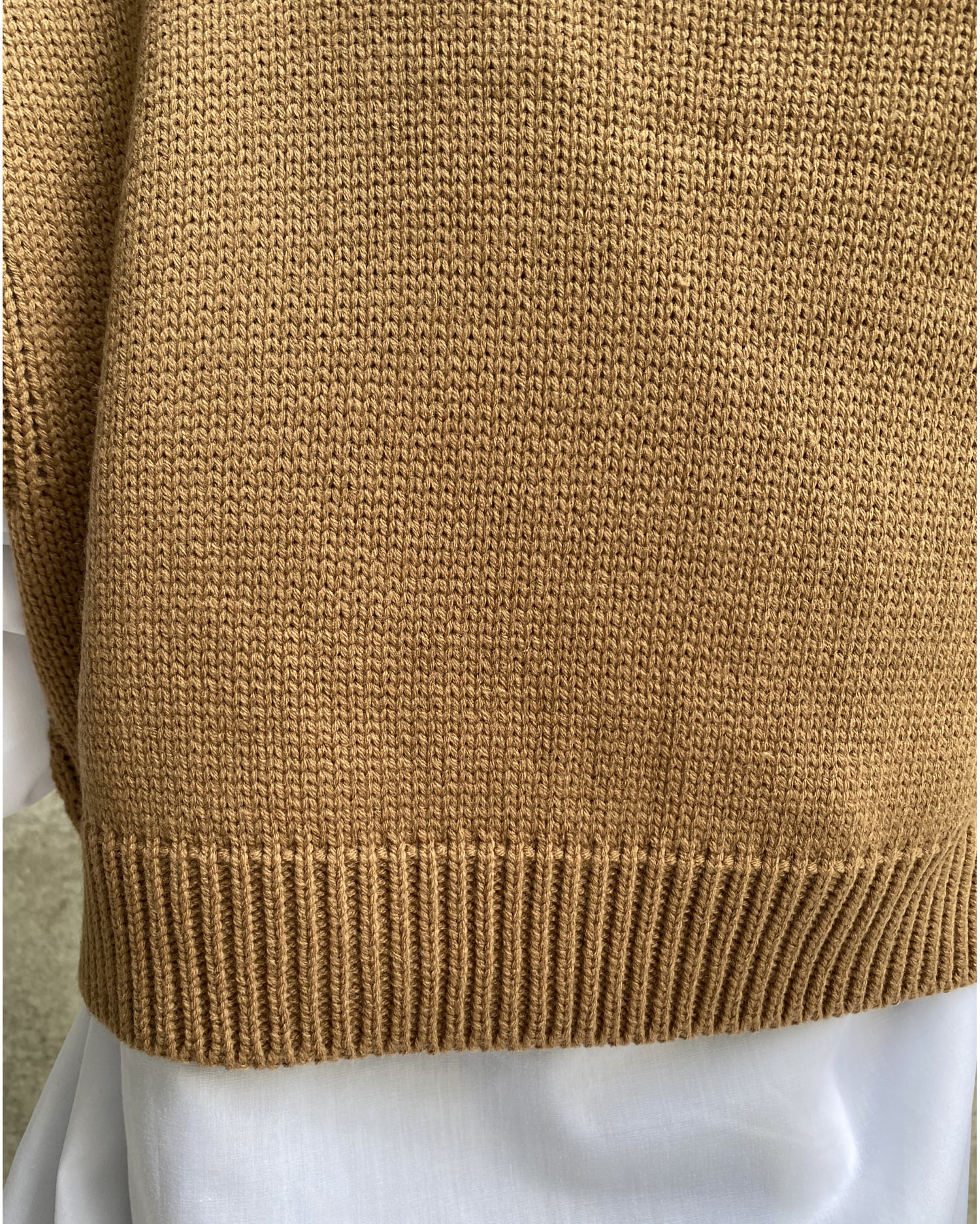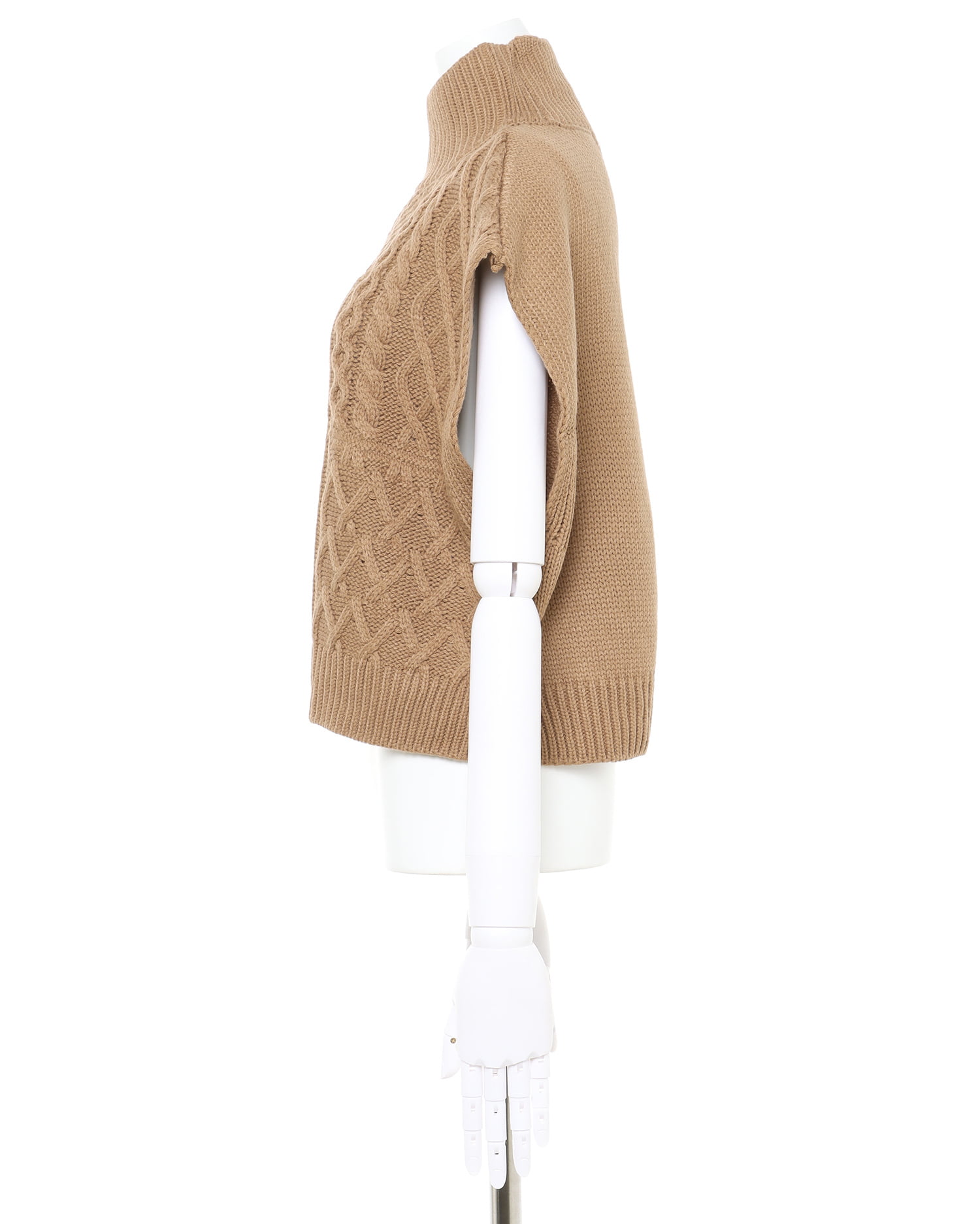 異なる編み地を組み合わせたパッチワークデザインのニットトップス。