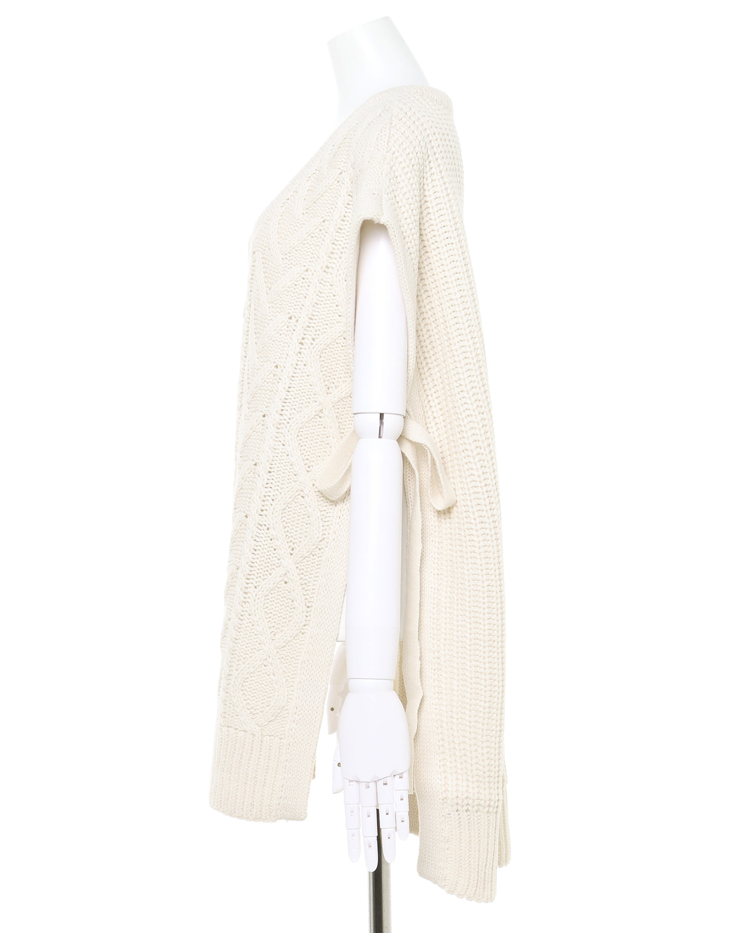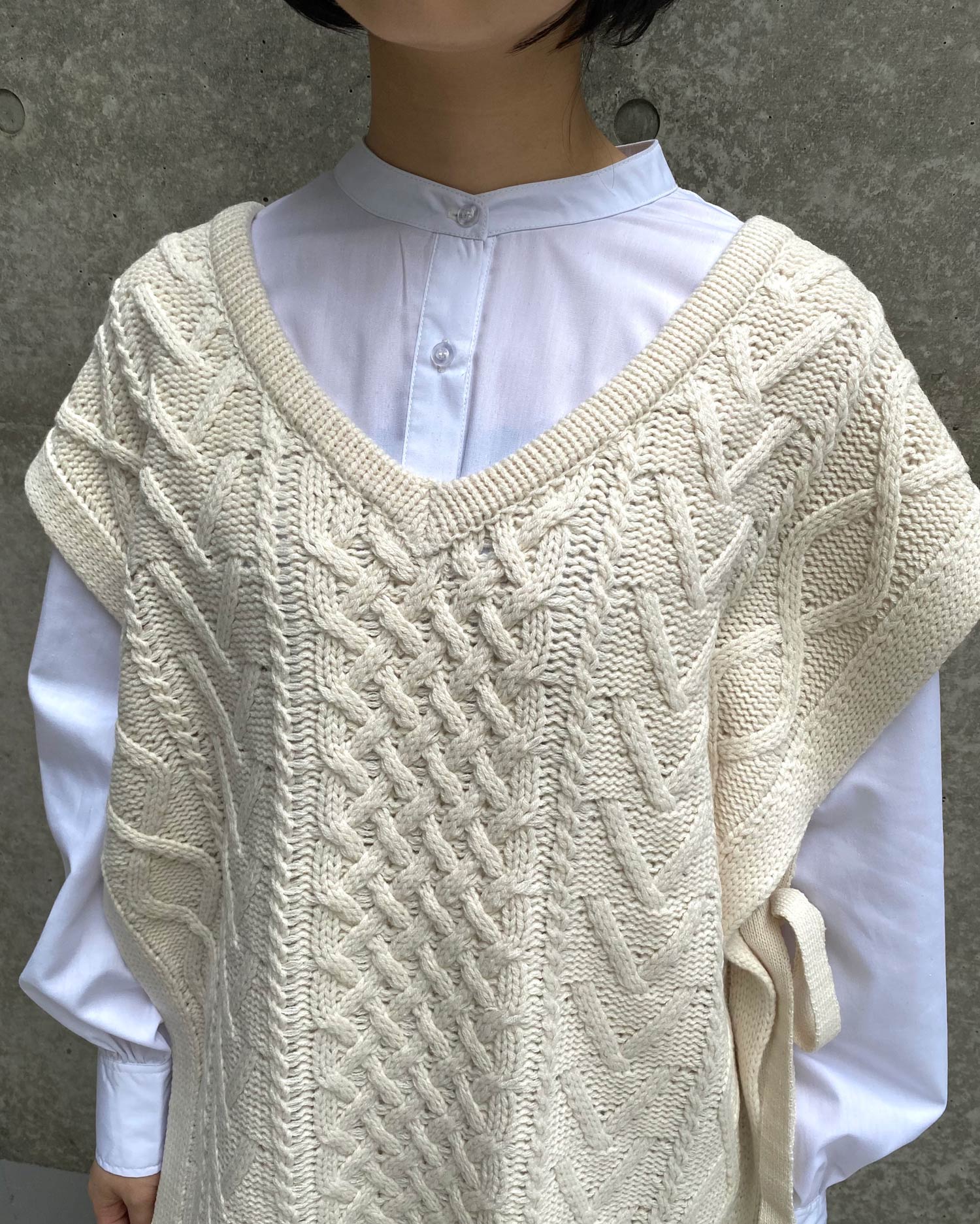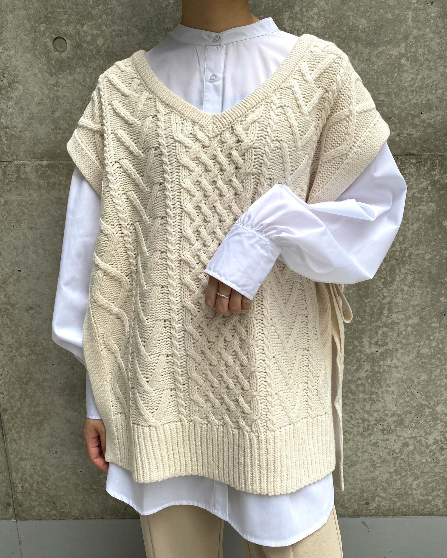 ナチュラルな雰囲気のケーブル編みがシンプルなワンカラーに表情をプラスしています。