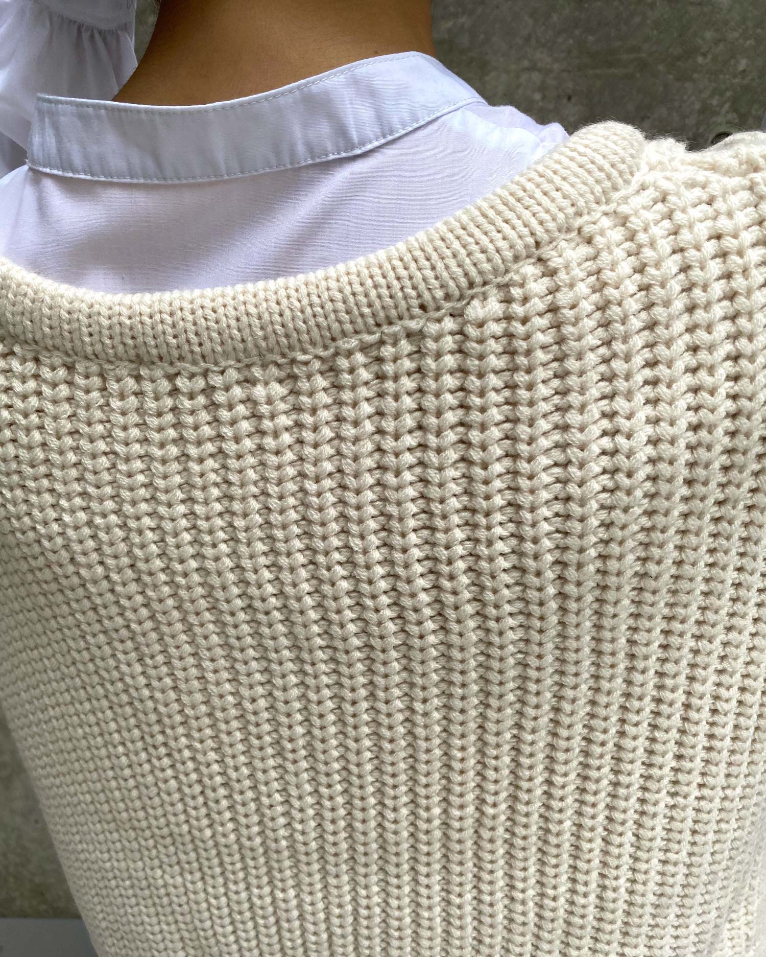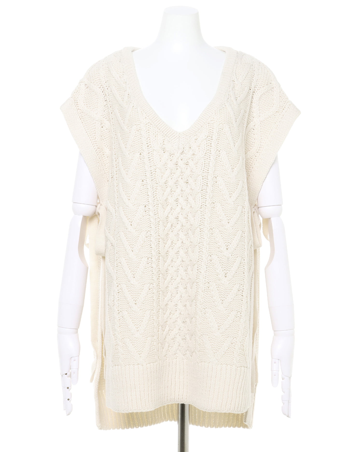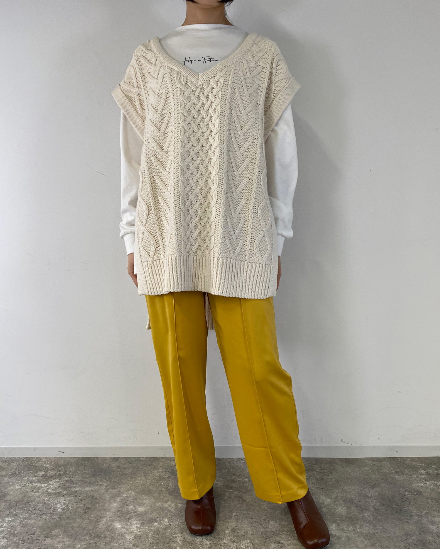 ナチュラルな雰囲気のケーブル編みがシンプルなワンカラーに表情をプラスしています。