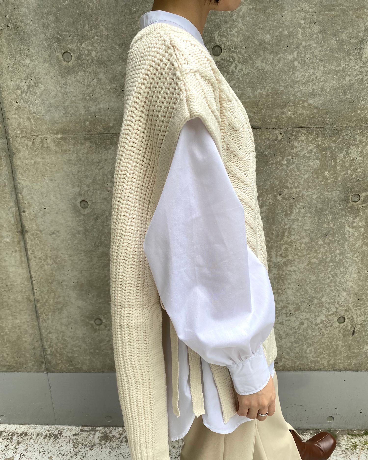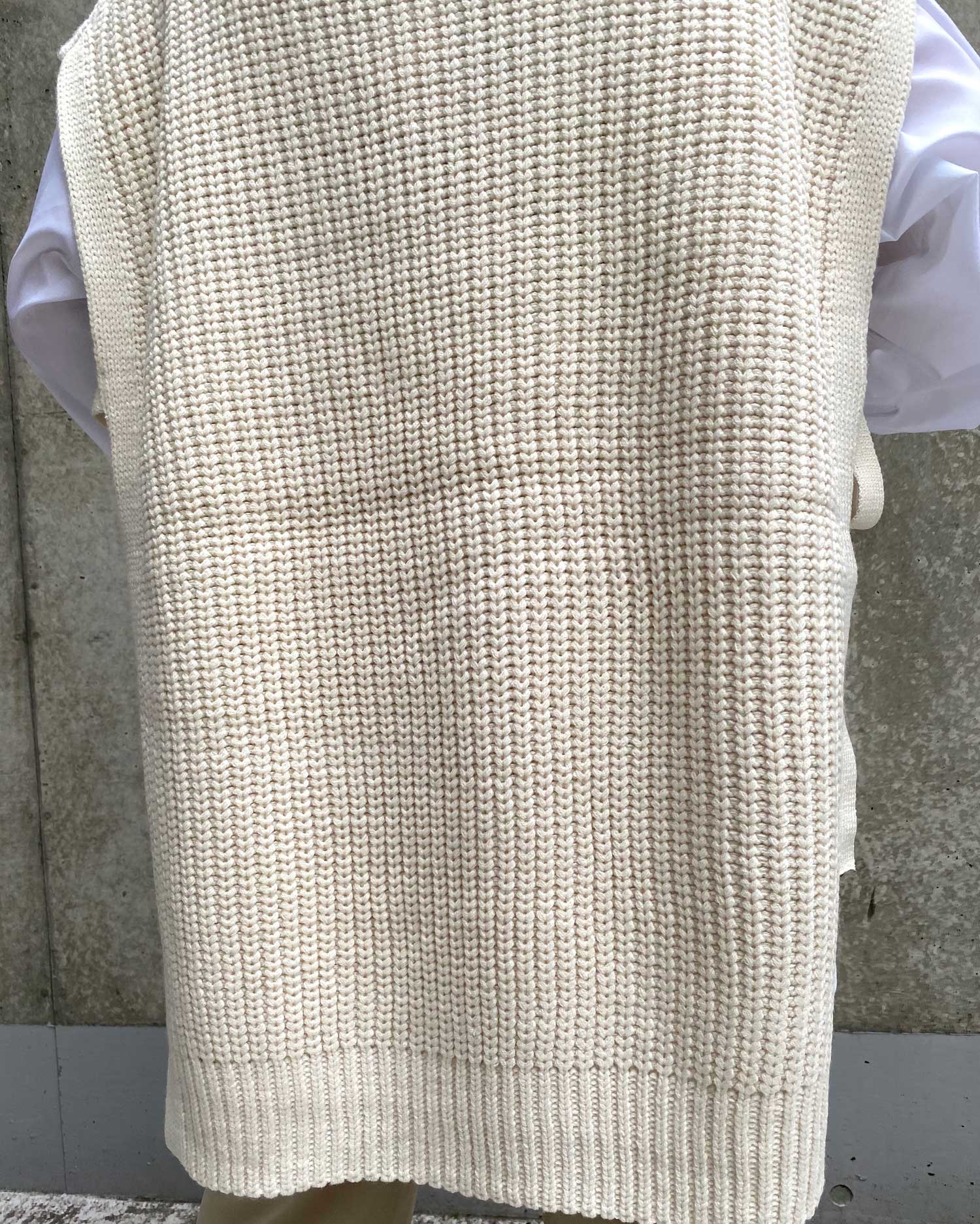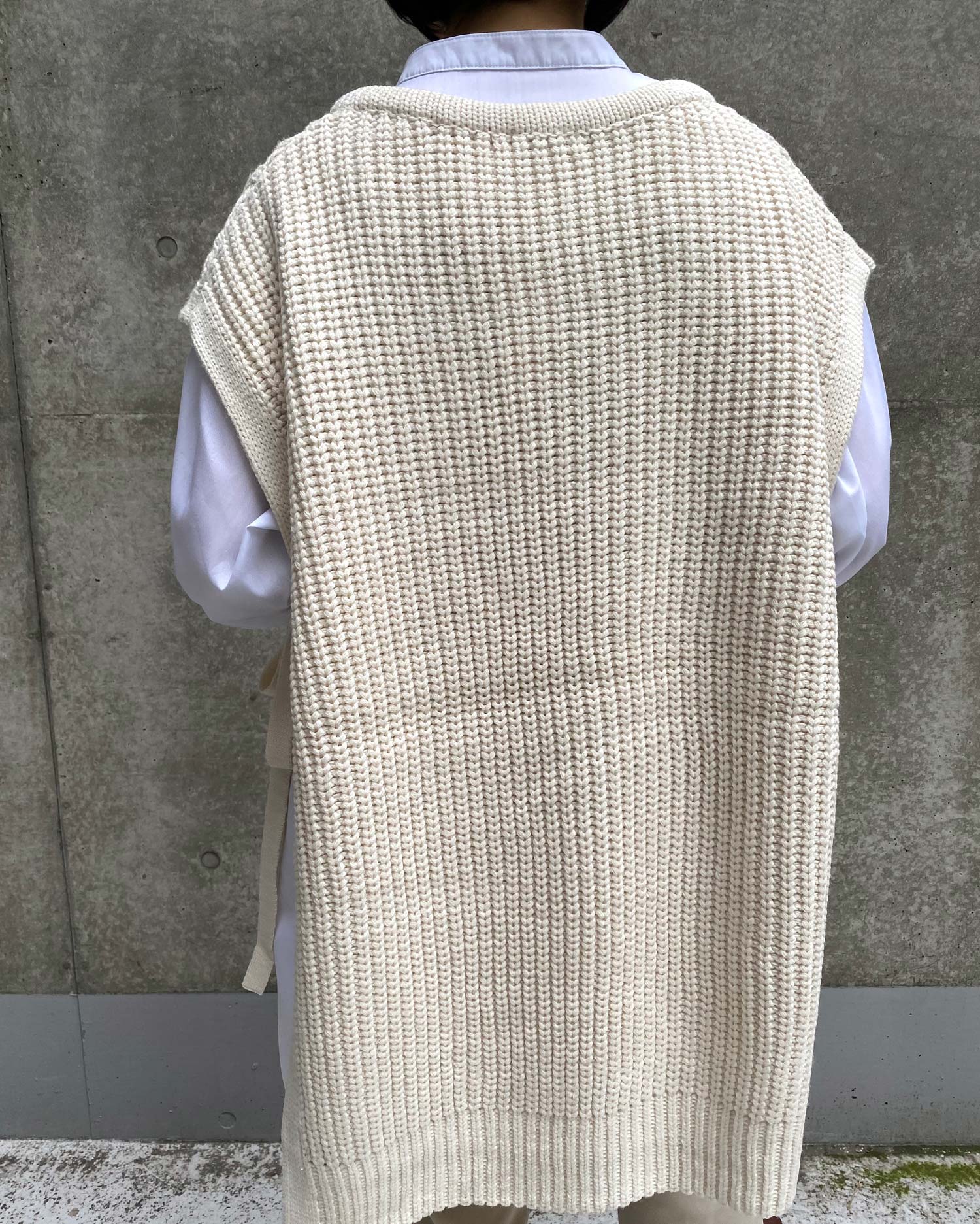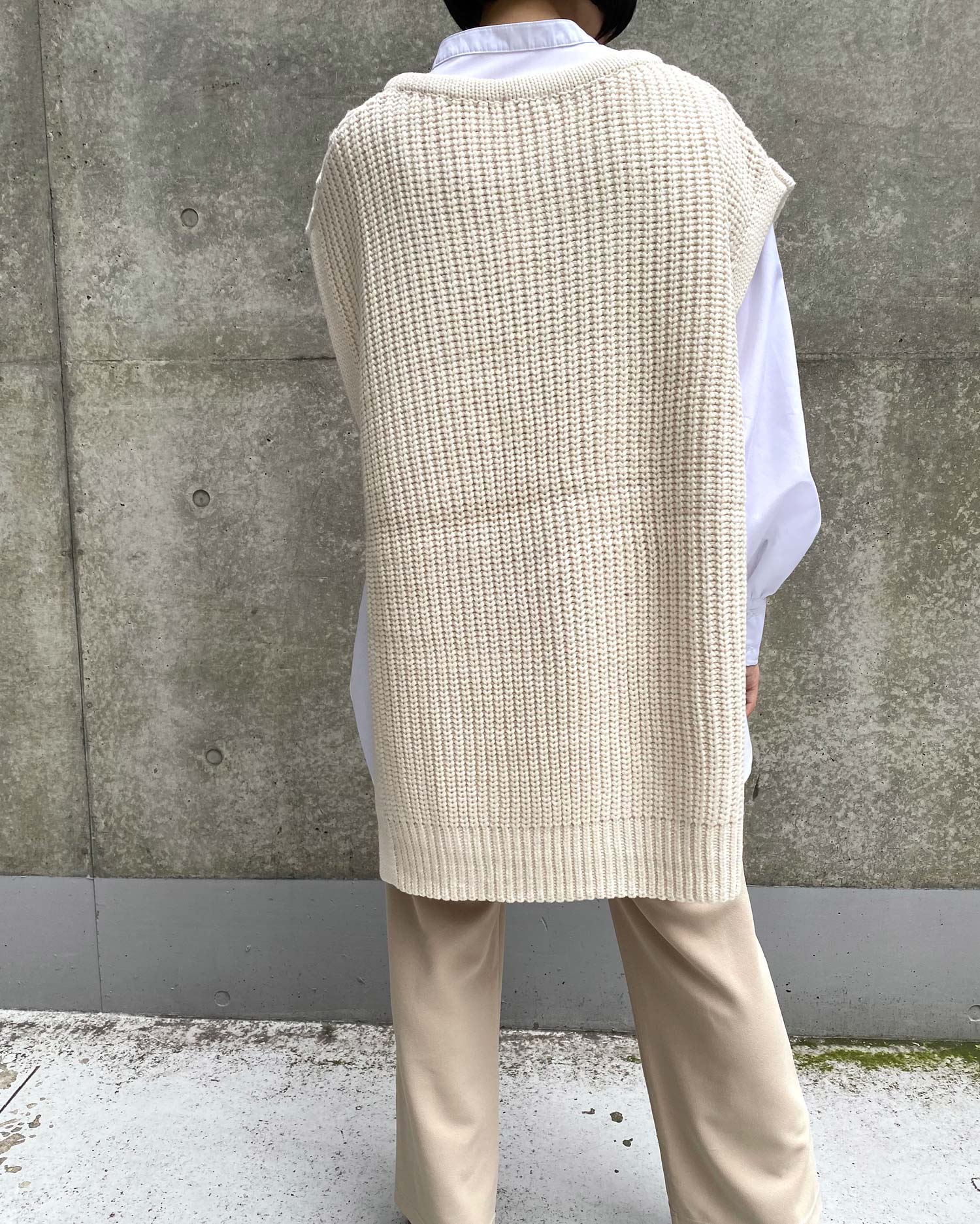 ビッグなシルエットと長めの裾丈でラフな着こなしが完成するベスト。