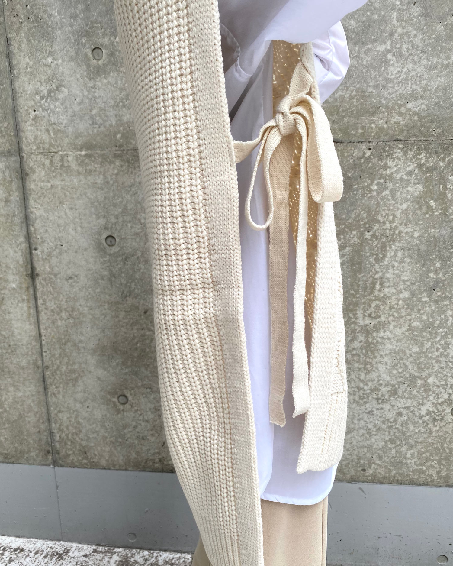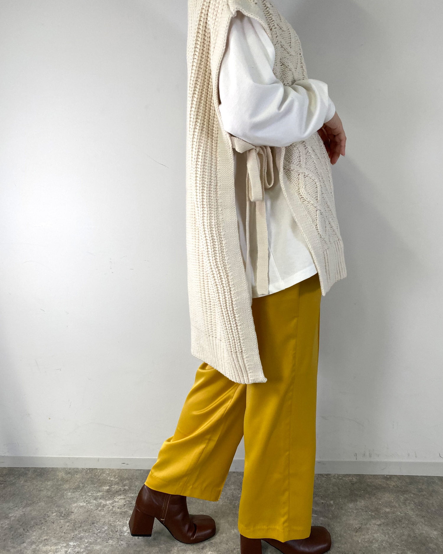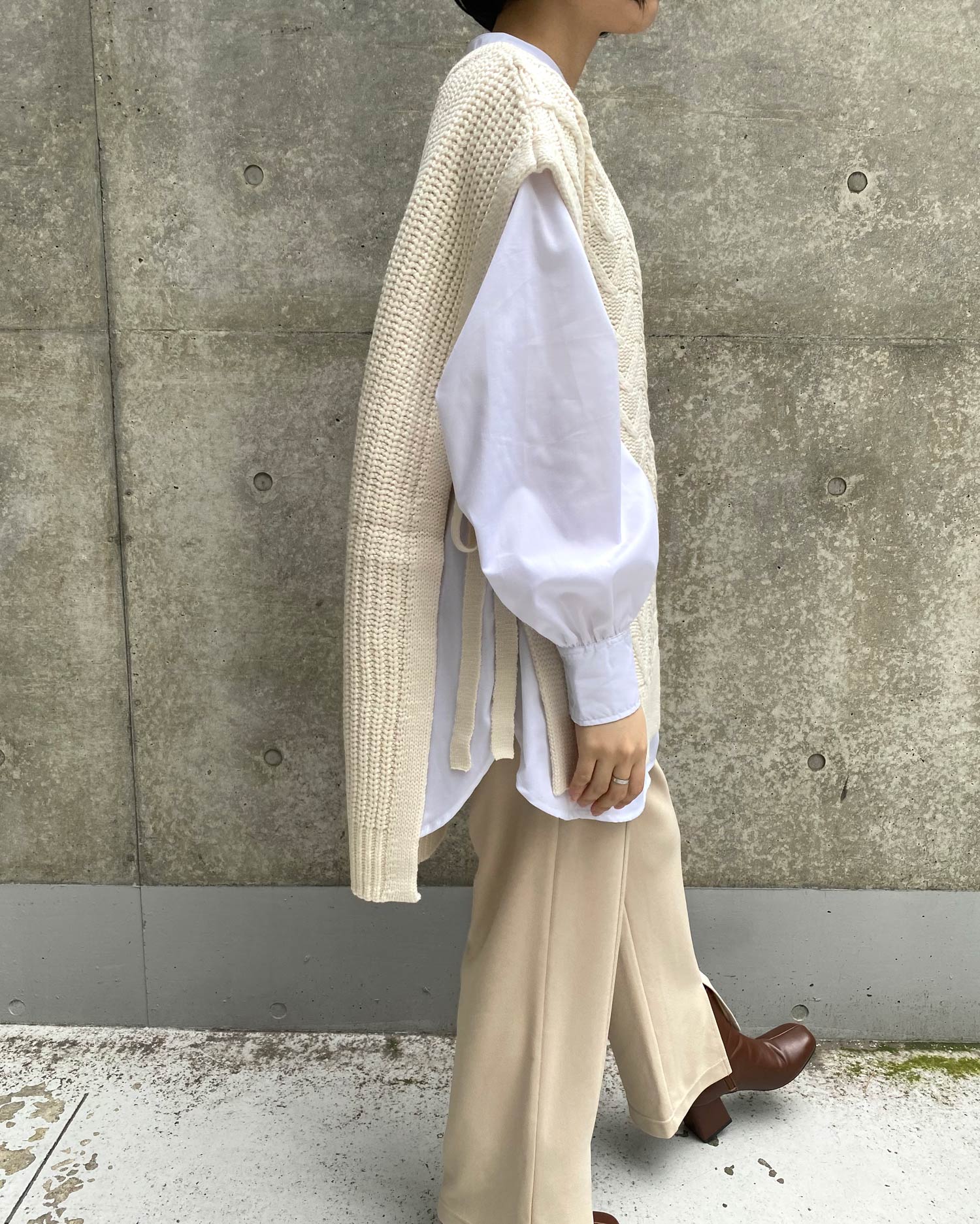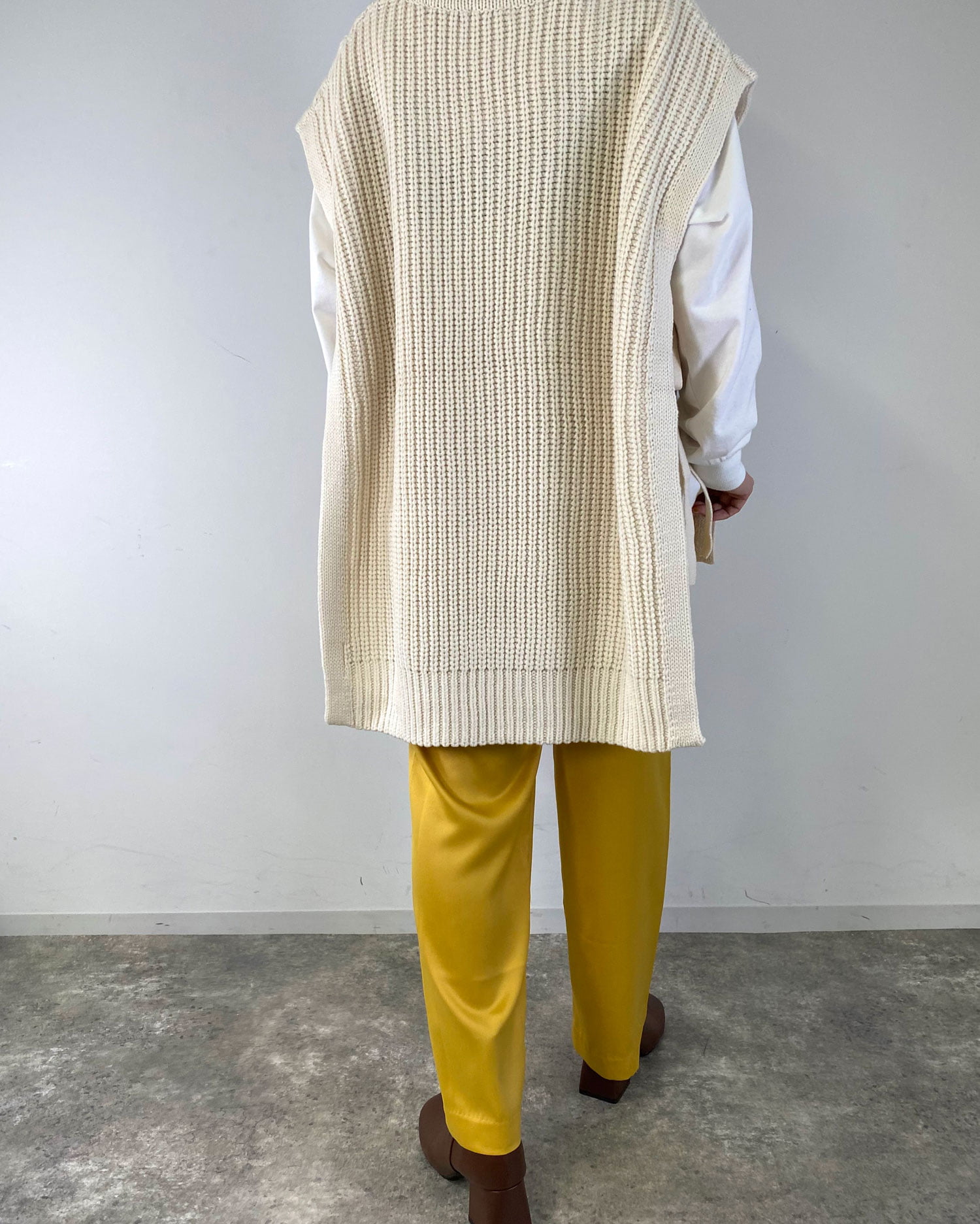 ビッグなシルエットと長めの裾丈でラフな着こなしが完成するベスト。