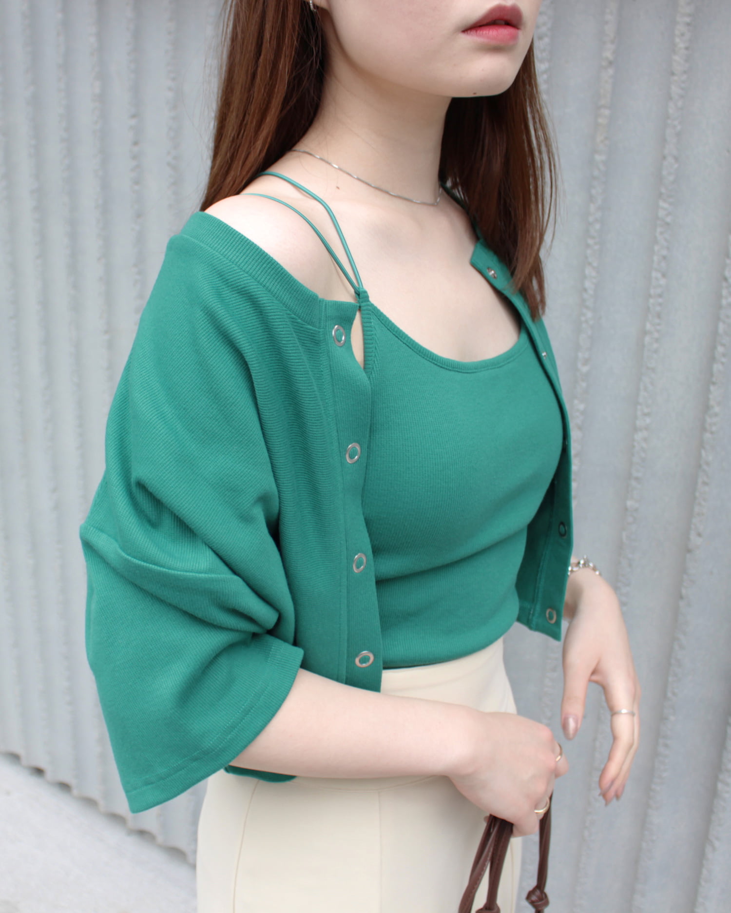 【4221-600299 スナップボタンリブ半袖カーディガン】とアンサンブルでの着用可能。こなれ感たっぷりの仕上がったコーデに!!