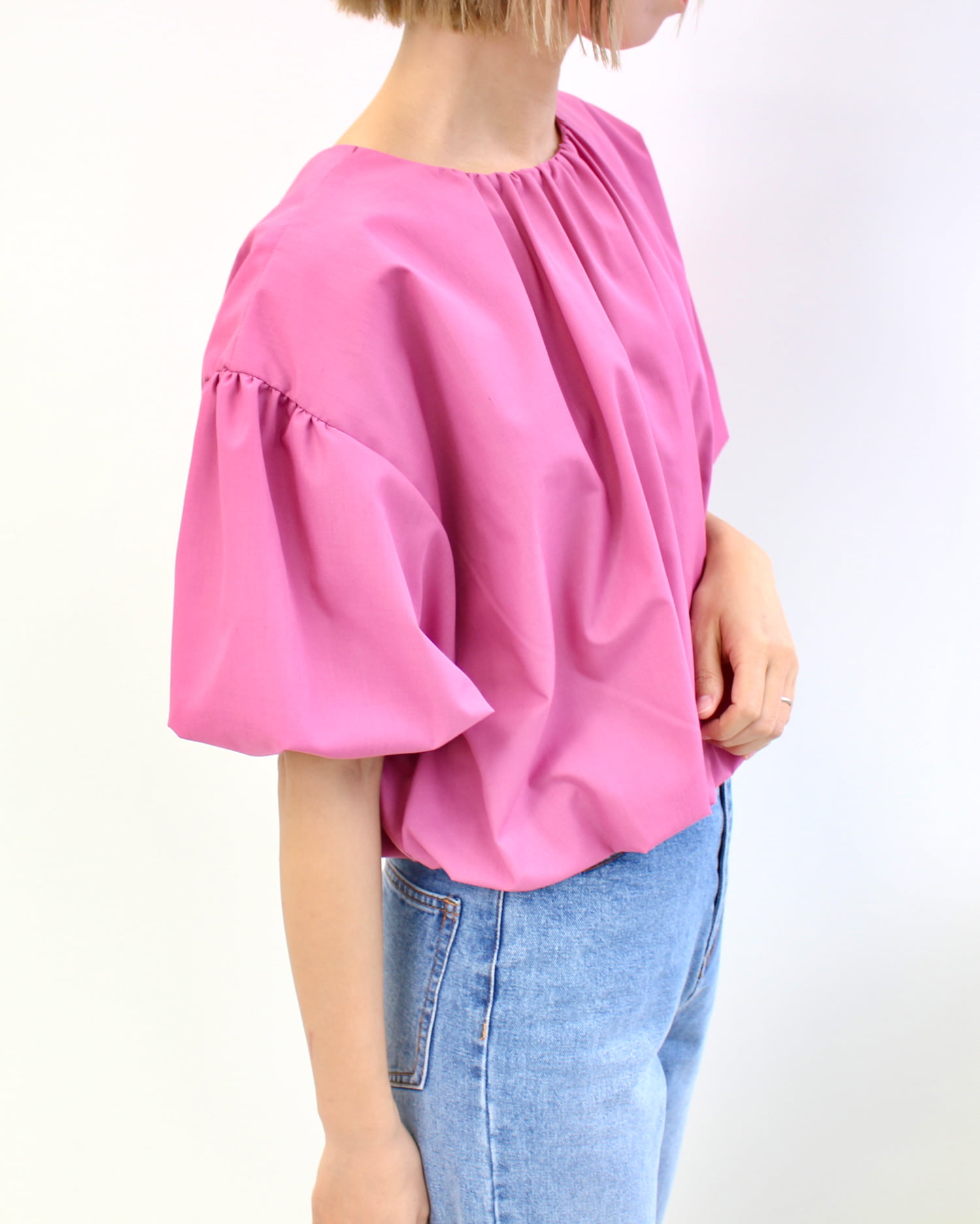 ・袖口のゴムギャザーのデザインがバルーンスリーブのデザインを強調し、こなれ感高まる仕上がりに。