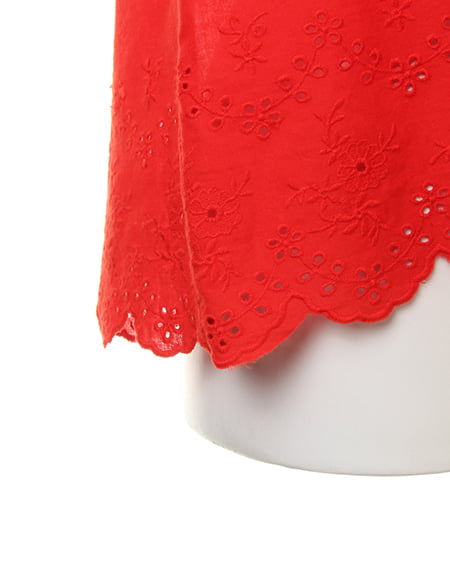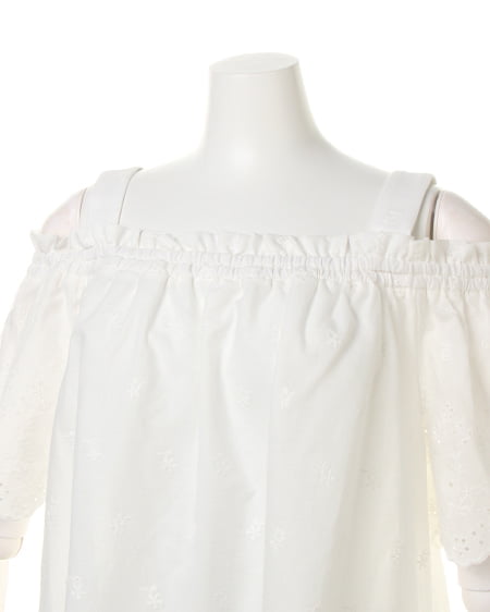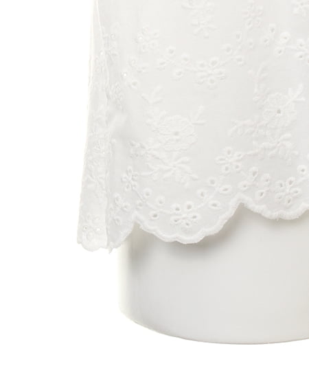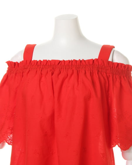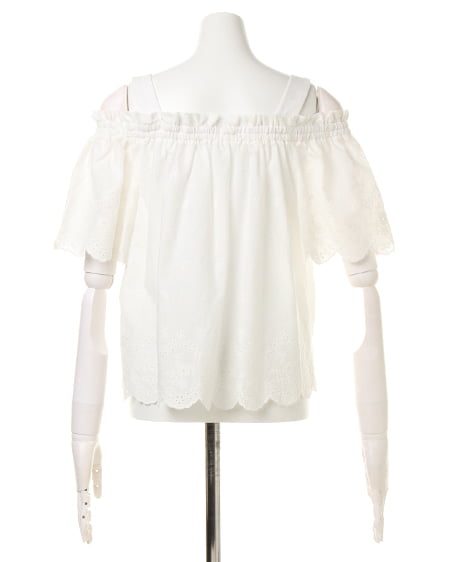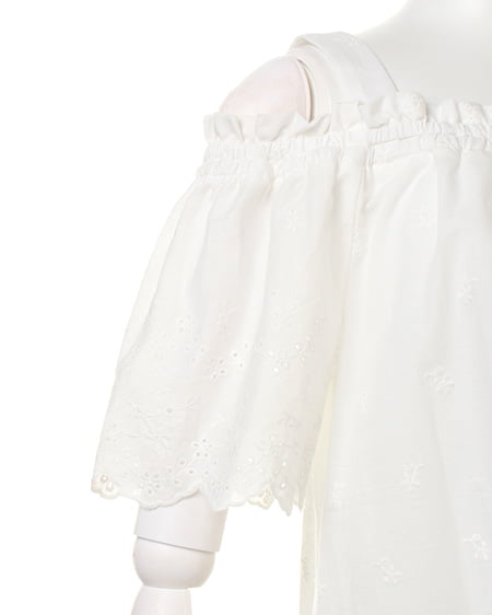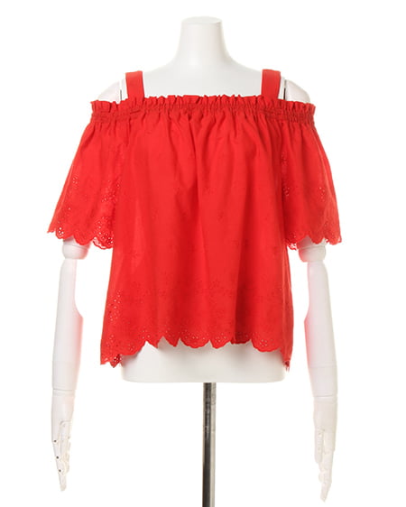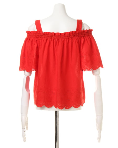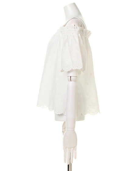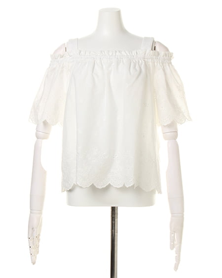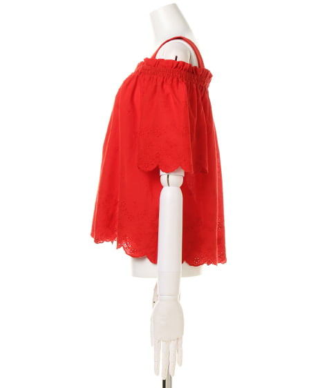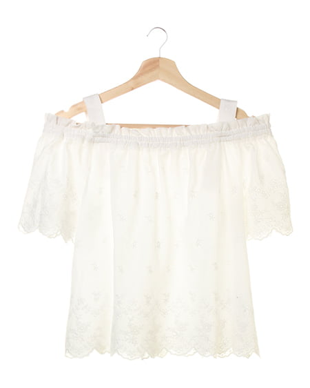 上品な肌見せバランスを叶える、オープンショルダーのトップス。今季トレンドのパンチングレースを全体に施した大人可愛い1枚。ふんわり広がる袖のフリルと、肩開きデザインが程よい甘さと女性らしい印象を与えてくれます。袖と裾がスカラップになっているのもコーデのアクセントに◎。スカートを合わせて女性らしさを引き立てたスタイリングはもちろん、あえてデニムを合わせてカジュアルに落とし込むのもオススメです。