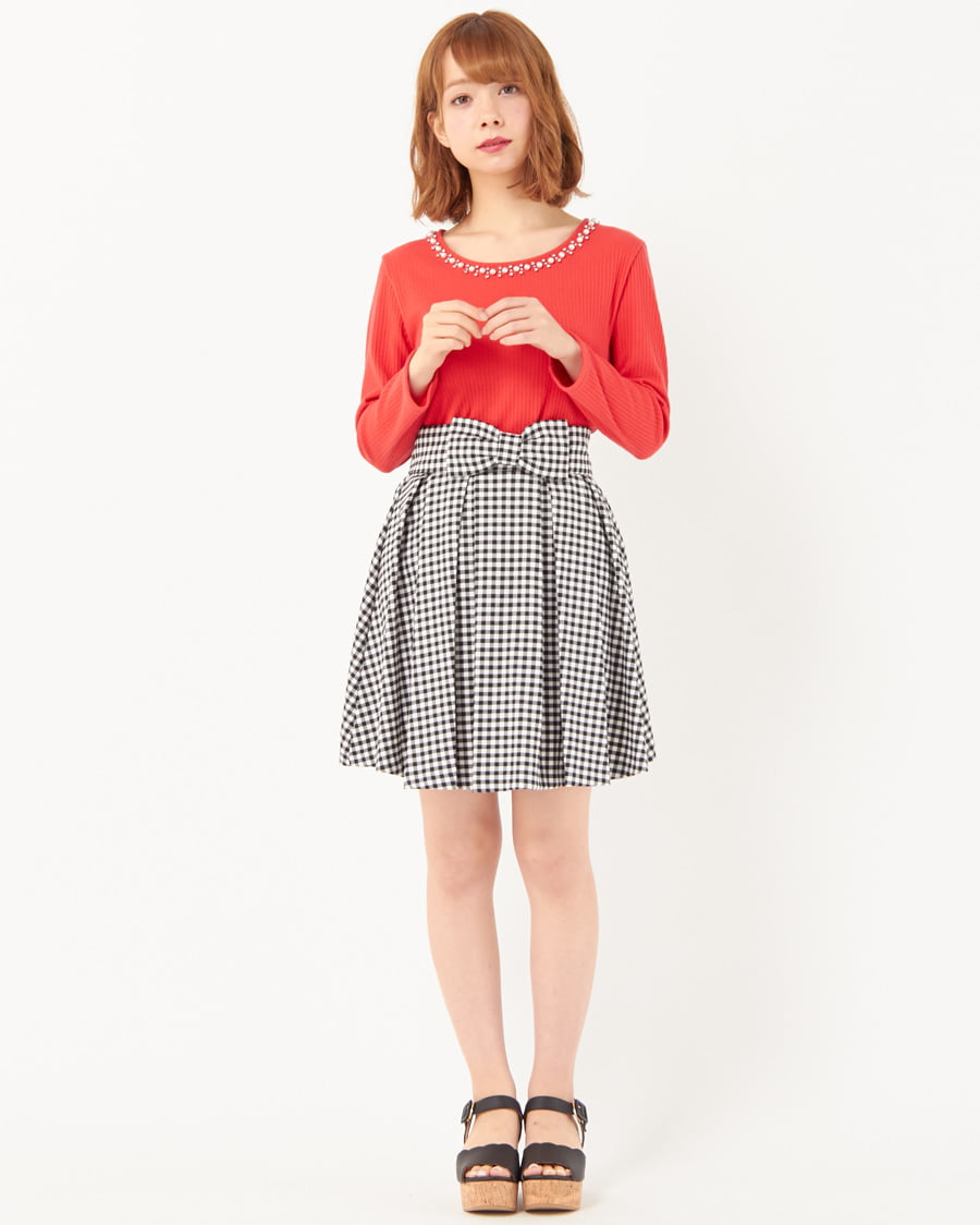 • INGNI(イング) リブ装飾クルーネック+リボンスカパン/SET アカ