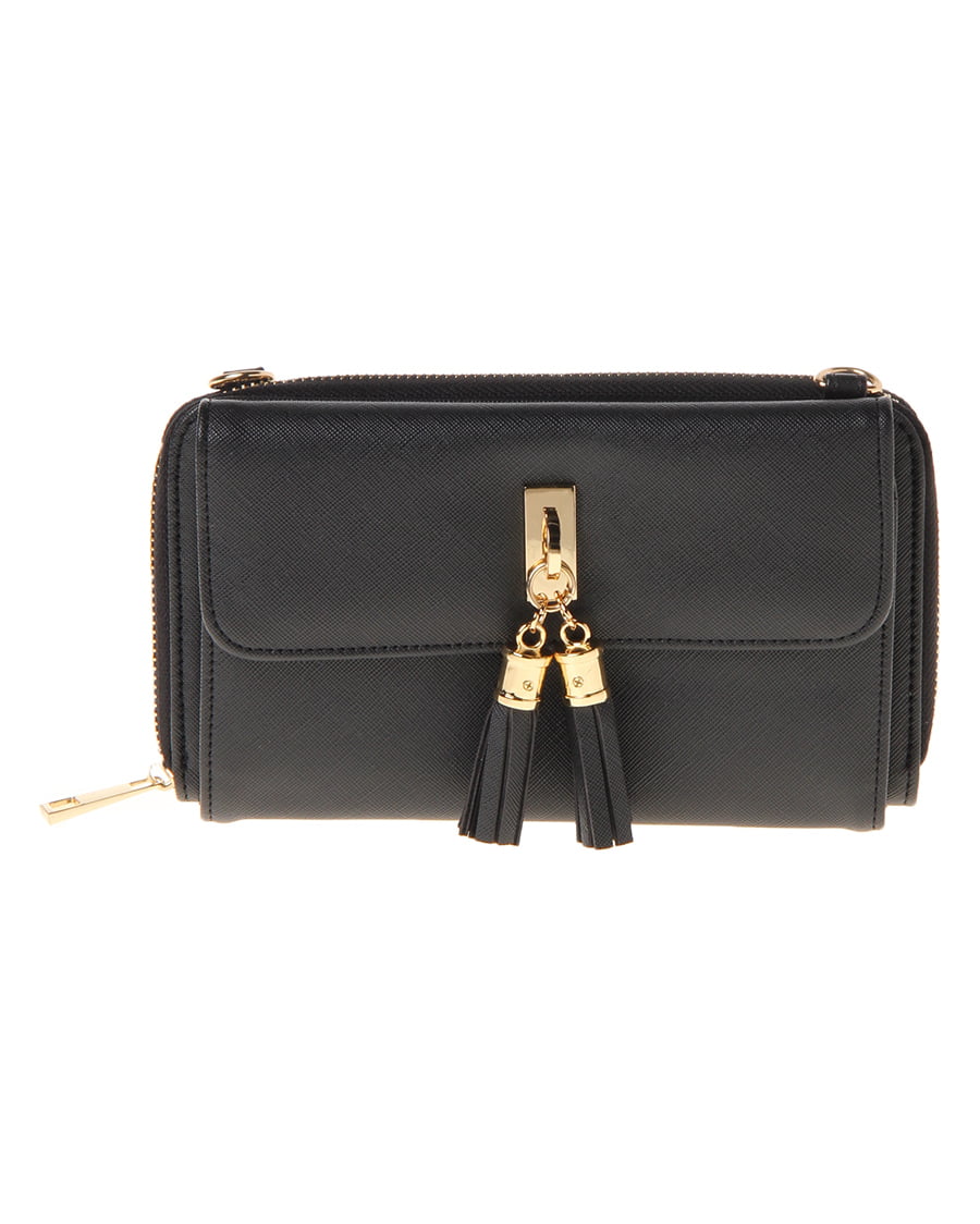 タッセルがクラシカルな雰囲気の、ウォレットショルダー。フロントのフラップデザインや、フェイクレザーの風合いがシックなアイテム。ショルダーは、着脱も調整も可能です。財布部分には、カードポケットやファスナーポケットが施された優秀アイテムです。ワンカラー仕立てで、スッキリしたフォルムの大人な一品です。