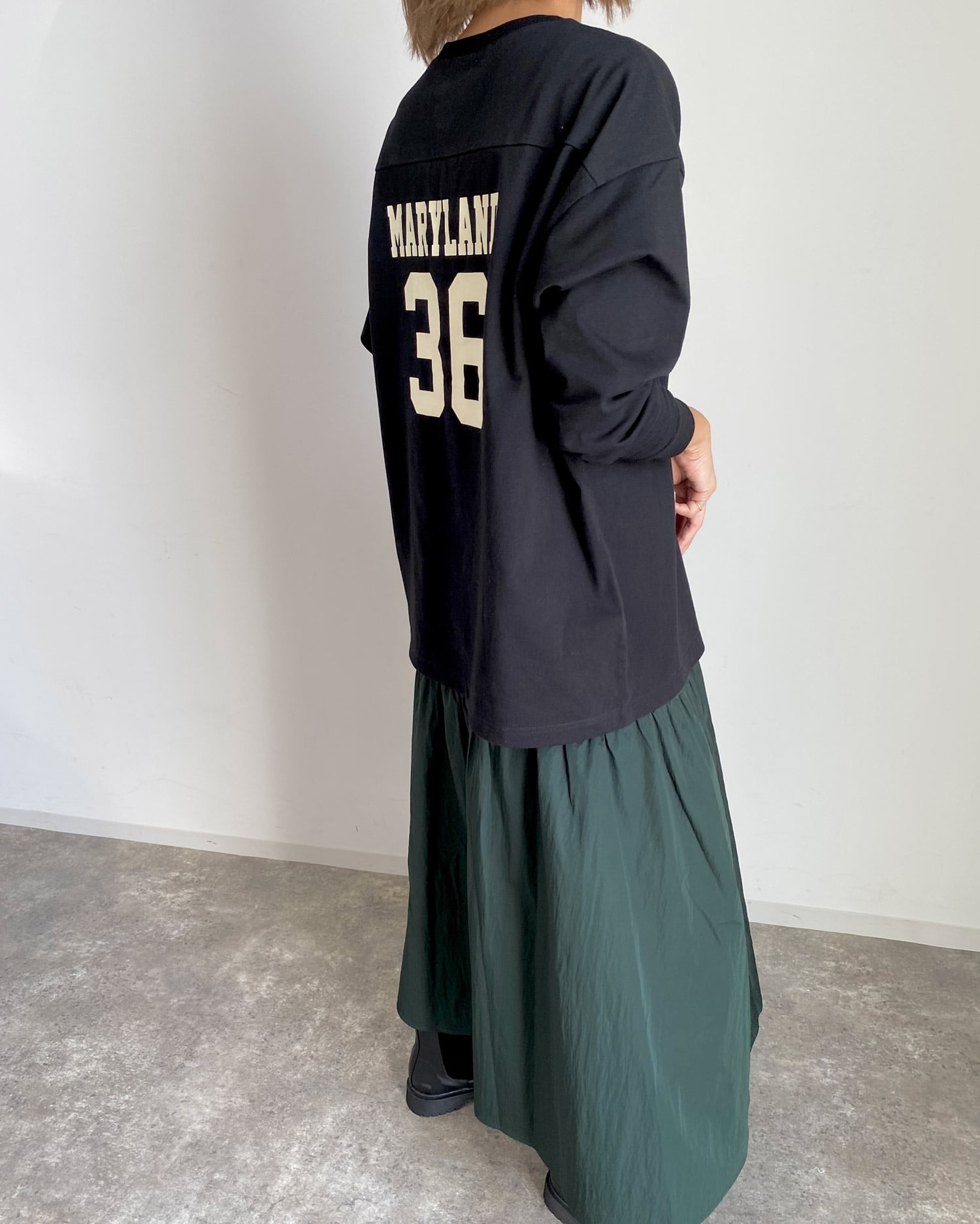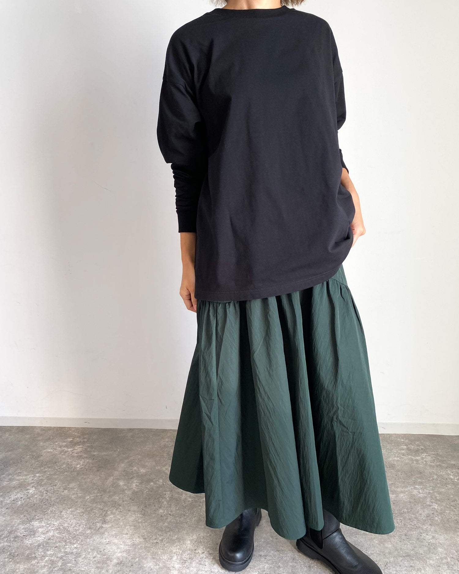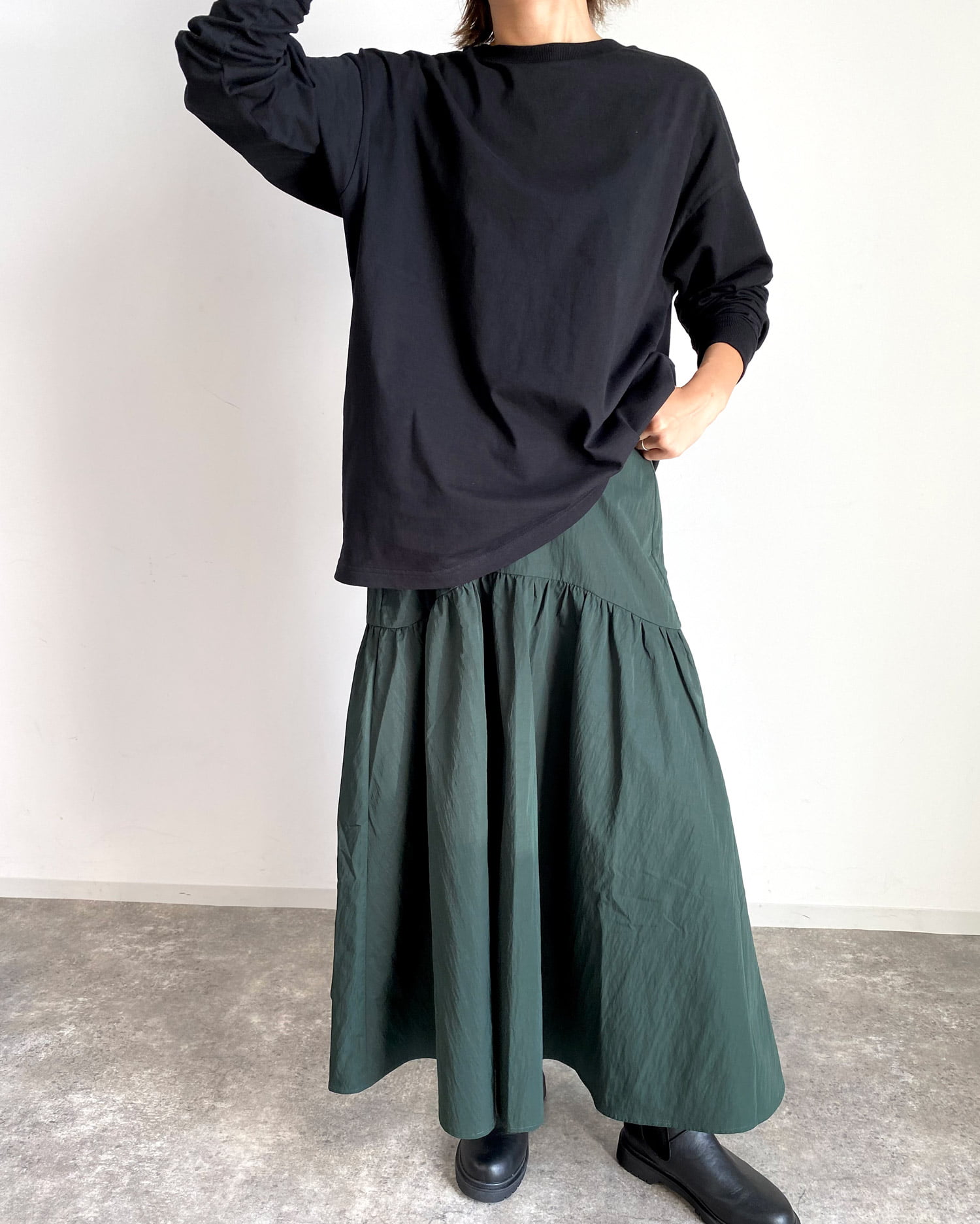 ほんのり光沢のあるナイロン混素材で仕立てたロング丈のスカート。