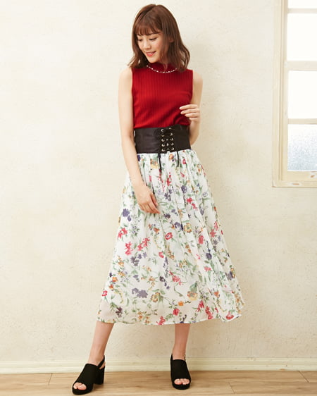 ケーブル装飾付ハイネックノースリTOPSと花柄シフォンロングスカートのSET☆