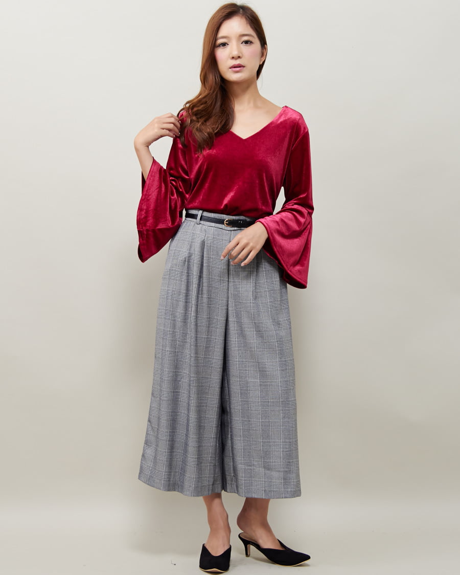 ブライトベロア袖タックフレアーTOPSとベルト付グレンチェック柄ガウチョパンツのSET☆