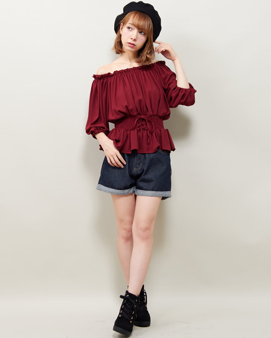 ウエストレースUPキャンディー袖オフショルTOPSとベルト付きショートパンツのSET☆