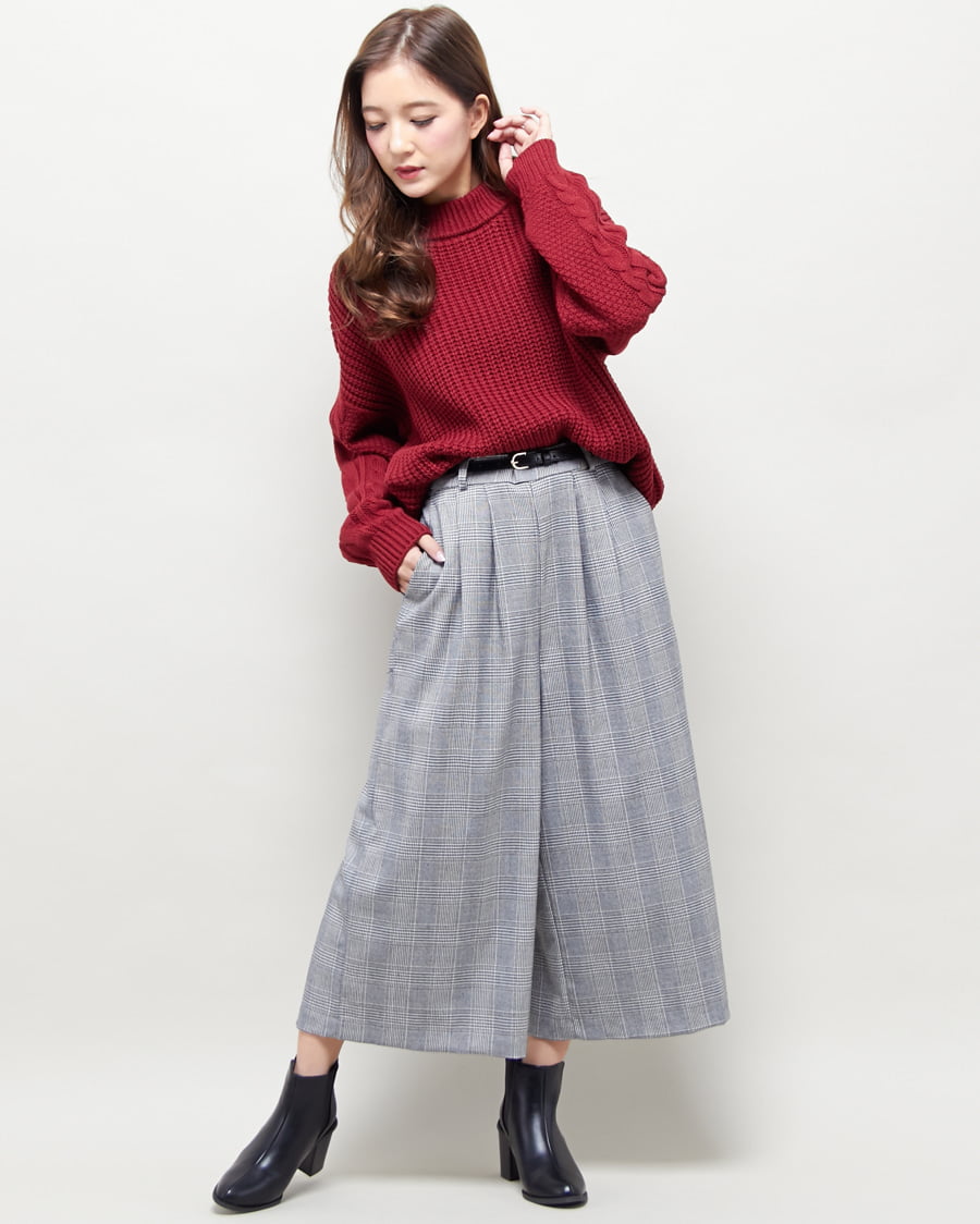 袖ケーブルプチハイネックニットとベルト付グレンチェックパンツのSET☆
