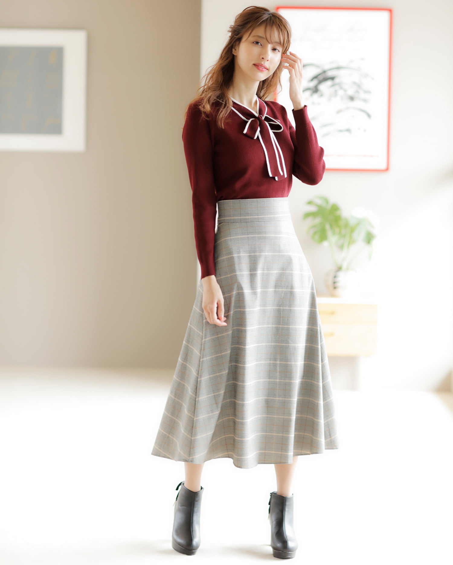 ボウタイ配色ニットとチェック柄サーキュラー/スカートのSET☆