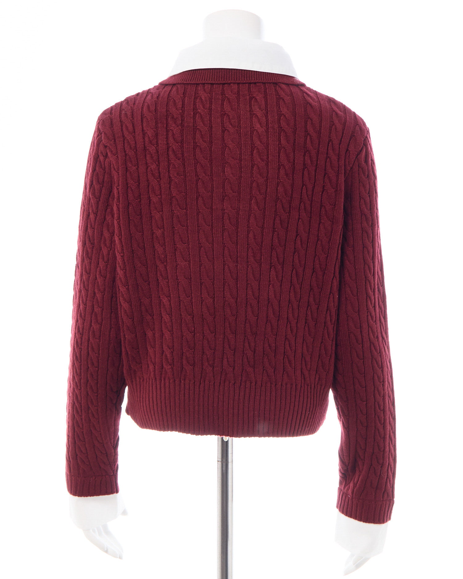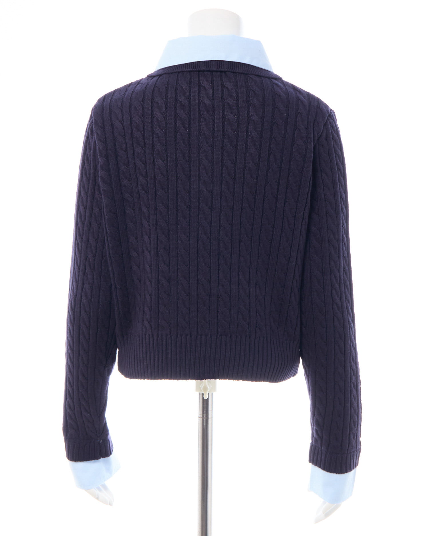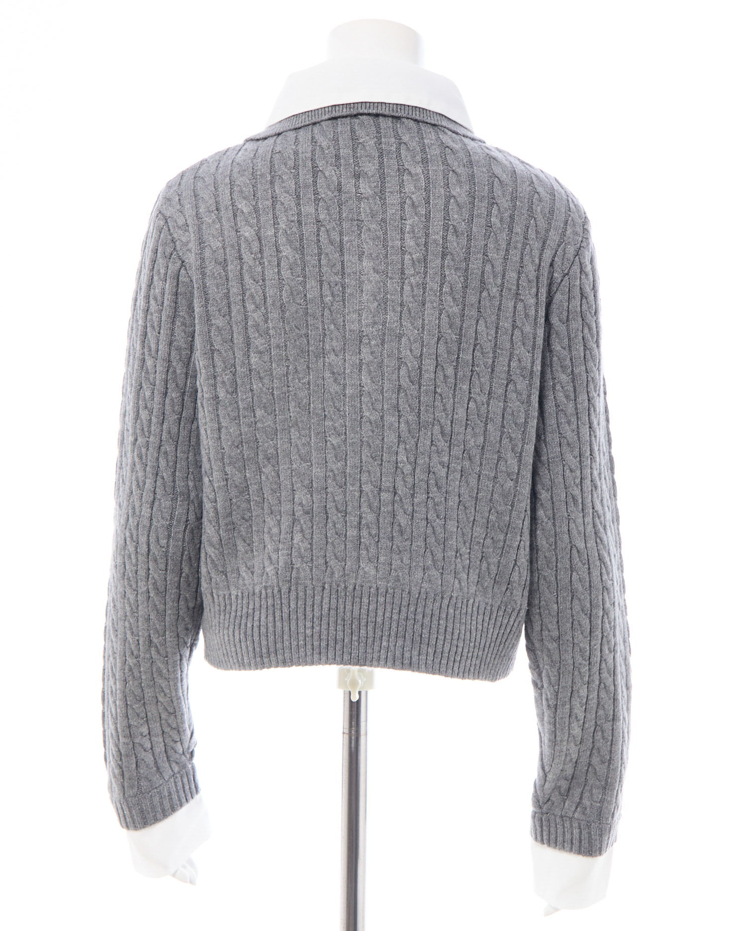 さらっとしたシャツとケーブルニットのレイヤードアイテム。