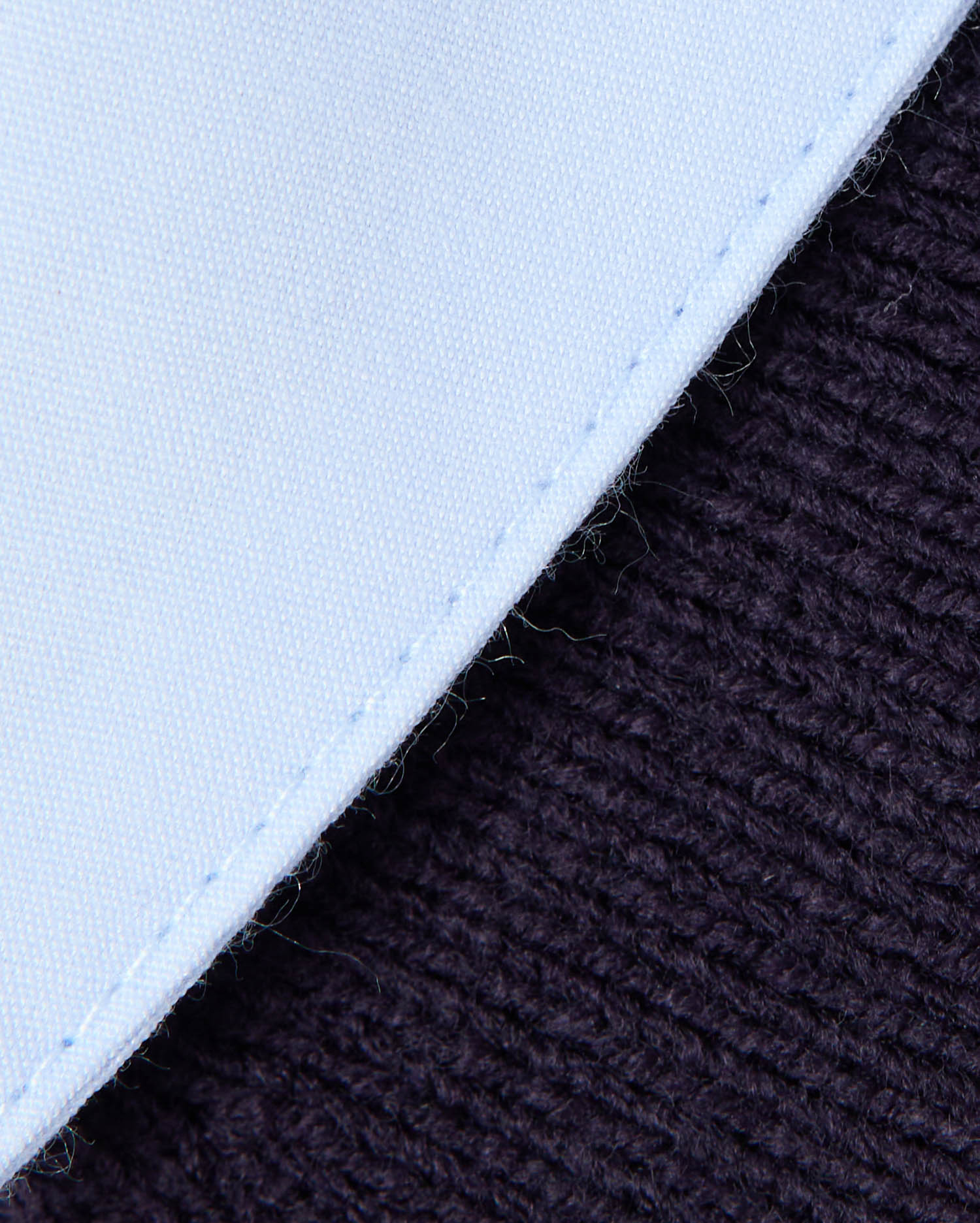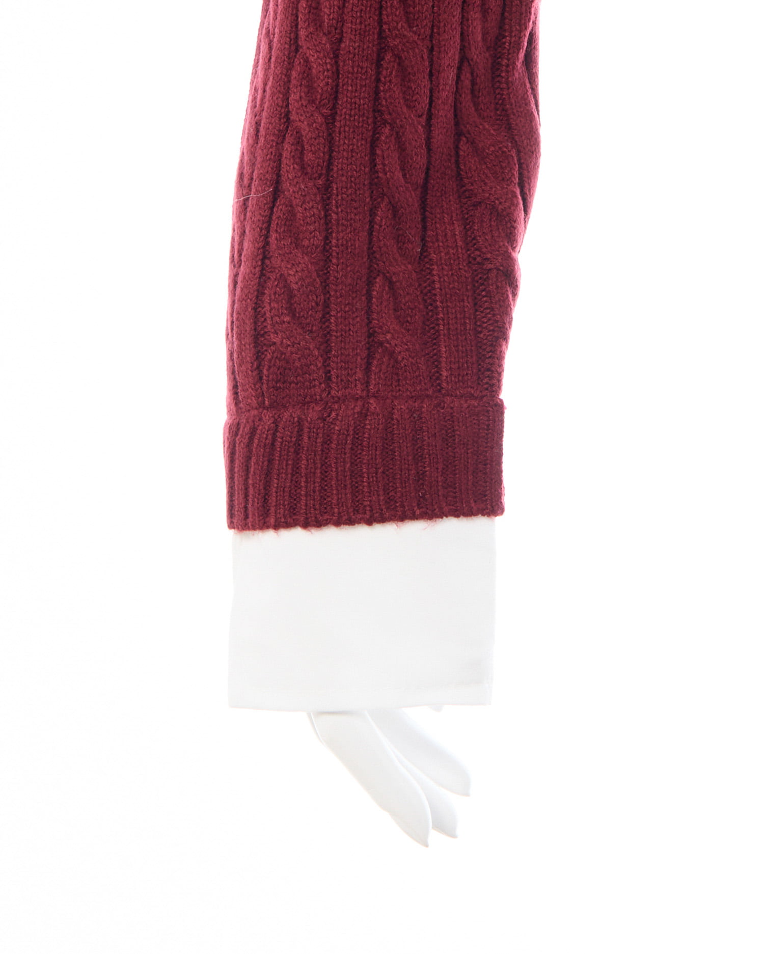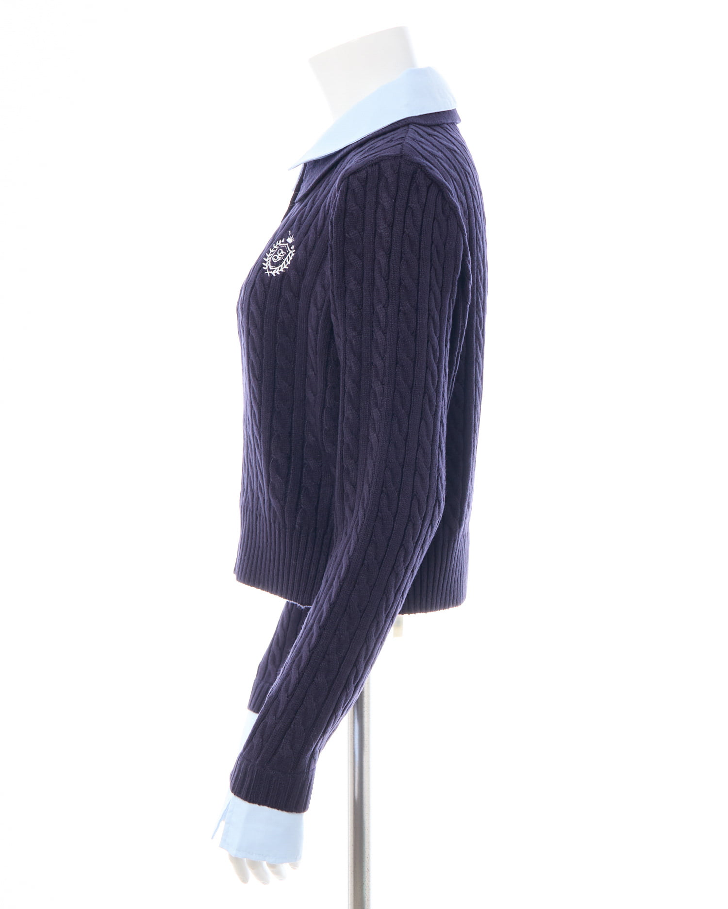 さらっとしたシャツとケーブルニットのレイヤードアイテム。