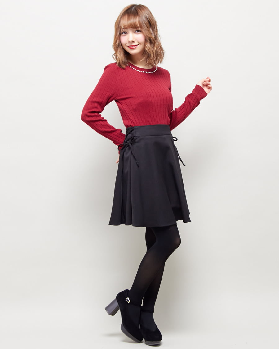 • INGNI(イング) 装飾付クルーネックニット+サイドレースUPスカパン/SET ボルドー/B