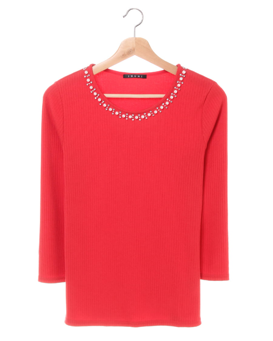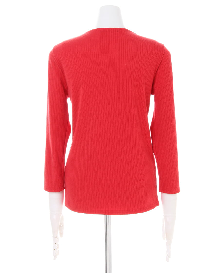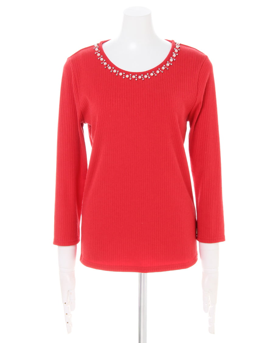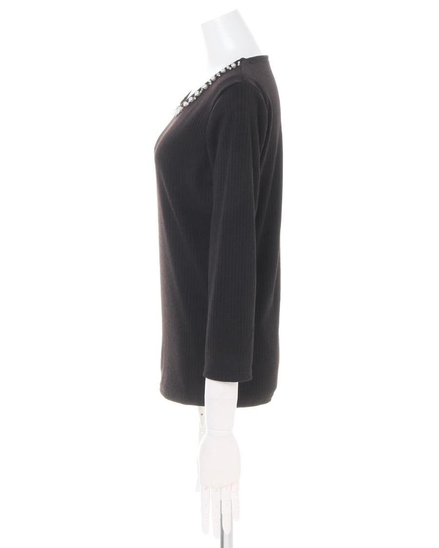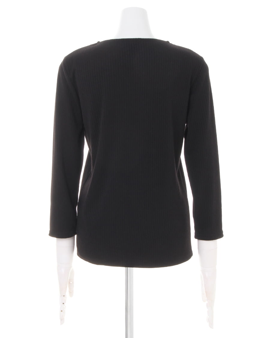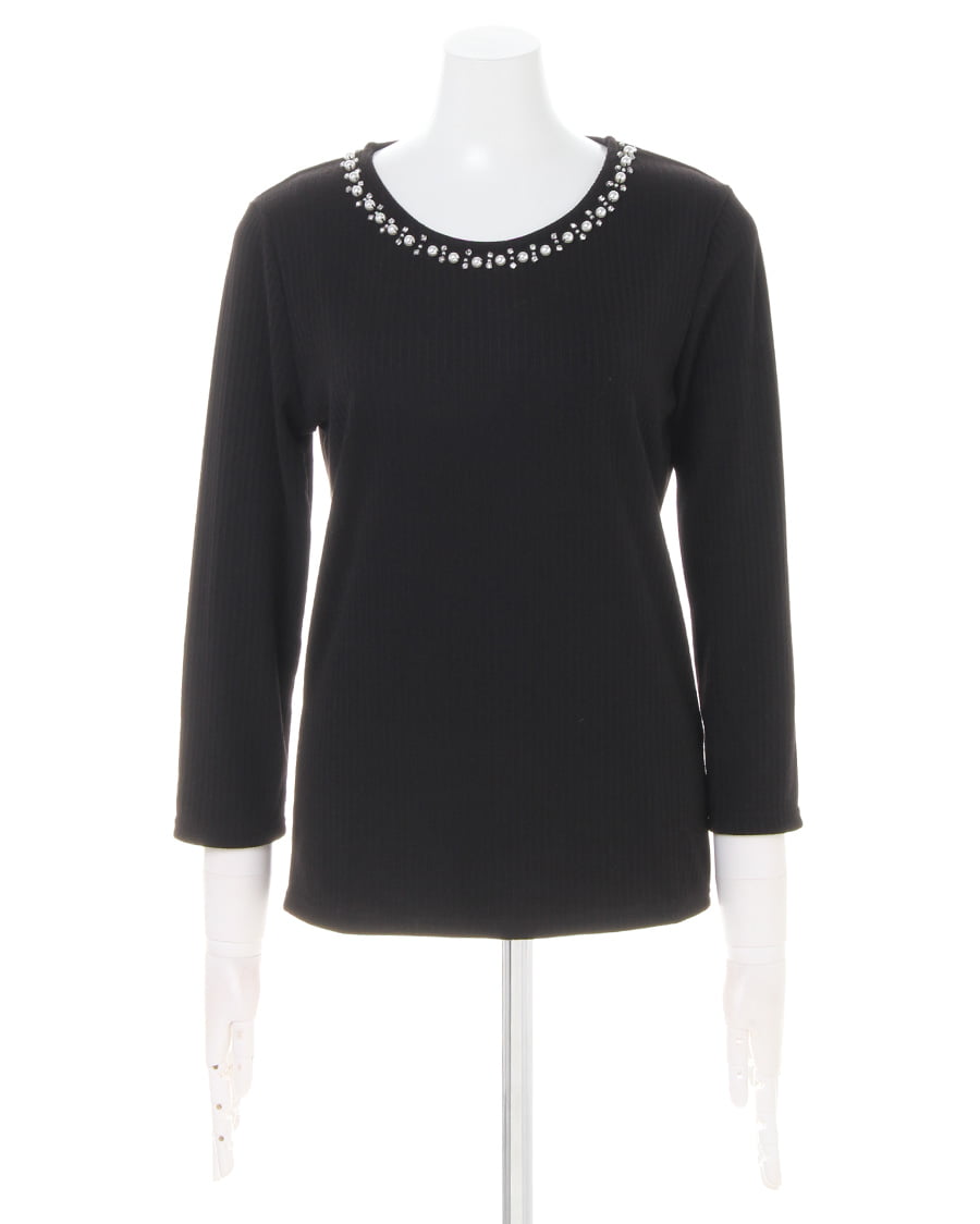 プレーンなデザインで合わせに困らない着回し力抜群なトップスは、伸縮性が高く肌馴染みのいいもっちりした素材が魅力的。リブを細く入れたことでボディラインに自然に沿い、柔らかな女性らしい雰囲気をあおります。1枚で着るのはもちろん、レイヤードスタイルにも重宝する絶妙な厚さもロングシーズン活躍するポイント。ネックラインに施した装飾がアクセサリーを合わせなくても顔周りを明るく彩ります。