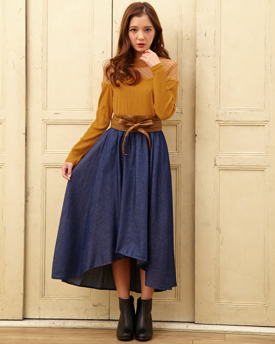 ヨークシアーチュールドットリブハイネック長袖とスエードサッシュ付イレヘムスカートのSET☆