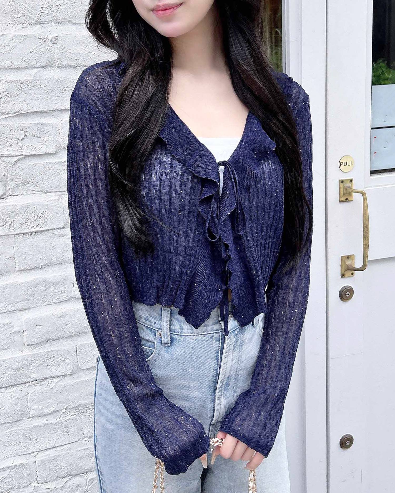 【顔回り華やかに見せるラッフル襟で可愛らしく、フェミニンさも兼ね備えた春カラーニット】