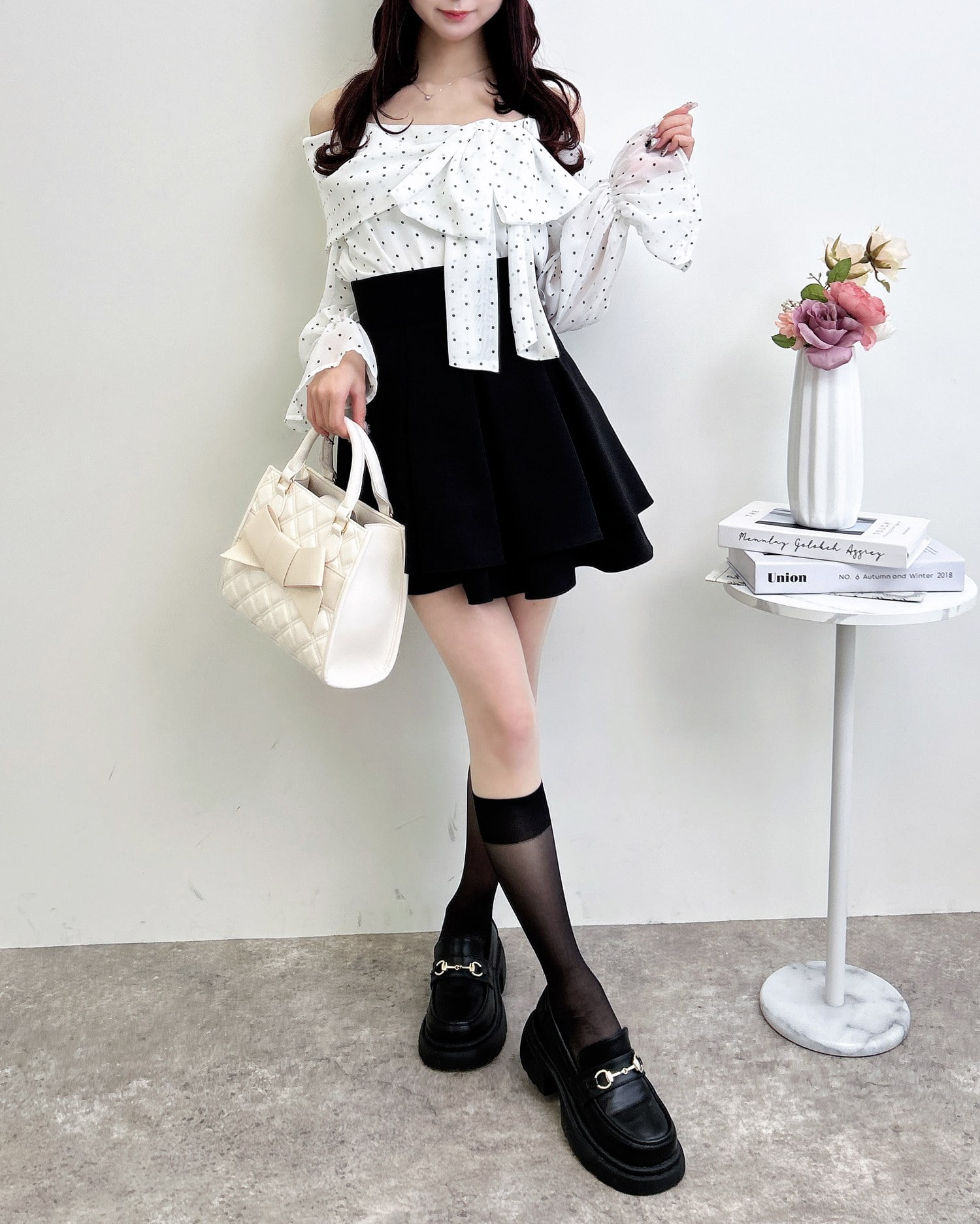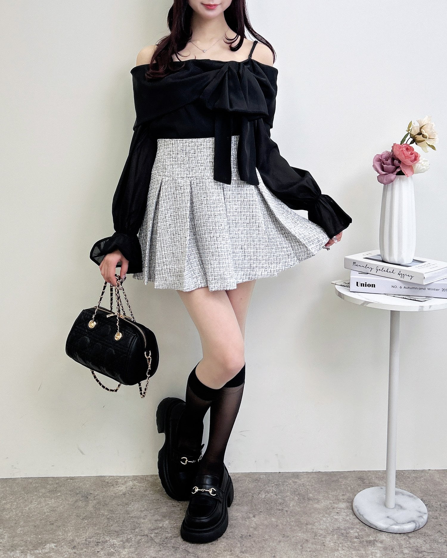 ミニスカートと合わせて、とことんガーリーなスタイリングを楽しむのも◎