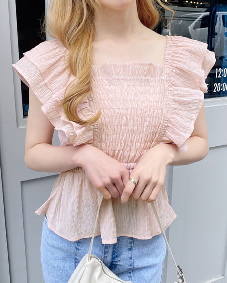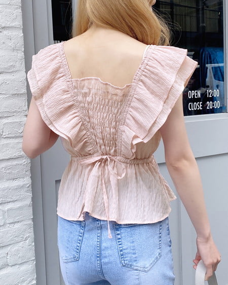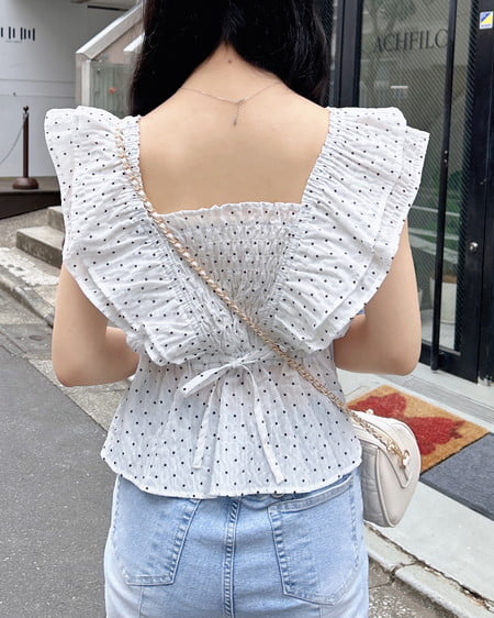 たっぷりフリルがフェミニンなノースリーブのブラウス。