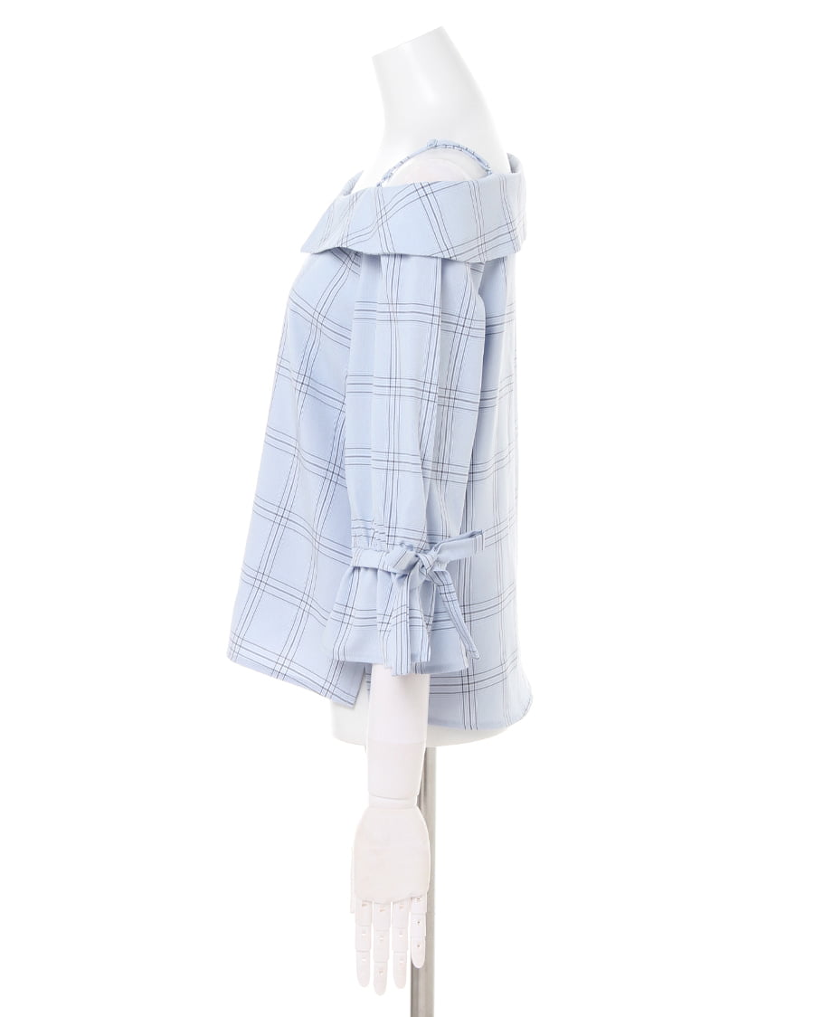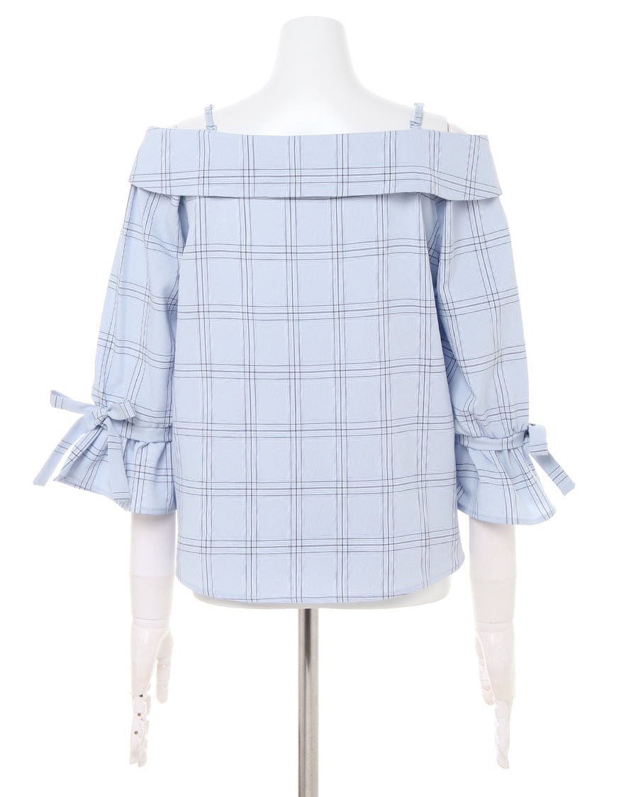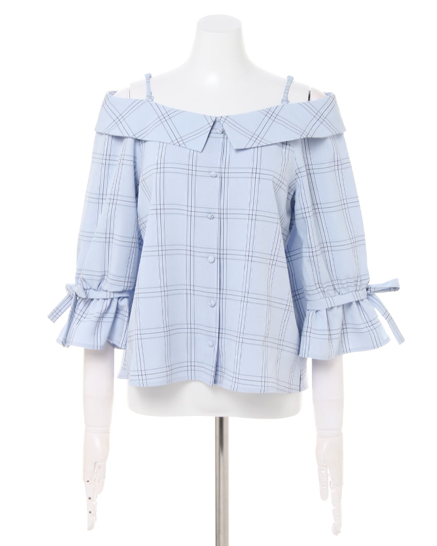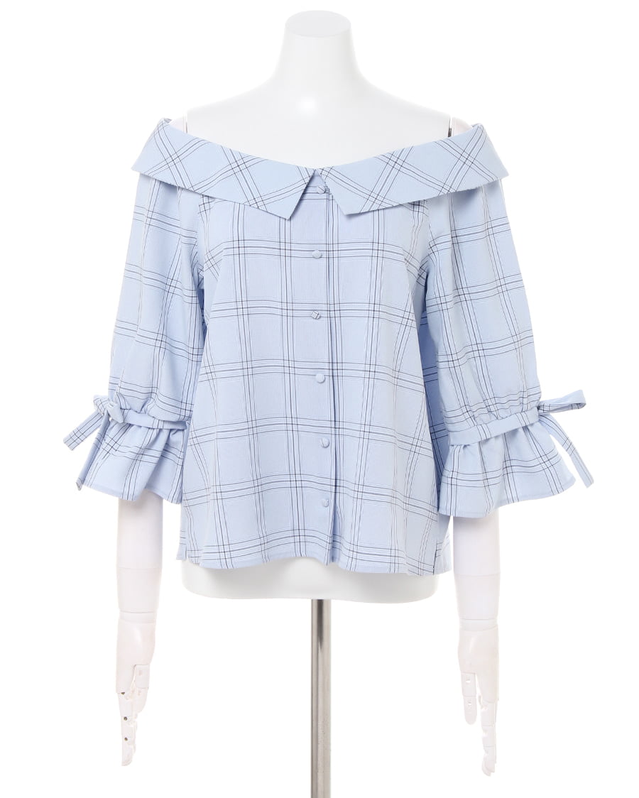 チェック柄オフショル7分袖/ブラウスと前ボタン台形スカートのSET☆