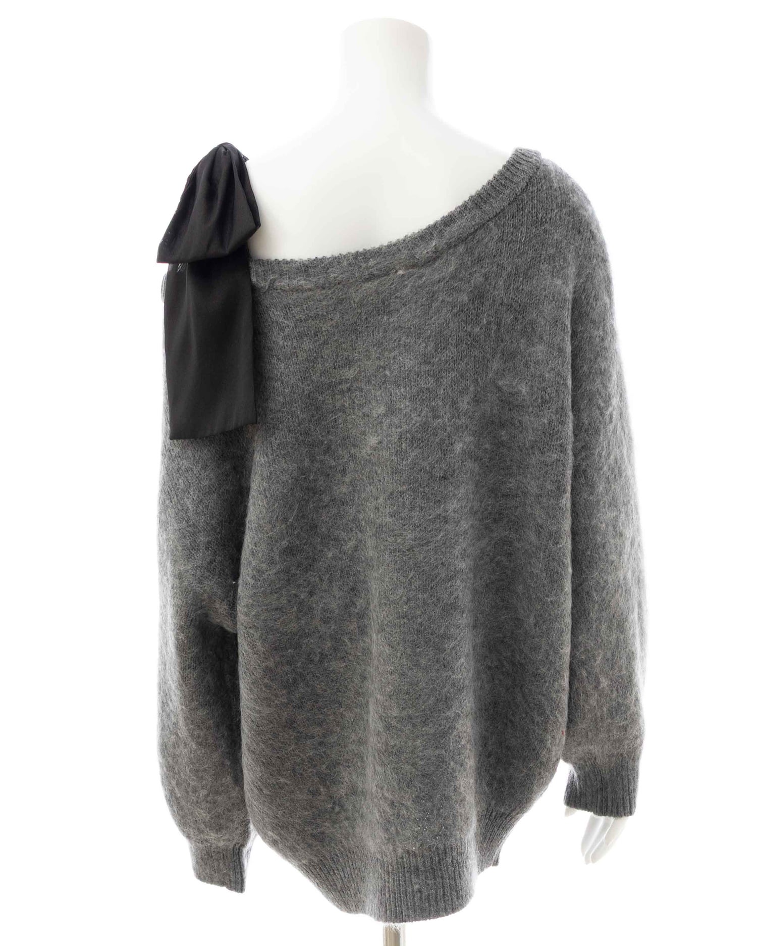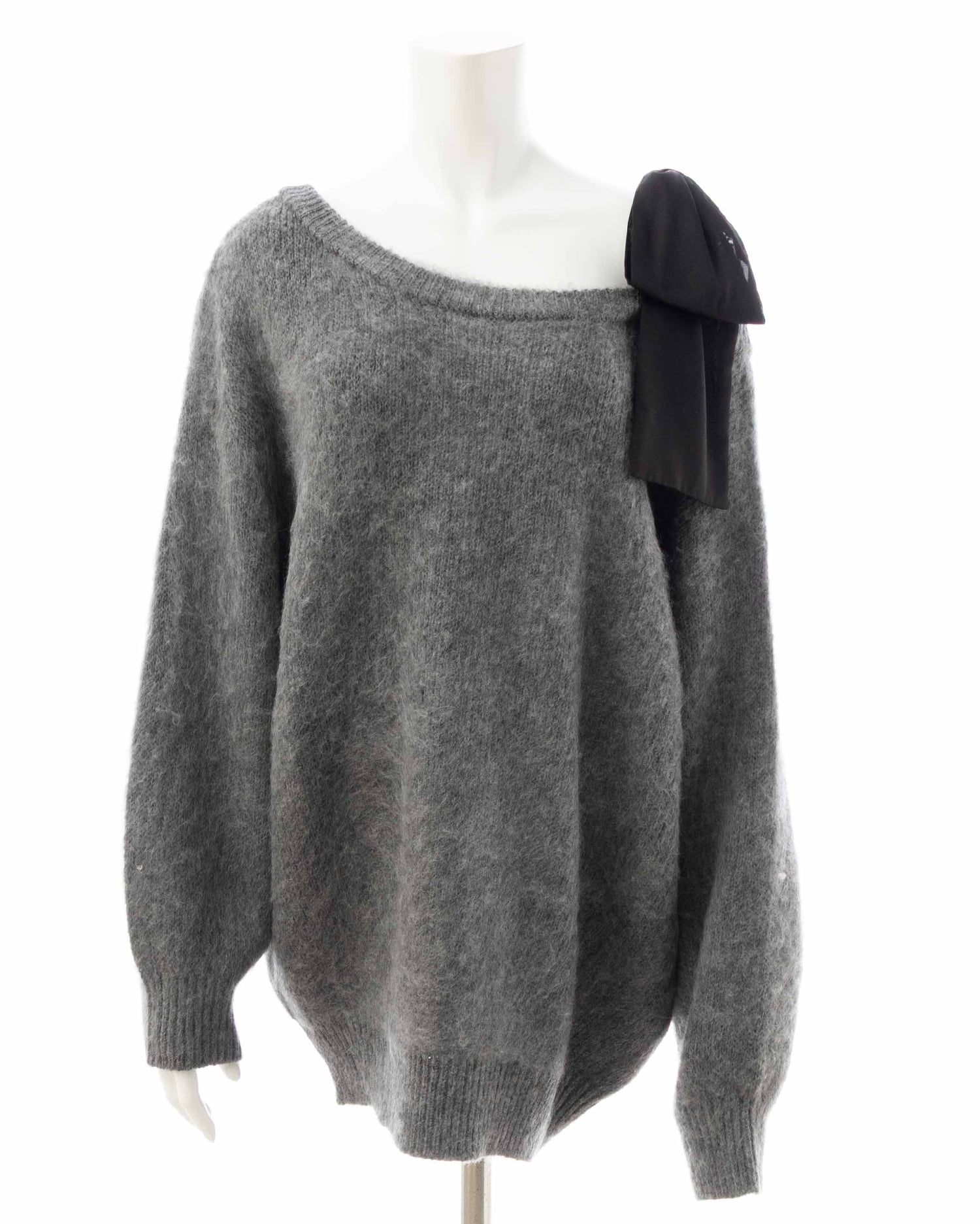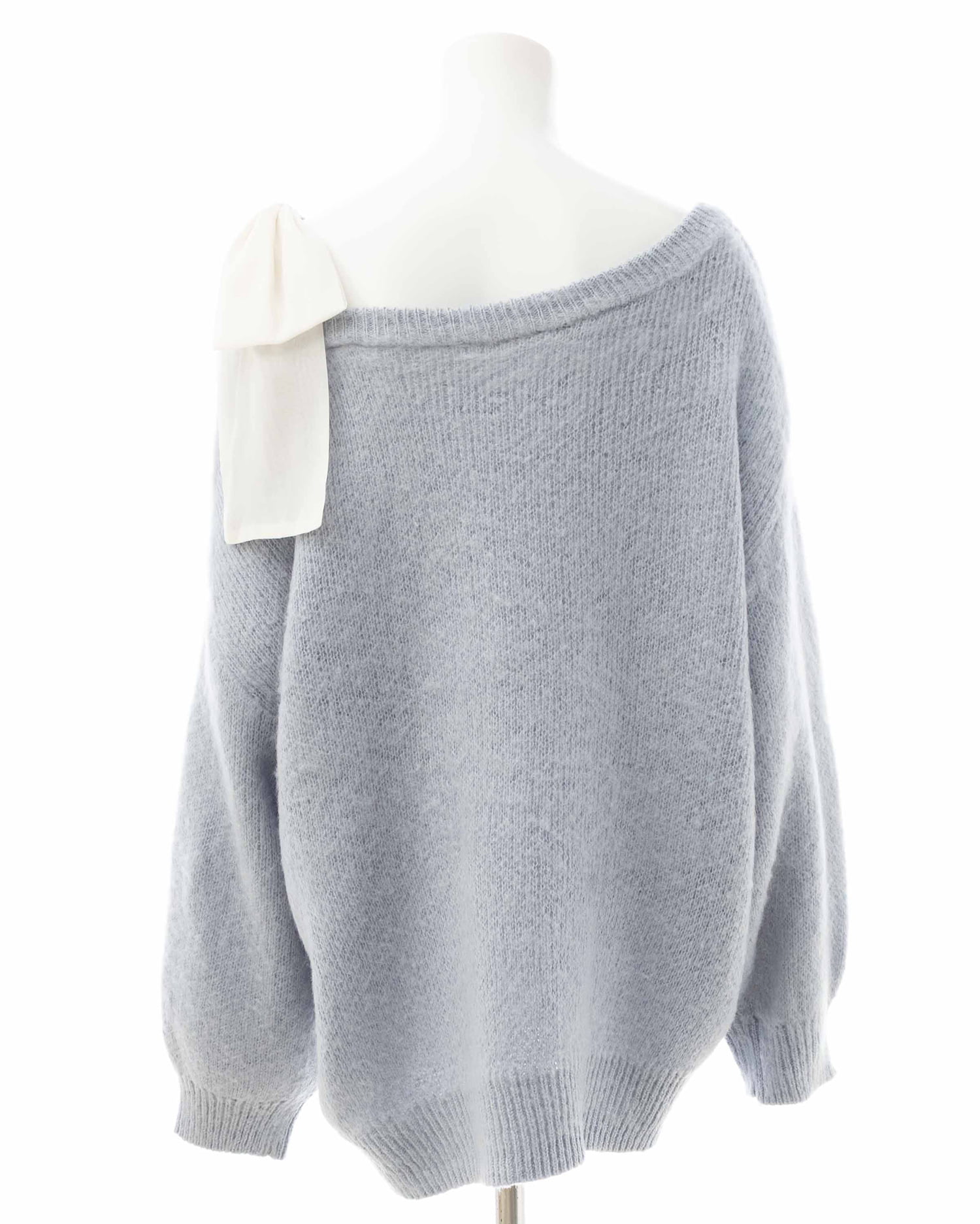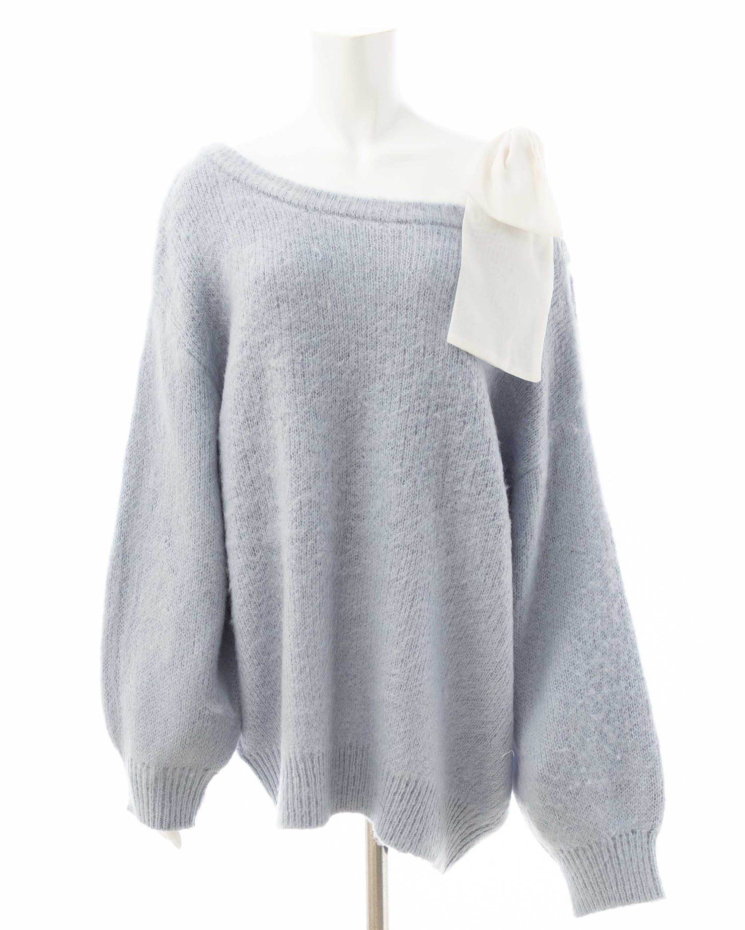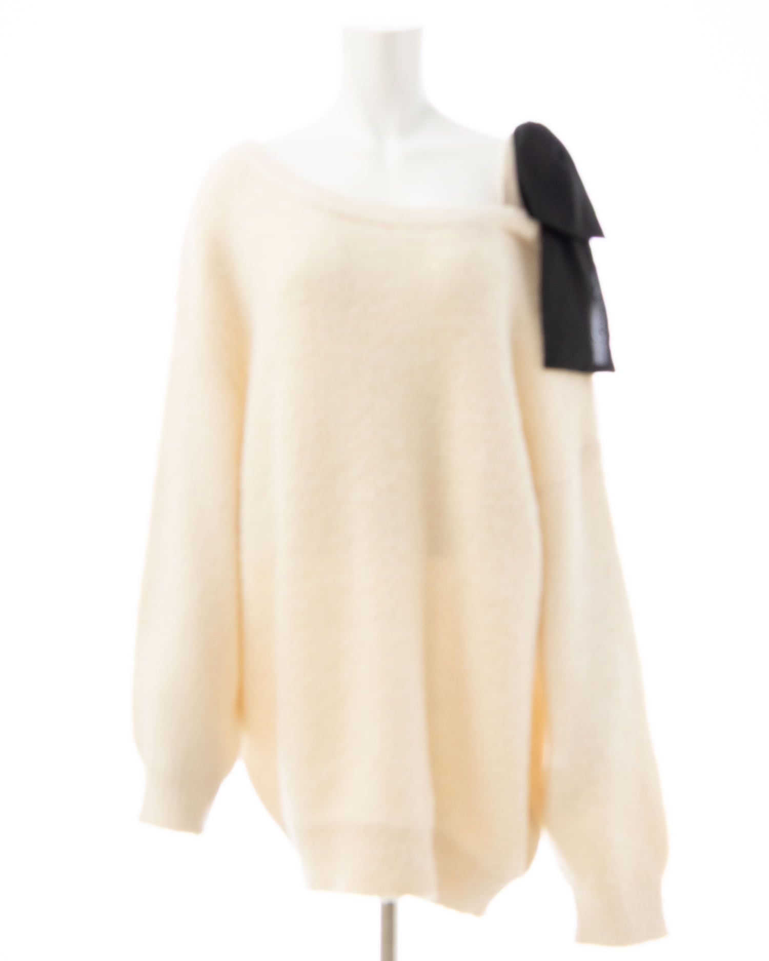1254-900343 肩リボンワンショルシャギーチュニックニット